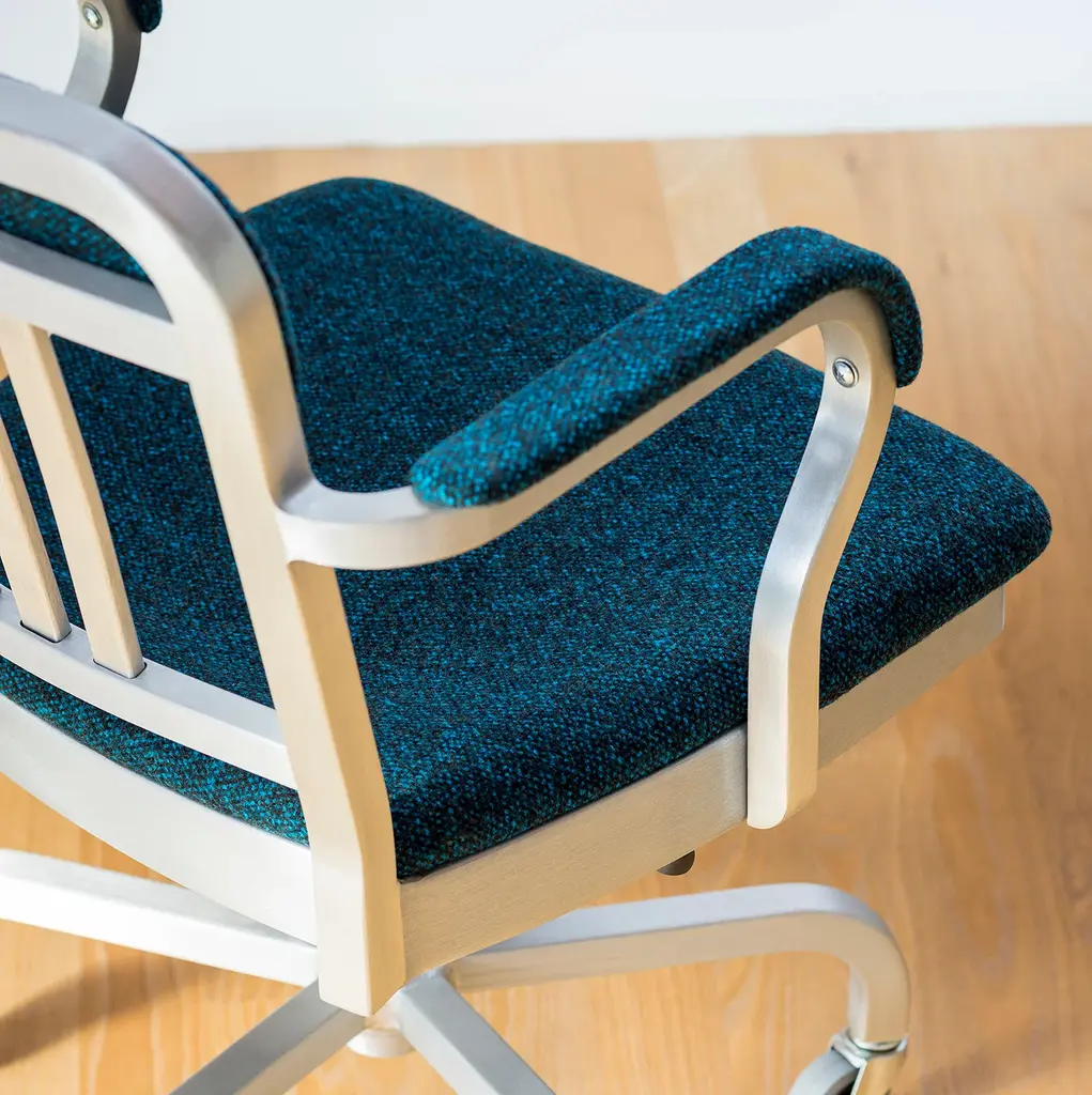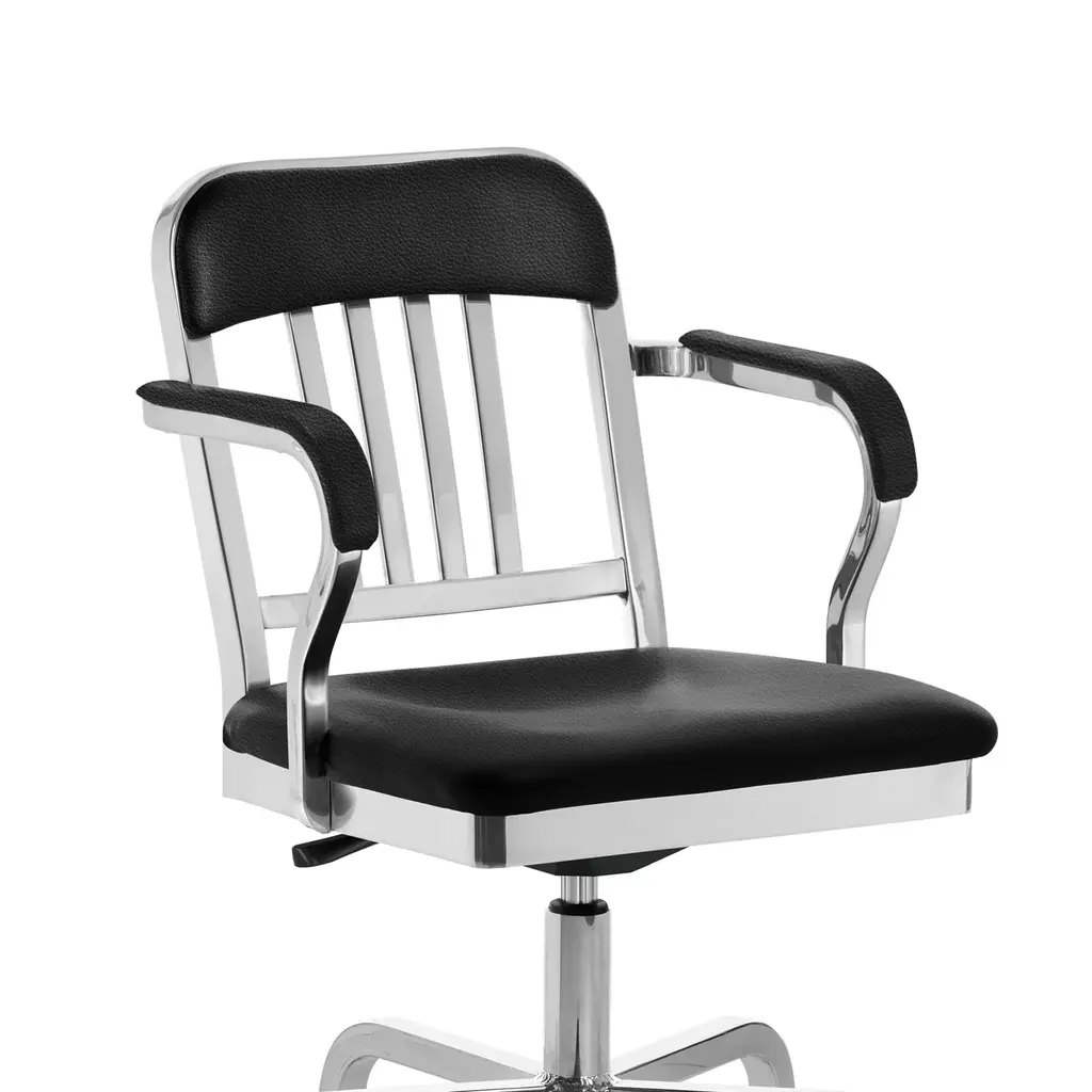 Navy Classic Semi-upholstered by Emeco, 1948 The classic semi-upholstered Navy Chair® was first introduced in 1948 when US Navy officers were redeployed off Navy Warships to land based facilities, and wanted a little more comfort than the ship board 1006 Navy Chair ® provided. Since then, the 1011 Navy swivel armchair has been used for settings where an extra level of comfort and durability is demanded. Height adjustable with a tilt mechanism to adjust the angle of the seat. Offered in black leather as standard - please contact us for custom textiles.