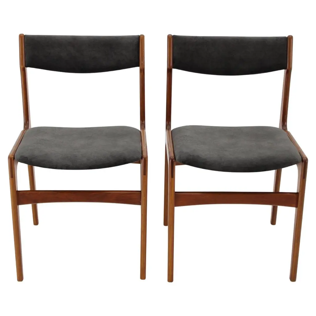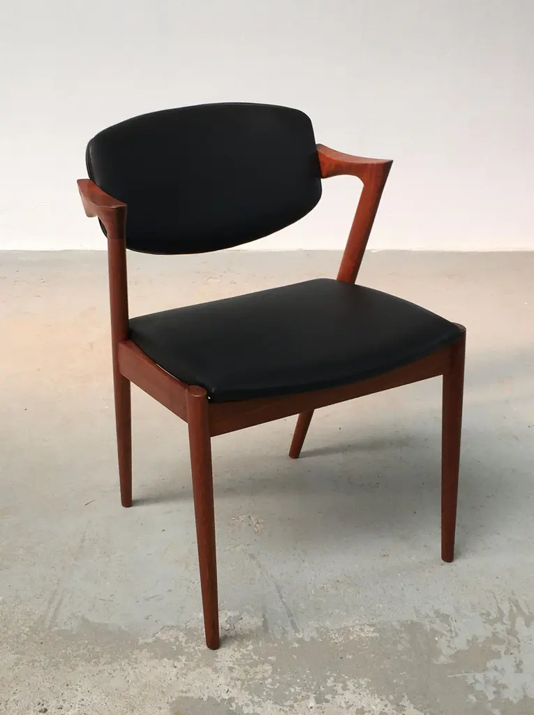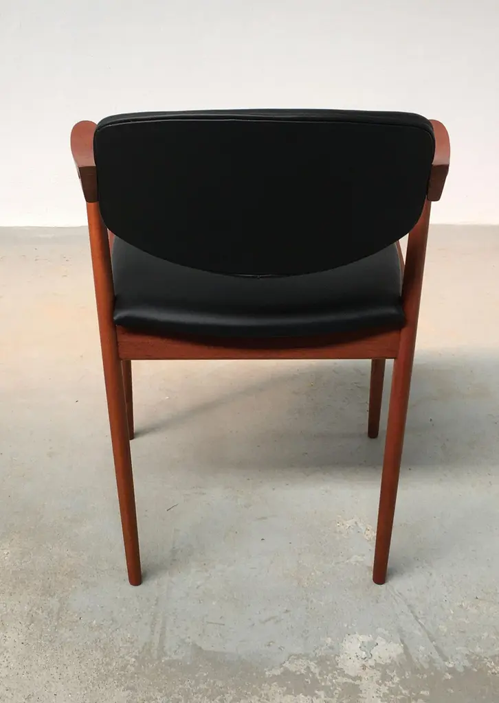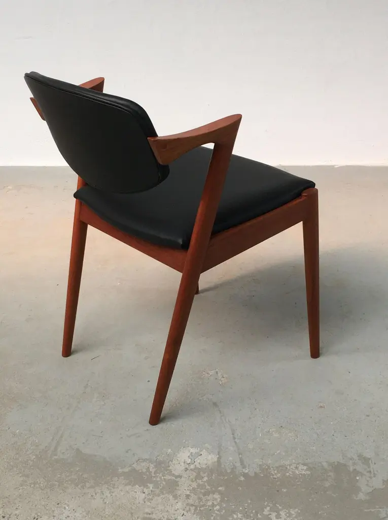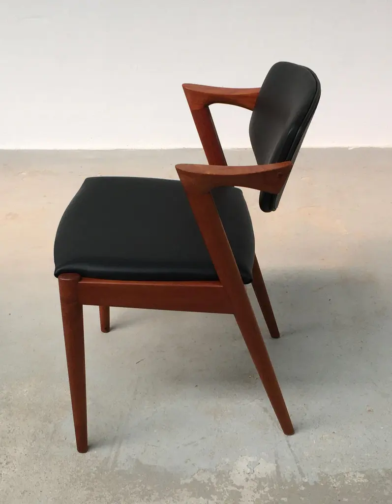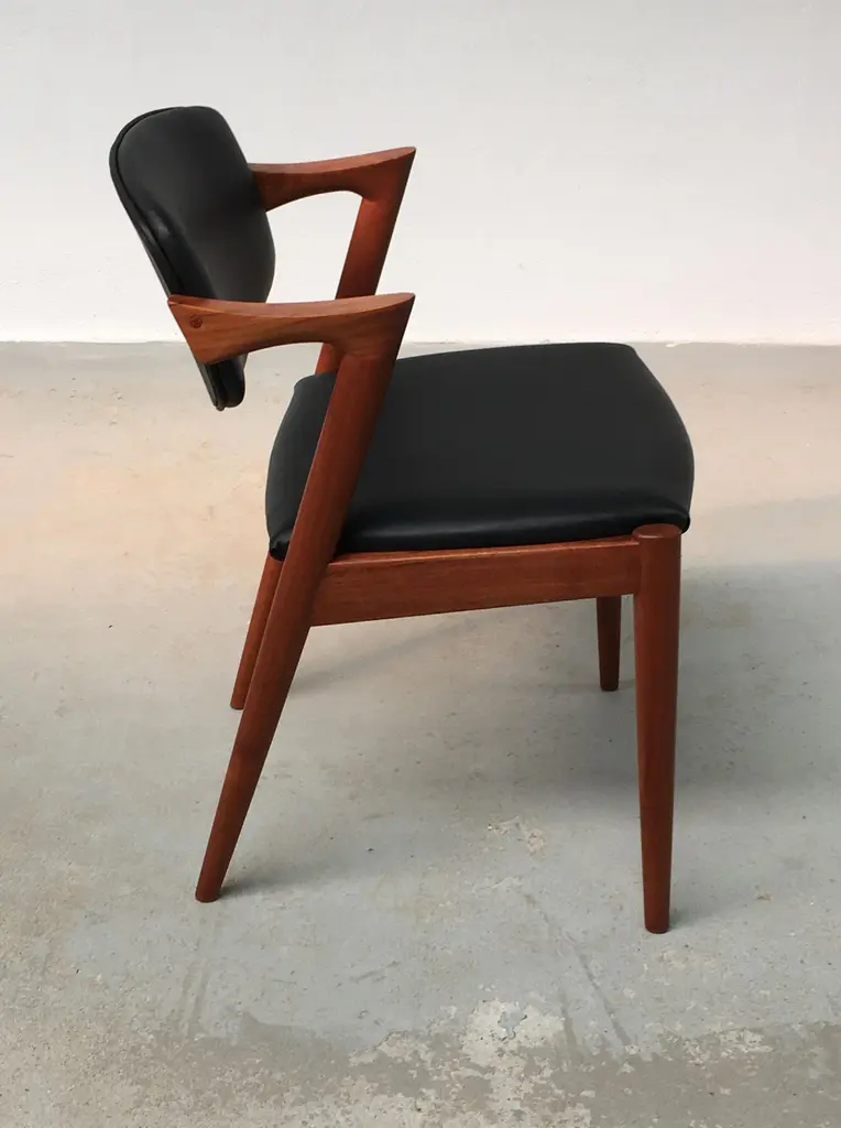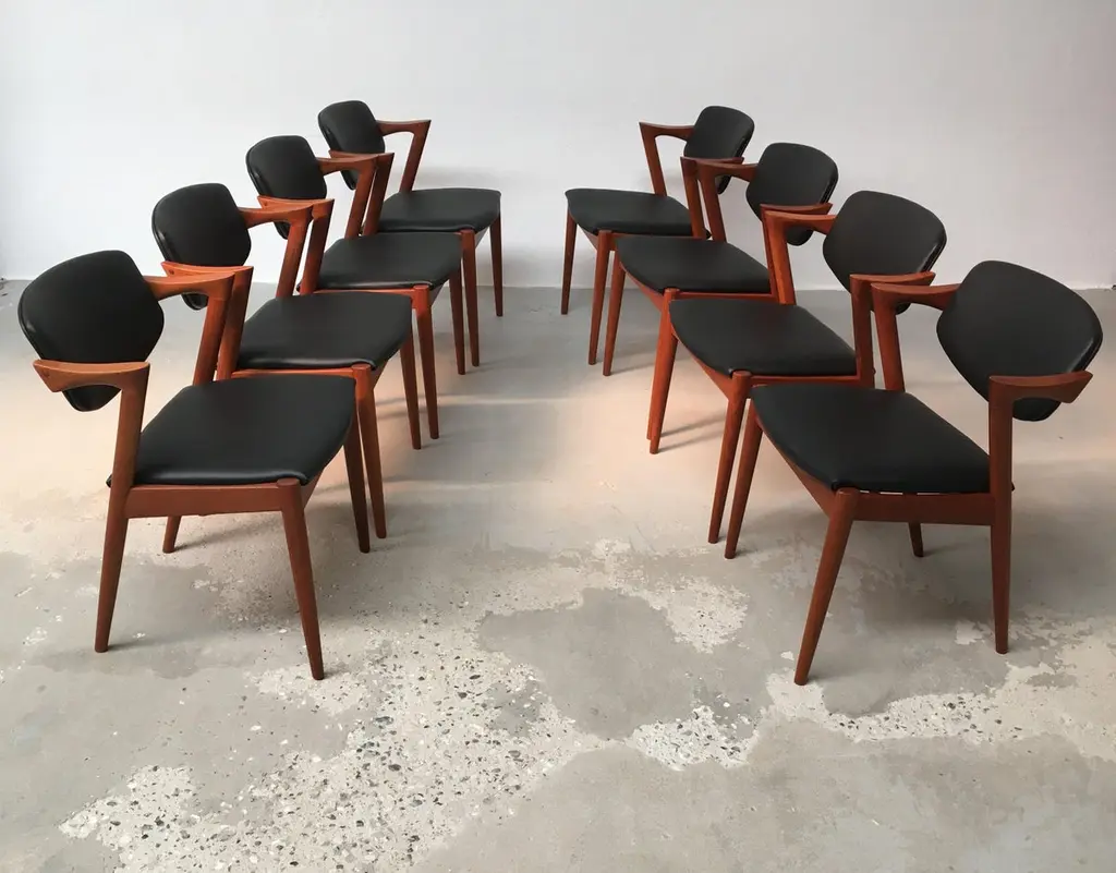 1960s Kai Kristiansen eight restored customizable model 42 teak dining chairs Set of eight fully restored, 1960s teak dining chairs Schous Møbelfabrik.The chairs have Kai Kristiansens typical light and elegant design that make them fit in easily where you want them in your home - a design that was so uniqe that his colleague the famous designer Hans J. Wegner characterized model 42 as beautiful from all angles when the chair with it´s unique backrest swivel function was revealed in 1956.The chairs are in excellent condition as they have been fully restored, all joints checked and split apart and reglued under pressure if any signs of them getting loose, All other needed repairs made, sanded by hand 2 - 3 times and vaxed 2 - 3 times by our experienced workshop to insure that they are in excellent condition with only minimal signs of age and use and will be reupholstered without additional cost in fabric from a large selection of fabrics from "Kvadrat" / "Romo" or leather from a large selection of leathers from "Sorensen Leather" / Ca-mo Leather".We can offer on request additional chairs for the size of set you wish for..Kai Kristiansen was one of the last pupils of the famous architect Kaare Klint who founded modern Danish design and laid the foundation for the "Danish Modern" style. During the years 1958-78 Kristiansen worked in his business in Aarhus owned jointly by himself and furniture maker Illum Wikkelsø (1919-99). Kristiansens works met their most intense demand during a few decades from 1950, then production of them was discontinued. However, several of them are now being produced again by the Japanese furniture producer Miyazaki Chair Mill in Tokushima. An Australien producer has also included Kristiansen production in their portfolio. Kai Kristiansen might have been the originator of mass produced furniture, had he accepted an offer from Ikea-founder Ingvar Kamprad. He declined to let himself enroll in the Ikea staff.Kristiansen exhibitions include numerous participations in furniture and design shows in Milano, Paris, Cologne and London. Among his most cherished works is the Paper Knife collection, including two sofas, a coffee table and an armchair. His 4110 og Handy chairs are also widely sold. In fact, the Kai Kristiansen name is probably better known by a selected global furniture design public than it is known generally in his home country.