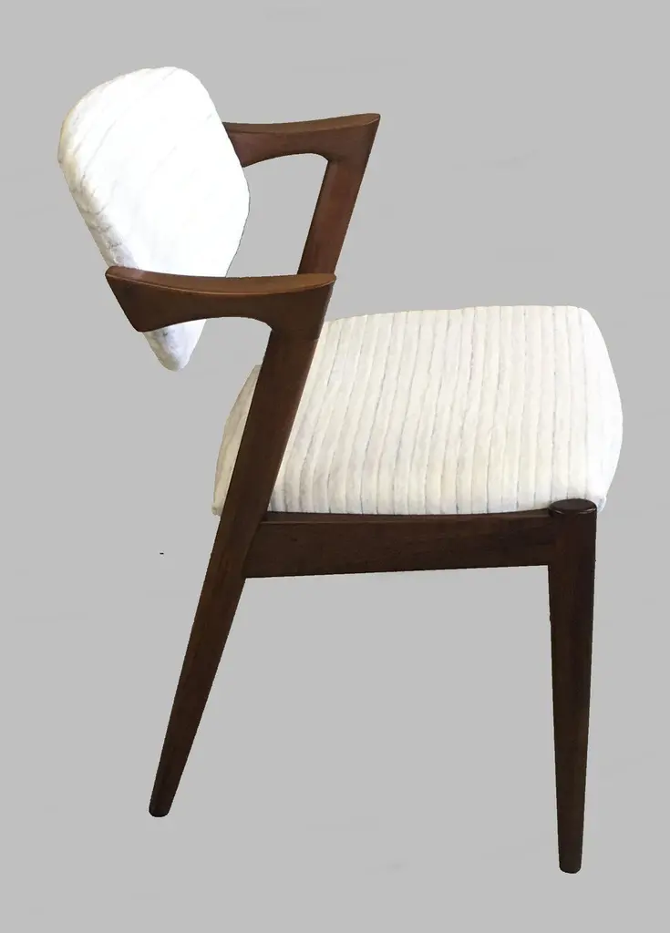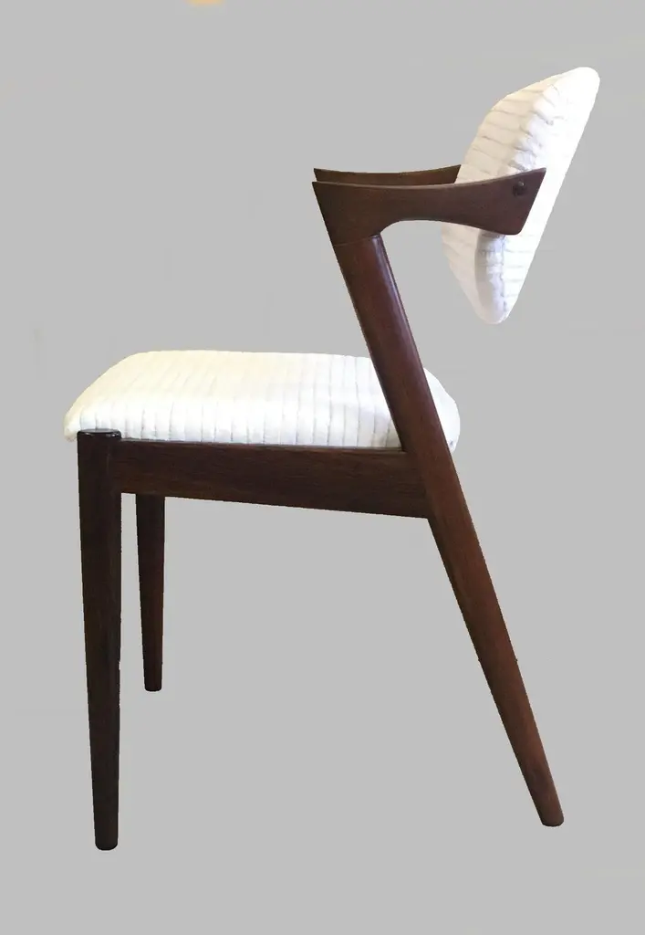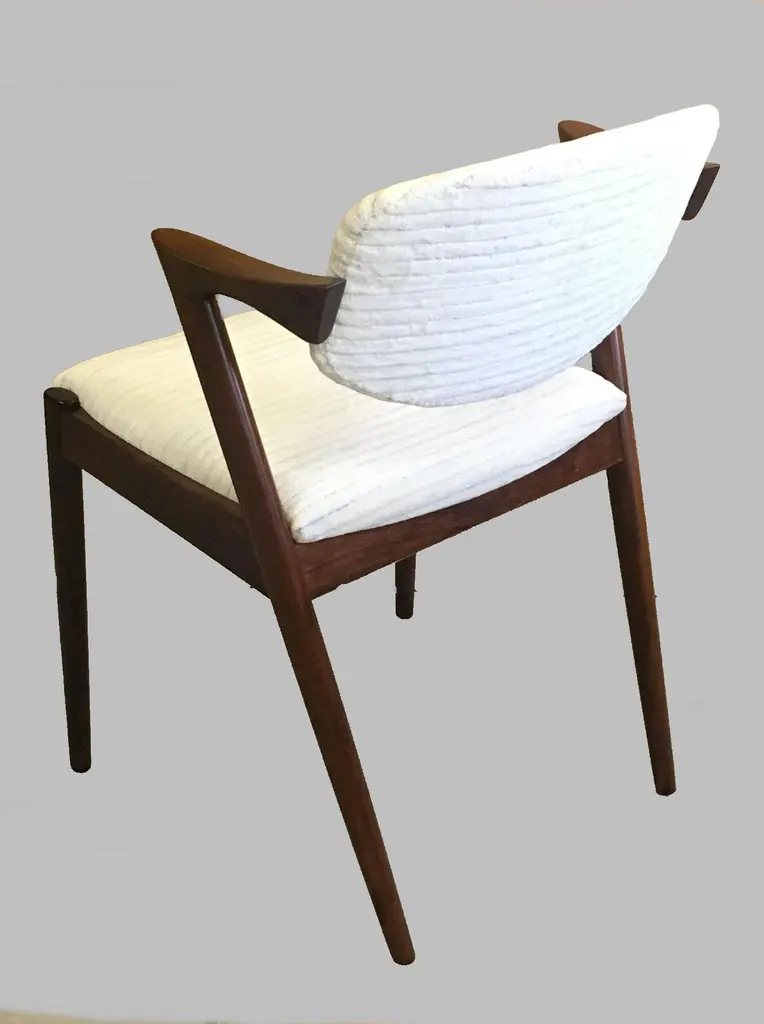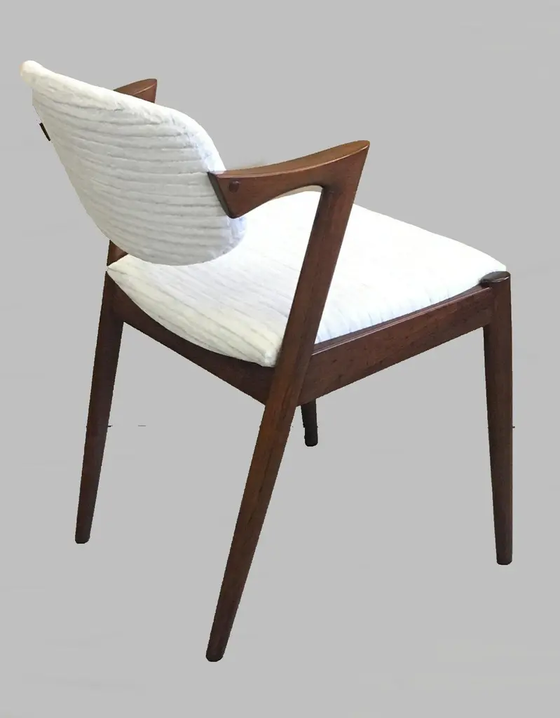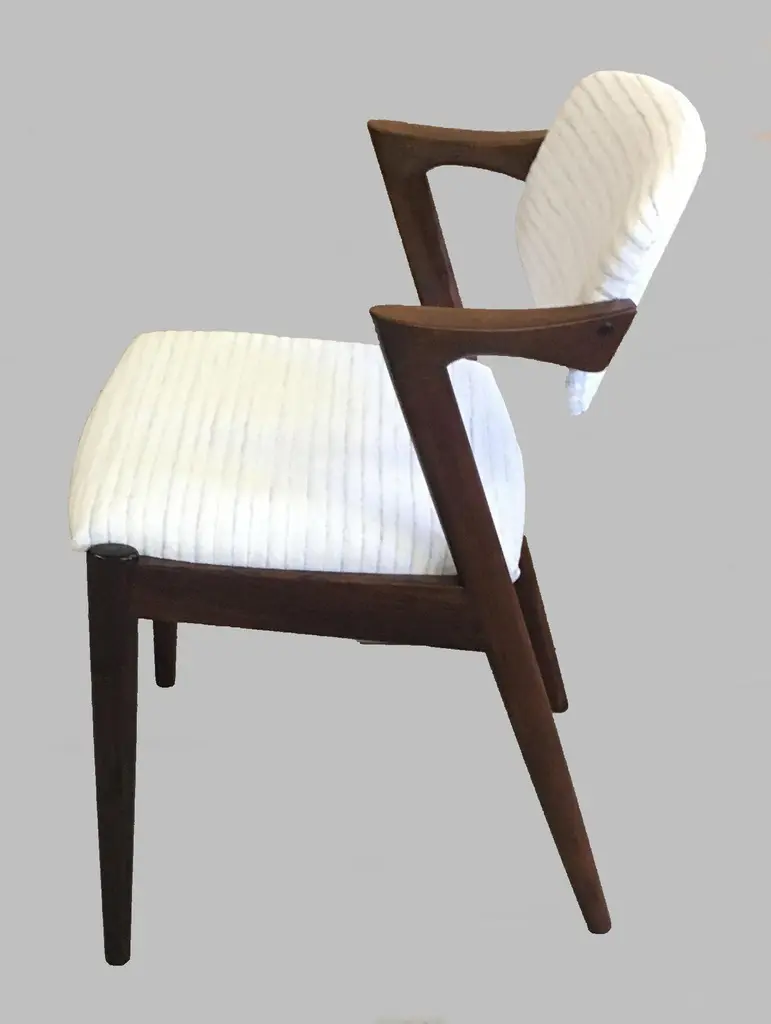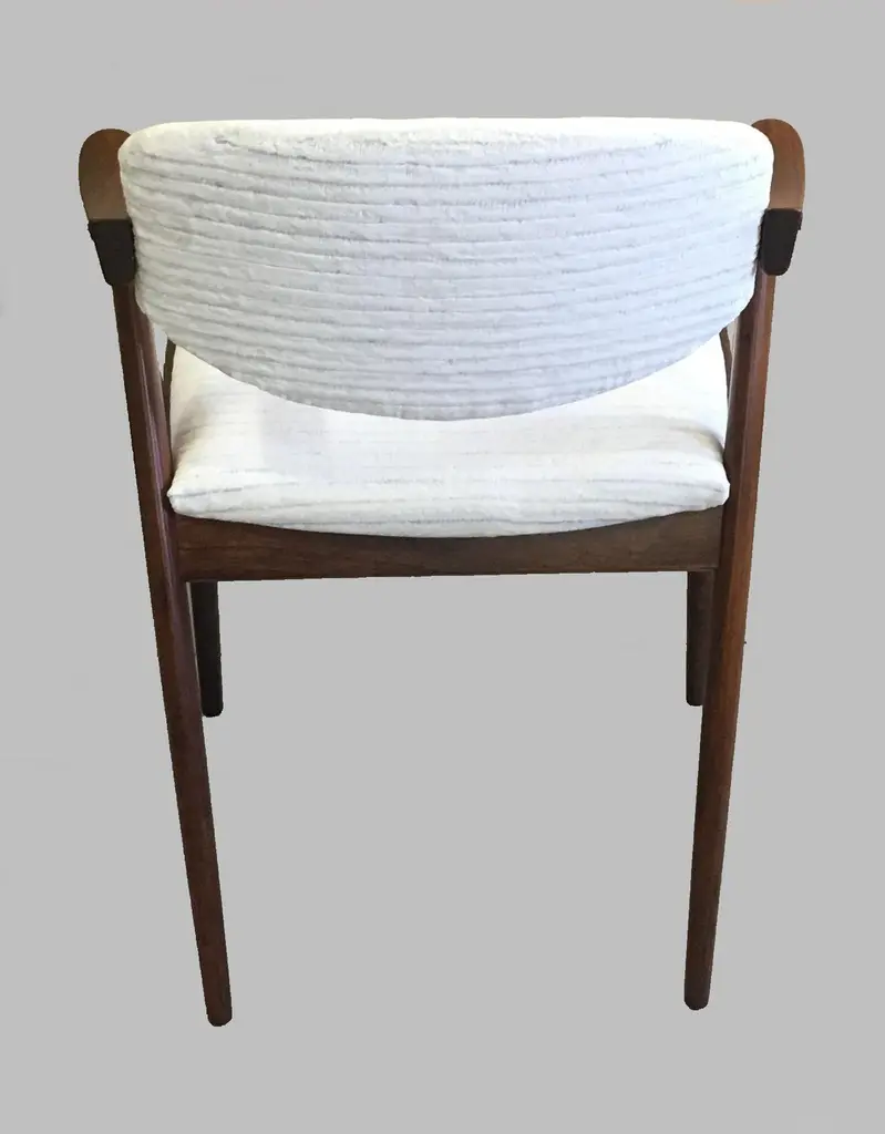 Set of four 1960s fully restored rosewood dining chairs with adjustable backrest by Kai Kristiansen for Schous Møbelfabrik - including custom reupholstery.he chairs have been fully restored and refinished by our experienced workshop to insure that they are in excellent condition with only few and minimal signs of age and use and will be reupholstered without additional cost with fabrics from a wide list of "Kvadrat" or "Romo" fabrics of your choice or from a wide list of leathers from "Sorensen Leather" or "Ca-mo Leather" before they are shipped.The very comfortable chairs have Kai Kristiansens typical light and very elegant design that make them fit in easily where you want them in your home, a design that was so unique that his colleague the famous designer Hans J. Wegner characterized model 42 as beautiful from all angles when the chair was revealed in 1956. The chairs uniqe backrest swivel function allow the backrest to adjust and add even more to the comfortable seating experience.Kai Kristiansen was one of the last pupils of the famous architect Kaare Klint who founded modern Danish design and laid the foundation for the "Danish Modern" style. During the years 1958-1978 Kristiansen worked in his business in Aarhus owned jointly by himself and furniture maker Illum Wikkelsø (1919-1999).Kristiansens works met their most intense demand during a few decades from 1950, then production of them was discontinued. However, several of them are now being produced again by the Japanese furniture producer Miyazaki Chair Mill in Tokushima. An Australian producer has also included Kristiansen production in their portfolio. Kai Kristiansen might have been the originator of mass produced furniture, had he accepted an offer from Ikea-founder Ingvar Kamprad. He declined to let himself enroll in the Ikea staff.Kristiansen exhibitions include numerous participations in furniture and design shows in Milano, Paris, Cologne and London. Among his most cherished works is the Paper Knife collection, including two sofas, a coffee table and an armchair. His 4110 og Handy chairs are also widely sold. In fact, the Kai Kristiansen name is probably better known by a selected global furniture design public than it is known generally in his home country.