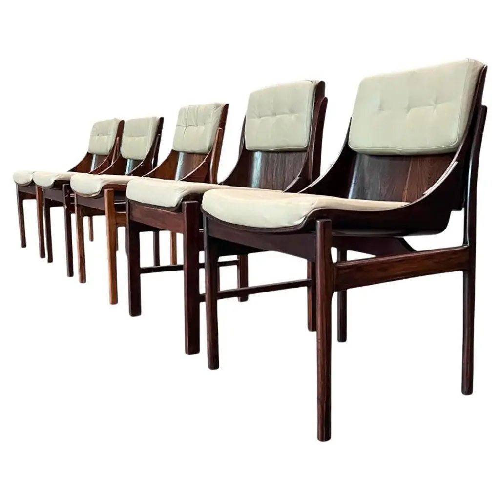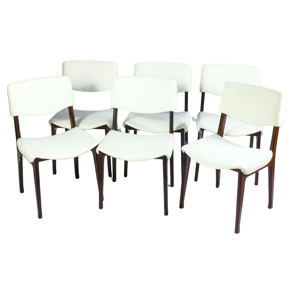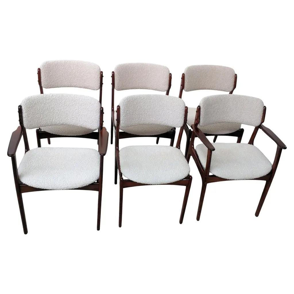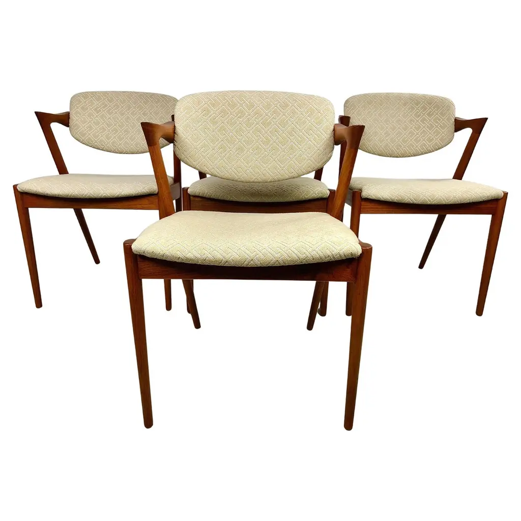 Set of four 1960s fully restored rosewood dining chairs with adjustable backrest by Kai Kristiansen for Schous Møbelfabrik - including custom reupholstery.he chairs have been fully restored and refinished by our experienced workshop to insure that they are in excellent condition with only few and minimal signs of age and use and will be reupholstered without additional cost with fabrics from a wide list of "Kvadrat" or "Romo" fabrics of your choice or from a wide list of leathers from "Sorensen Leather" or "Ca-mo Leather" before they are shipped.The very comfortable chairs have Kai Kristiansens typical light and very elegant design that make them fit in easily where you want them in your home, a design that was so unique that his colleague the famous designer Hans J. Wegner characterized model 42 as beautiful from all angles when the chair was revealed in 1956. The chairs uniqe backrest swivel function allow the backrest to adjust and add even more to the comfortable seating experience.Kai Kristiansen was one of the last pupils of the famous architect Kaare Klint who founded modern Danish design and laid the foundation for the "Danish Modern" style. During the years 1958-1978 Kristiansen worked in his business in Aarhus owned jointly by himself and furniture maker Illum Wikkelsø (1919-1999).Kristiansens works met their most intense demand during a few decades from 1950, then production of them was discontinued. However, several of them are now being produced again by the Japanese furniture producer Miyazaki Chair Mill in Tokushima. An Australian producer has also included Kristiansen production in their portfolio. Kai Kristiansen might have been the originator of mass produced furniture, had he accepted an offer from Ikea-founder Ingvar Kamprad. He declined to let himself enroll in the Ikea staff.Kristiansen exhibitions include numerous participations in furniture and design shows in Milano, Paris, Cologne and London. Among his most cherished works is the Paper Knife collection, including two sofas, a coffee table and an armchair. His 4110 og Handy chairs are also widely sold. In fact, the Kai Kristiansen name is probably better known by a selected global furniture design public than it is known generally in his home country.