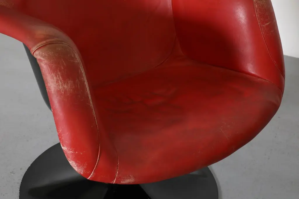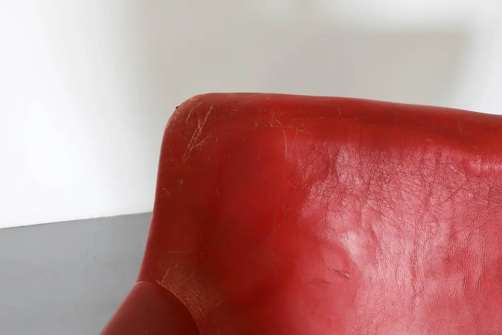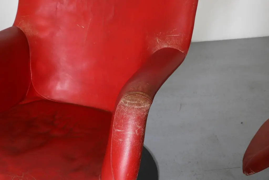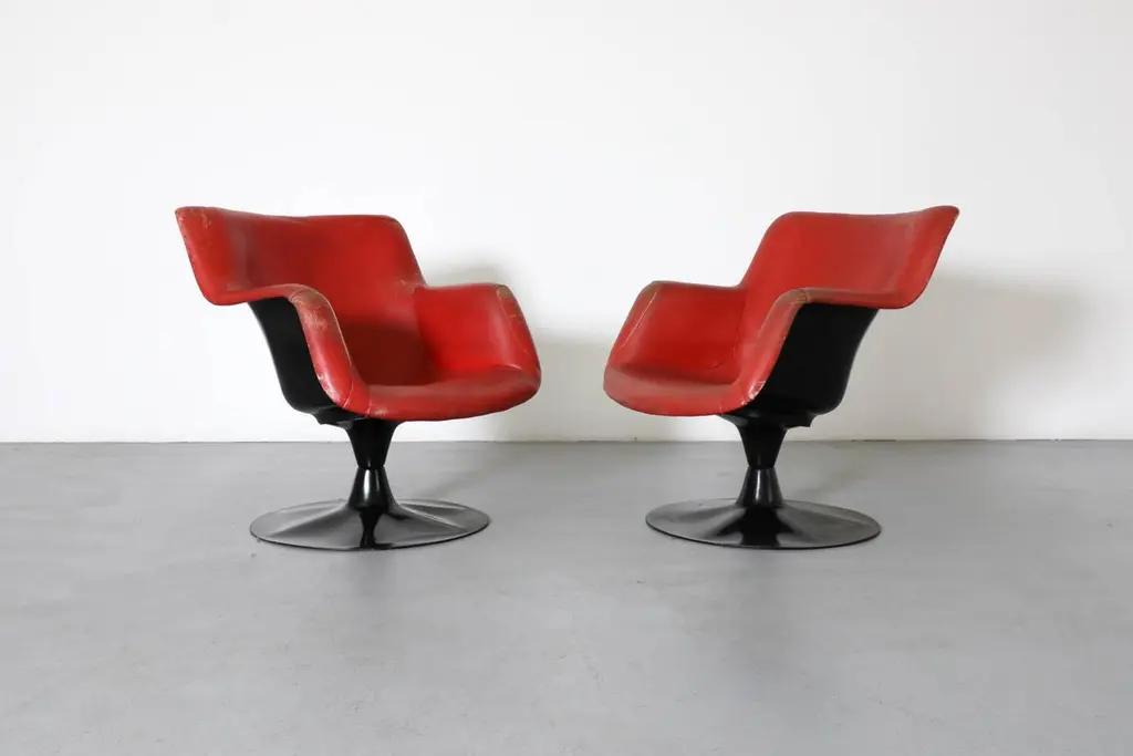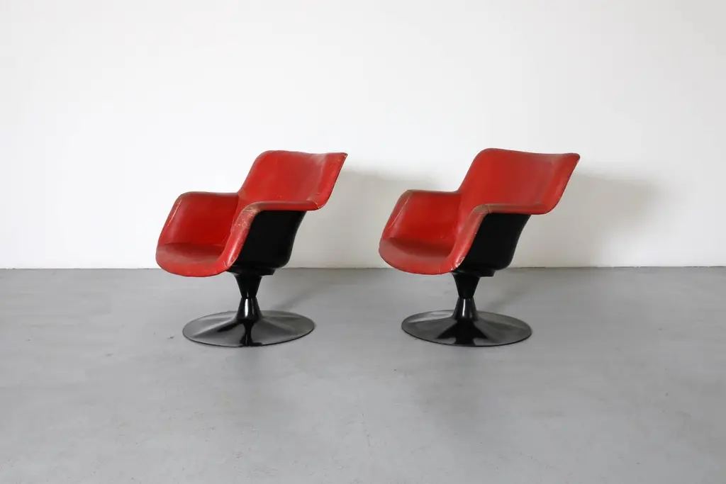 Mid-Century, organically shaped, molded fiberglass swivel armchair. Designed by Finnish designer Yrjö Kukkapuro in 1966 for the Haimi company. Kukkapuro, a leading Modernist in Finnish furniture design bases his designs on aesthetic, functional innovation, user experience, and ergonomics. His extraordinary design career spans all the way from the mid-1950s to the present day. Highlights of Kukkapuro's body of work are on permanent display at the Museum of Modern Art in New York and the Victoria and Albert Museum in London. Visible patina and fading. Cushion loss (dry rot). One chair squeaks when moved. Moderate scratching and holes.