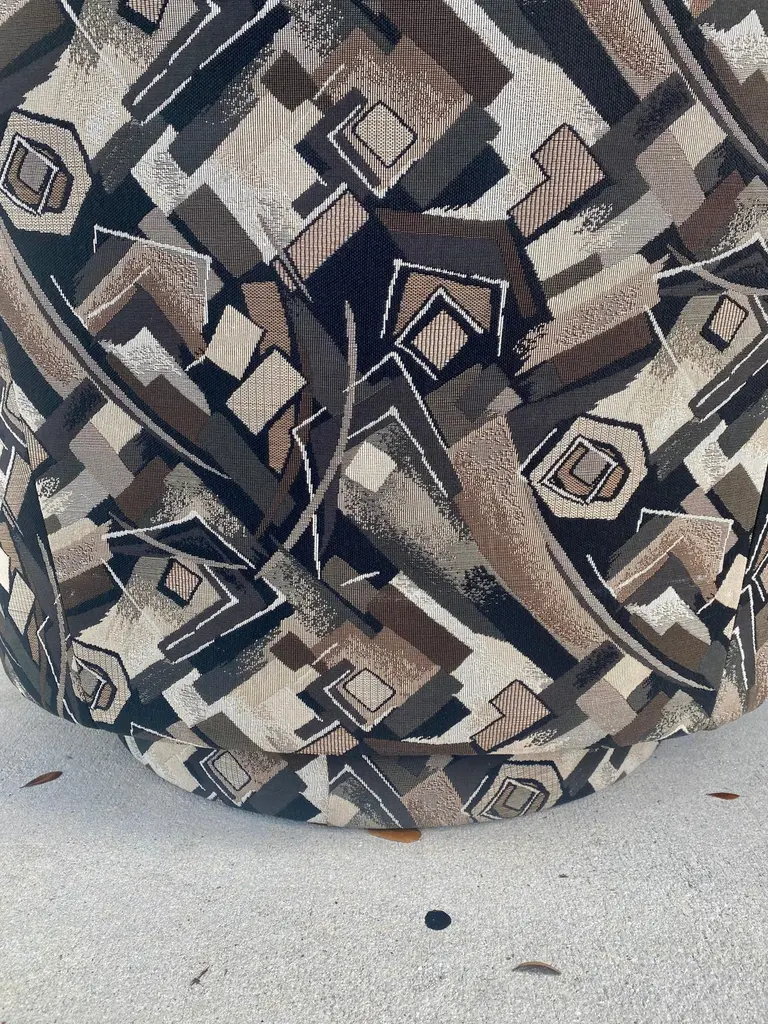 These Iconic stylish original upholstered swivel chairs are packed with personality! Outstanding design is exhibited throughout the monumental form. Post modern Memphis Style Swivel Chairs are beyond cool. Their beautiful and unique shape are attributed to Milo Baughman. The chairs feature a comfortable sculpted barrel back design on a plinth base. Bold and striking, the pieces can be in any interior setting or capture the eye in any environment.