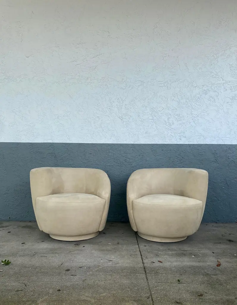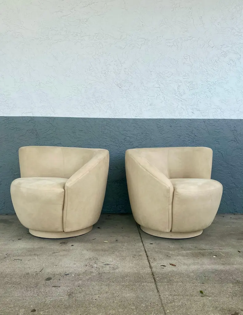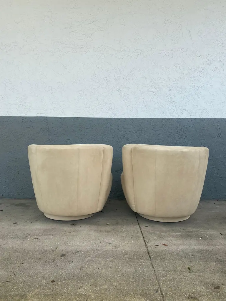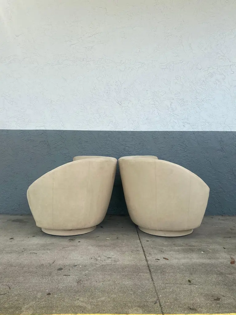 These Iconic swivel chairs are packed with personality! Outstanding design is exhibited throughout the monumental form. Post modern designed by Vladimir Kagan. The unique corkscrew shape in original light beige alcantara suede upholstery also feature a comfortable sculpted barrel back design. Bold and striking, the pieces can be in any interior setting or capture the eye in any environment.