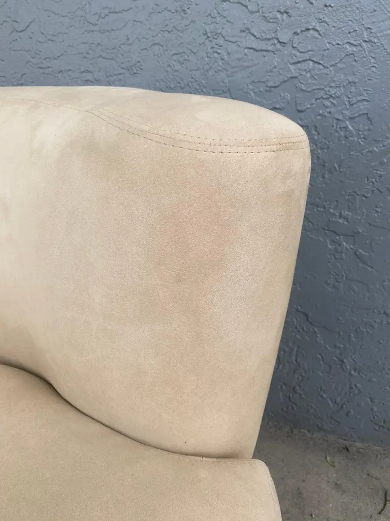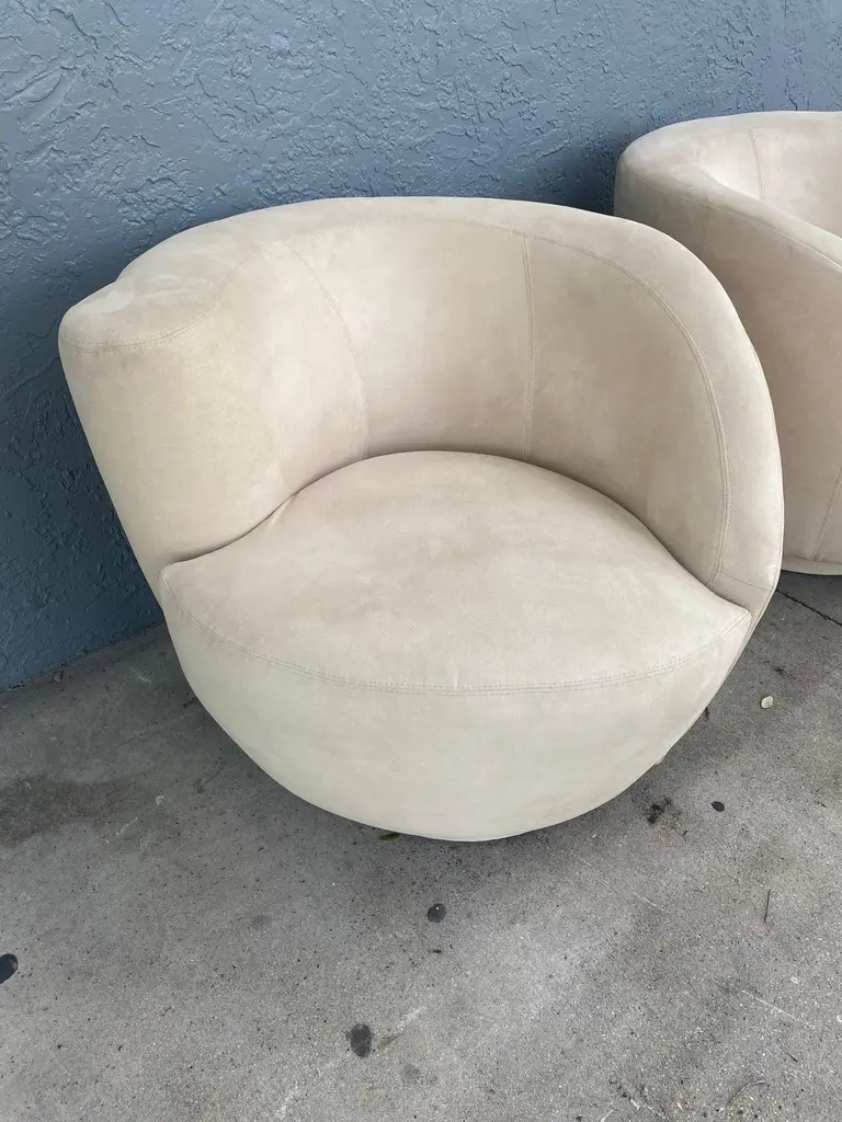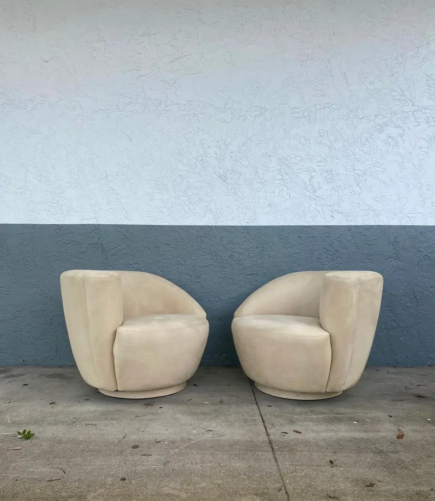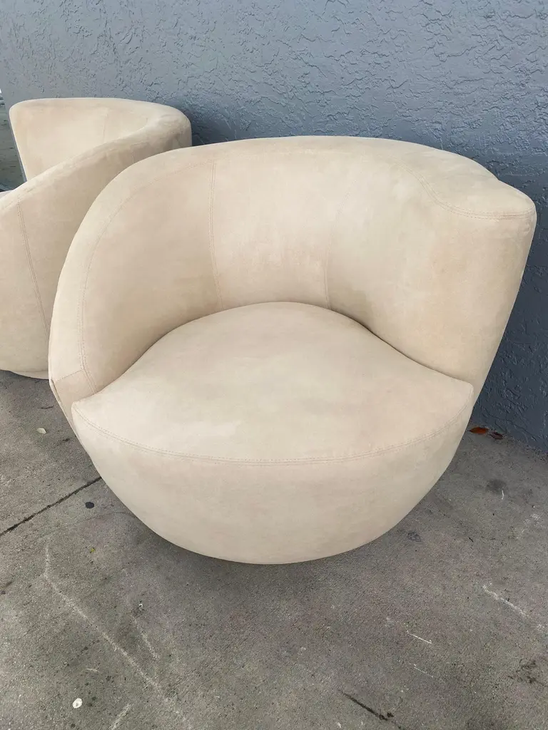 These Iconic swivel chairs are packed with personality! Outstanding design is exhibited throughout the monumental form. Post modern designed by Vladimir Kagan. The unique corkscrew shape in original light beige alcantara suede upholstery also feature a comfortable sculpted barrel back design. Bold and striking, the pieces can be in any interior setting or capture the eye in any environment.