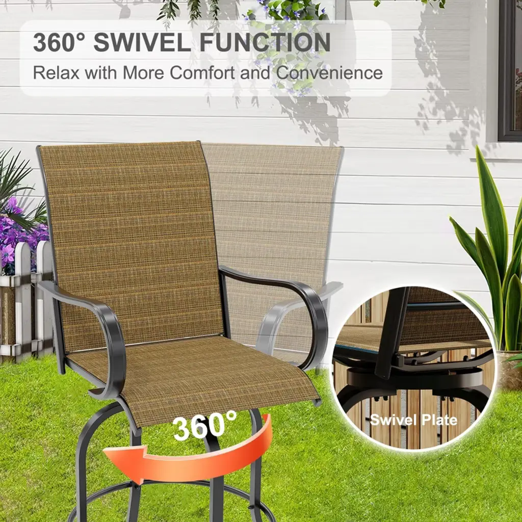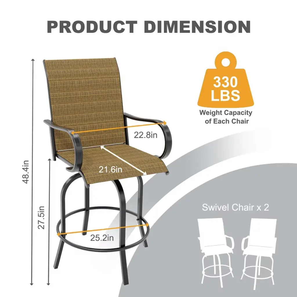This outdoor bar set features a durable, weather-resistant design with a 360 degree swivel bar stool. The stool has a breathable mesh seat and backrest, quick-drying, anti-fading, and easy to clean. It includes a comfortable footrest and an upgraded adjusting knob for added convenience.The set is crafted for ergonomic comfort and health, promising long-lasting use. Ideal for patios, backyards, or poolside areas, it offers a stylish and functional addition to outdoor spaces.