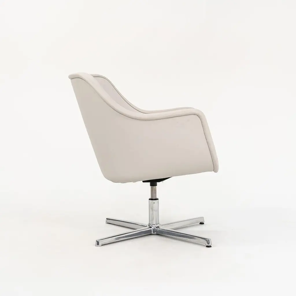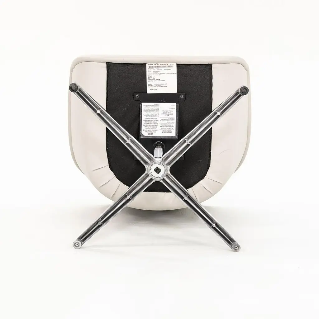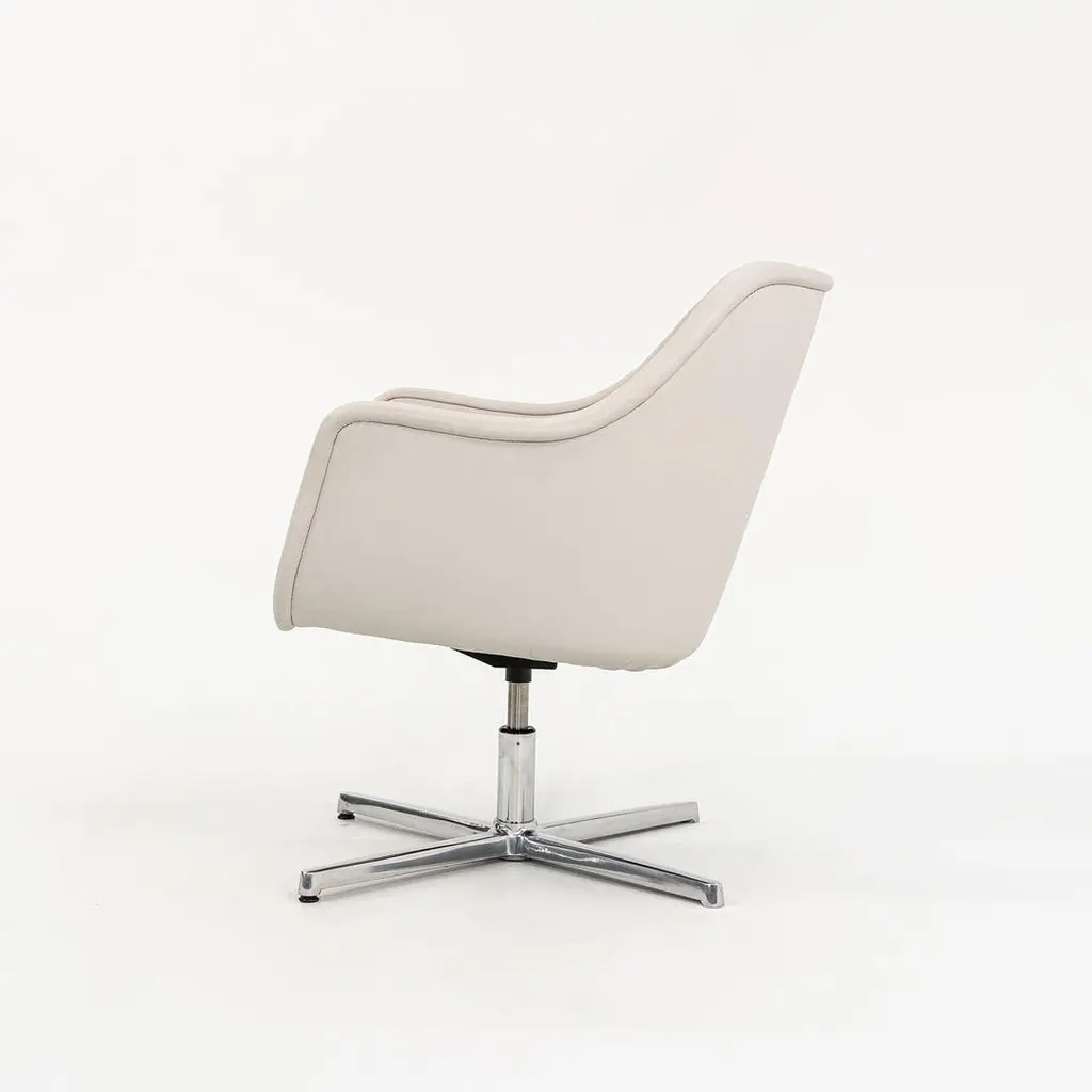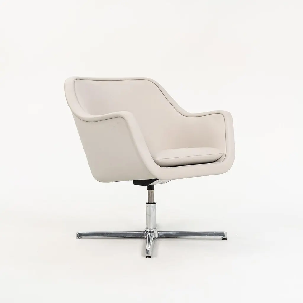 This is a Bumper lounge chair, originally designed by Ward Bennett in 1964. Each of the two chairs available was produced by Geiger International in 2019. The listed price includes one chair and we have two on hand. Their design features a polished-steel 4-spoke base that swivels, and has a creamy off-white leather upholstered seat and back. Each chair measures 26.5 inches long, 28 inches wide and 32.63 inches tall. The height is adjustable up to 35.63 inches. The seat has a base height of 16.88 inches, and is adjustable to 19.88 inches. The arm has a base height of 24.19 inches, and is adjustable to 27.19 inches. There are some very light marks on the leather, and some slight scuffs to the bases. Overall, these chairs are in very good to excellent condition with light wear. Please see photos. Genuinely faulty goods will be replaced or money refunded on a case by case basis, however we must be advised of any faulty goods upon receipt of the item. It is the customer's responsibility to pay for return shipping and ship the item back to us. If the item is found to be faulty, we will also refund the postage cost. If there is no damage to the item, but a return is approved, the buyer will be responsible for both the initial and return shipping cost. It is at our discretion to refuse the refund of undamaged goods. If an order is placed and you would like to cancel the order, please notify us immediately. Any refunds will be processed via the same means that payment was made.