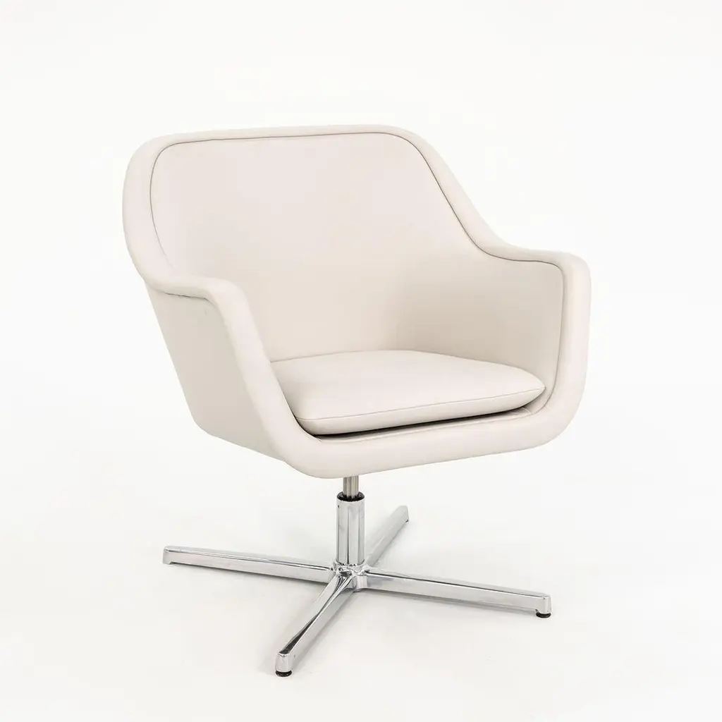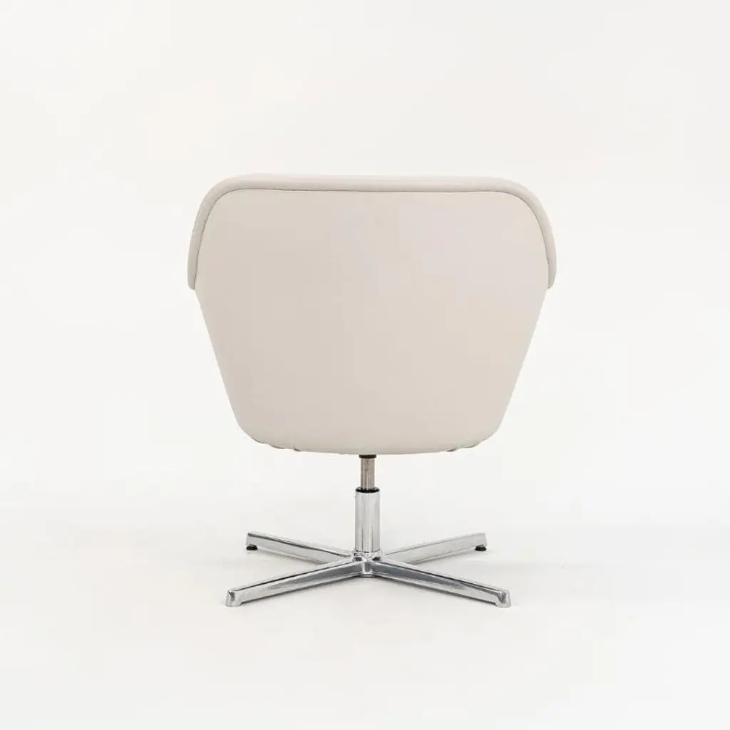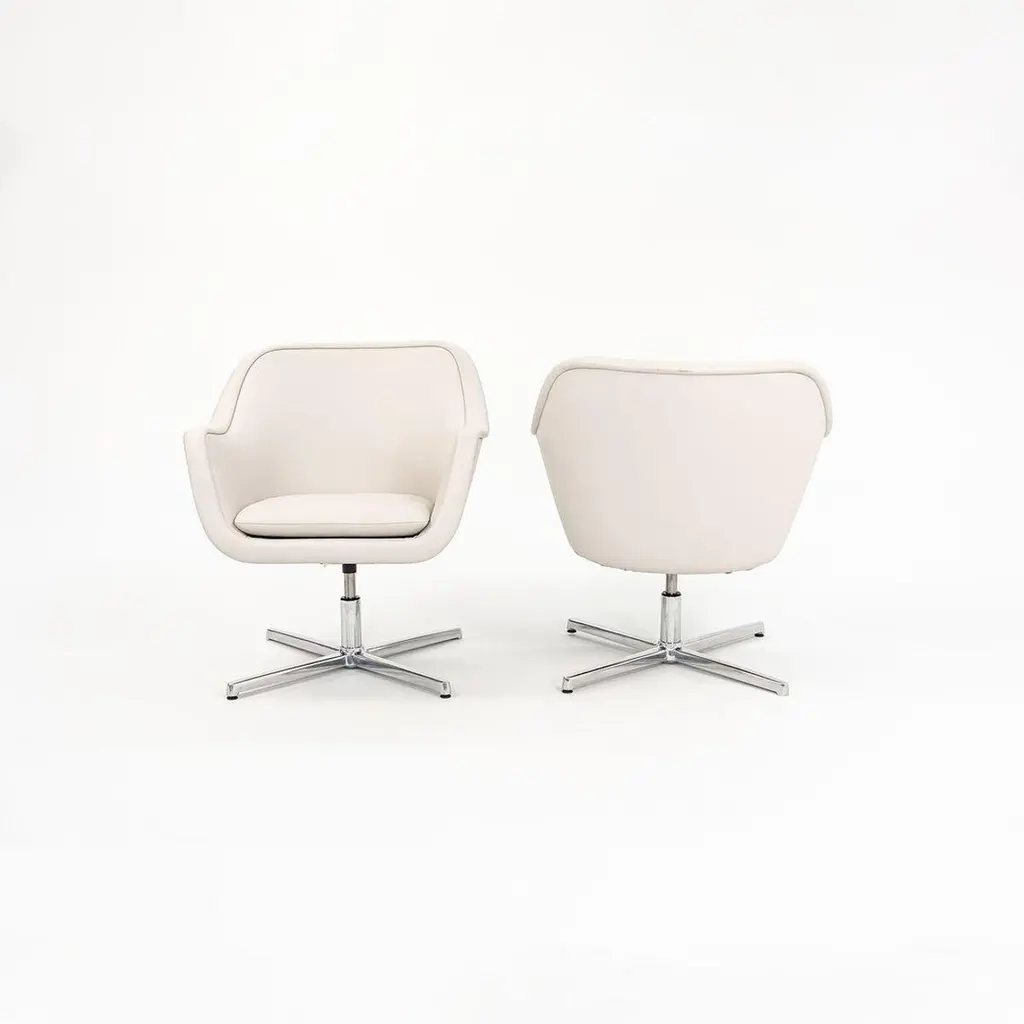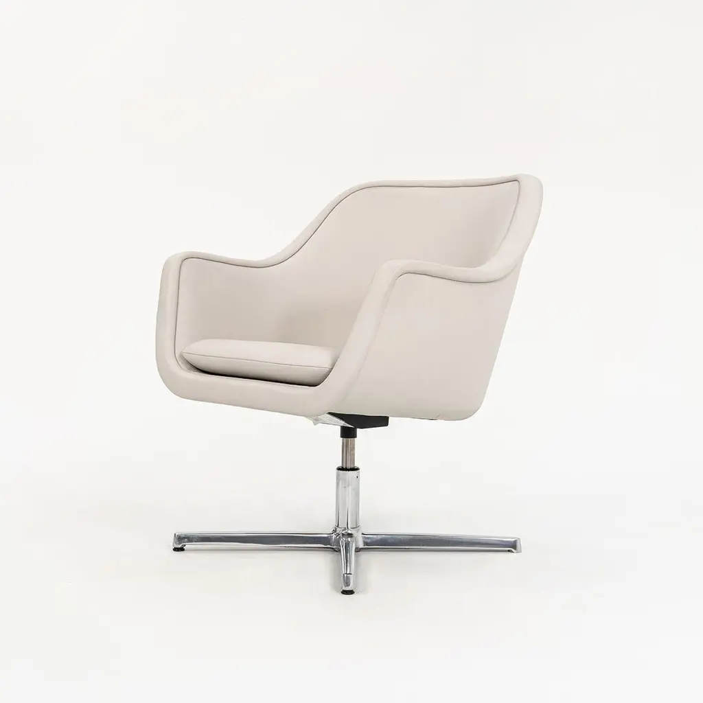 This is a Bumper lounge chair, originally designed by Ward Bennett in 1964. Each of the two chairs available was produced by Geiger International in 2019. The listed price includes one chair and we have two on hand. Their design features a polished-steel 4-spoke base that swivels, and has a creamy off-white leather upholstered seat and back. Each chair measures 26.5 inches long, 28 inches wide and 32.63 inches tall. The height is adjustable up to 35.63 inches. The seat has a base height of 16.88 inches, and is adjustable to 19.88 inches. The arm has a base height of 24.19 inches, and is adjustable to 27.19 inches. There are some very light marks on the leather, and some slight scuffs to the bases. Overall, these chairs are in very good to excellent condition with light wear. Please see photos. Genuinely faulty goods will be replaced or money refunded on a case by case basis, however we must be advised of any faulty goods upon receipt of the item. It is the customer's responsibility to pay for return shipping and ship the item back to us. If the item is found to be faulty, we will also refund the postage cost. If there is no damage to the item, but a return is approved, the buyer will be responsible for both the initial and return shipping cost. It is at our discretion to refuse the refund of undamaged goods. If an order is placed and you would like to cancel the order, please notify us immediately. Any refunds will be processed via the same means that payment was made.