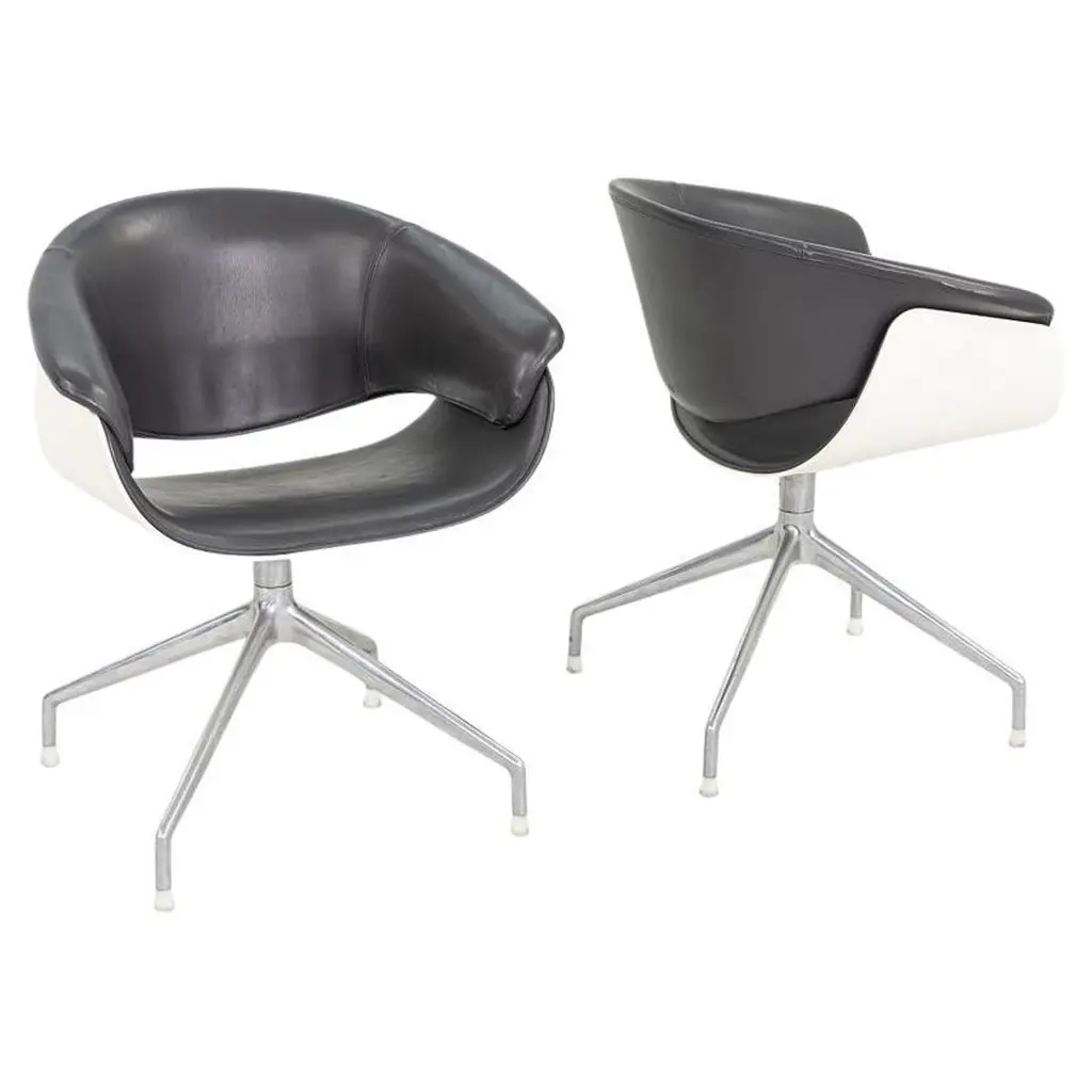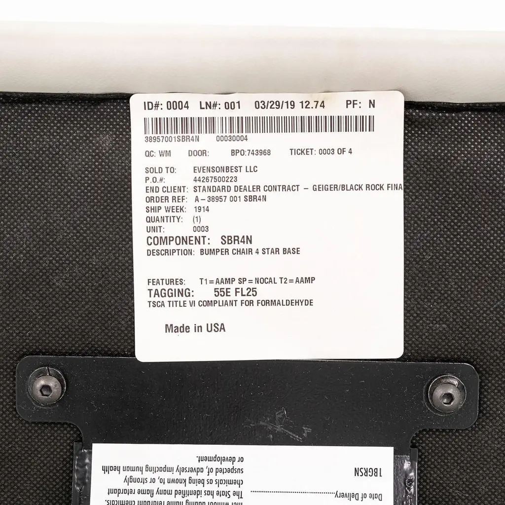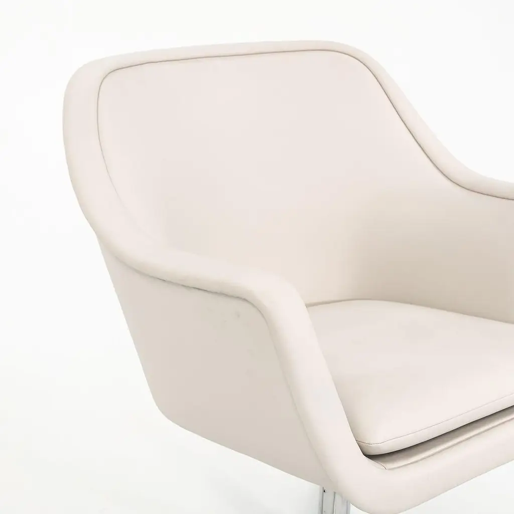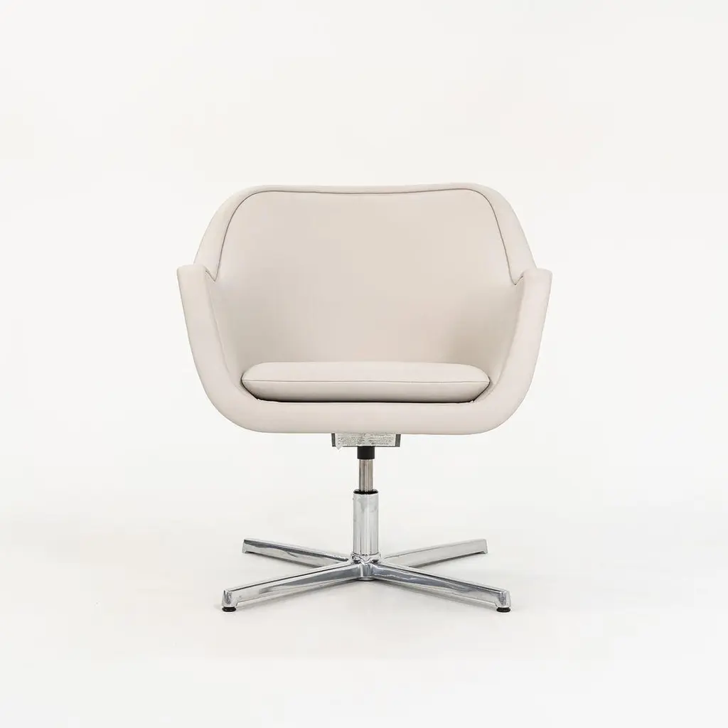 This is a Bumper lounge chair, originally designed by Ward Bennett in 1964. Each of the two chairs available was produced by Geiger International in 2019. The listed price includes one chair and we have two on hand. Their design features a polished-steel 4-spoke base that swivels, and has a creamy off-white leather upholstered seat and back. Each chair measures 26.5 inches long, 28 inches wide and 32.63 inches tall. The height is adjustable up to 35.63 inches. The seat has a base height of 16.88 inches, and is adjustable to 19.88 inches. The arm has a base height of 24.19 inches, and is adjustable to 27.19 inches. There are some very light marks on the leather, and some slight scuffs to the bases. Overall, these chairs are in very good to excellent condition with light wear. Please see photos. Genuinely faulty goods will be replaced or money refunded on a case by case basis, however we must be advised of any faulty goods upon receipt of the item. It is the customer's responsibility to pay for return shipping and ship the item back to us. If the item is found to be faulty, we will also refund the postage cost. If there is no damage to the item, but a return is approved, the buyer will be responsible for both the initial and return shipping cost. It is at our discretion to refuse the refund of undamaged goods. If an order is placed and you would like to cancel the order, please notify us immediately. Any refunds will be processed via the same means that payment was made.