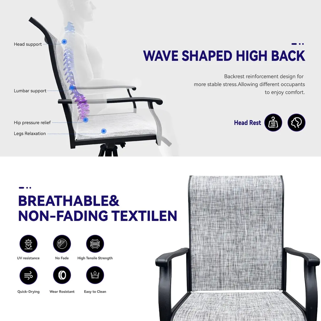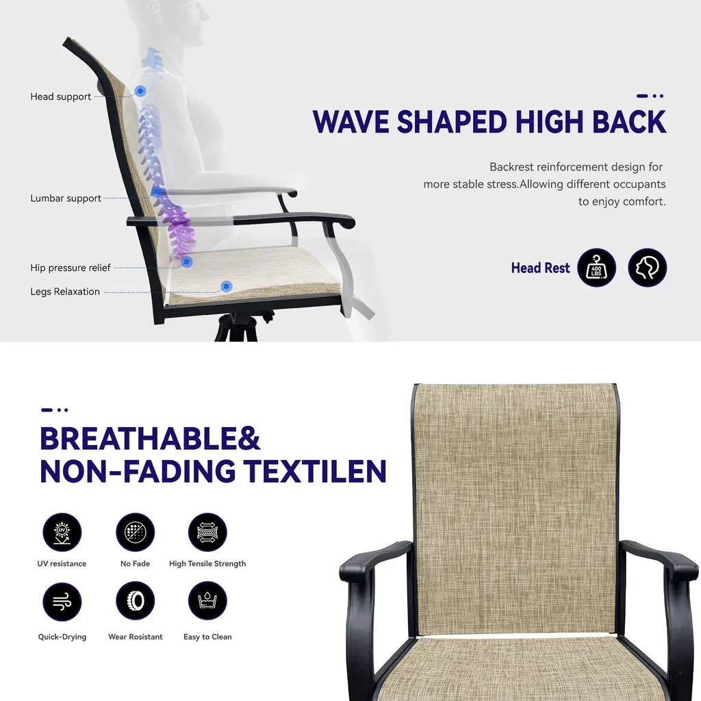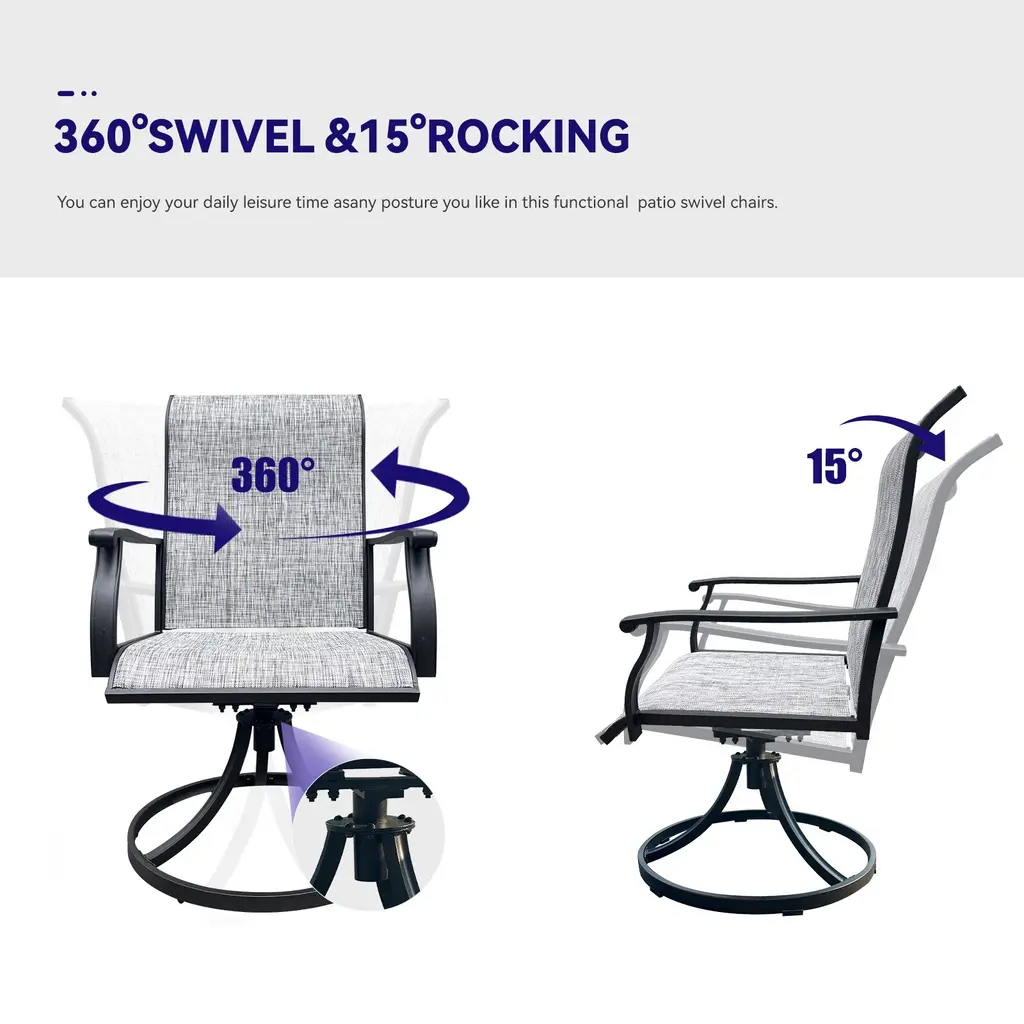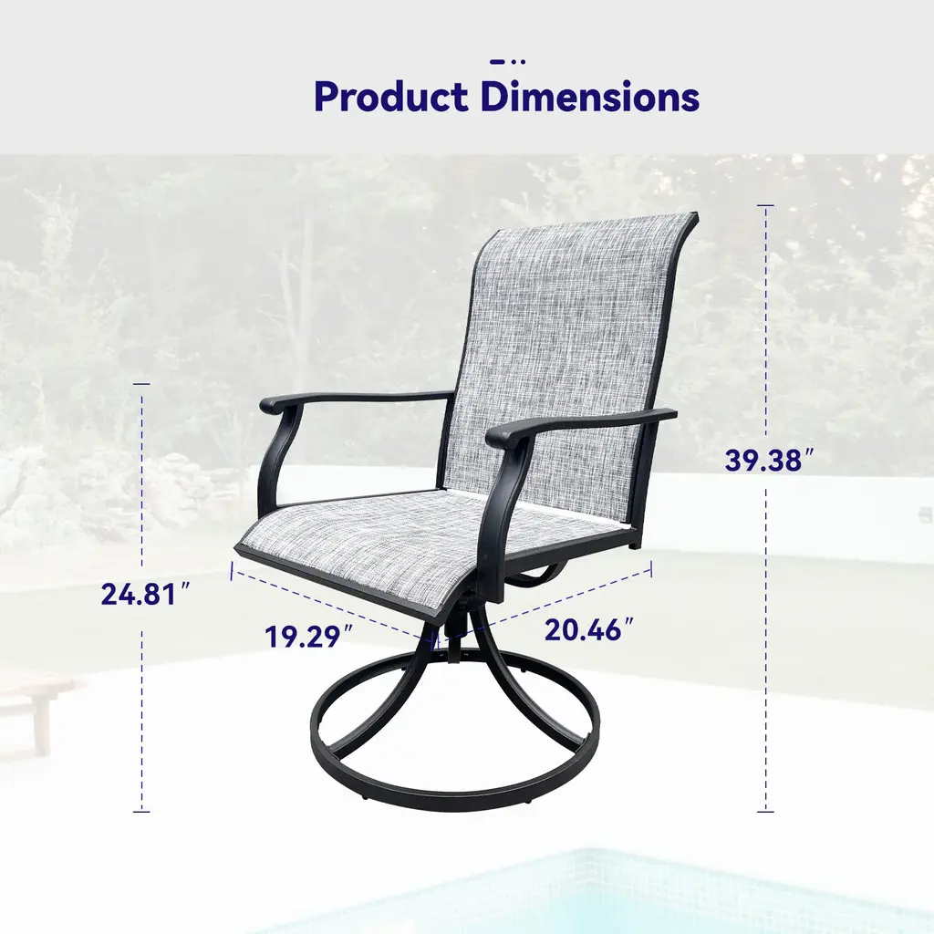 ✨ 2 pieces patio swivel dining chairs are ideal for patio, porch, deck, and any indoor/outdoor use. ✨Powder-coated metal frame protects the outdoor chairs suffering through the outdoor weather and prolongs the lifetime of the outdoor furniture ✨ Ergonomic armrests are designed for comfortable long-time sitting. Well-ventilated sling fabric is breathable to allow airflow to your back, which you will be grateful for on those hot summer days. ✨ 360°swivel design and slight rocking function provide extra comfort and relaxation. You could easily lean back and rock, or swivel with ease. ✨ Dimensions: 22.85"Lx28.75"Wx39.38"H. Seat Height: 17.33". Heavy-duty outdoor chairs with a weight capacity of up to 250 lbs. Every 2 chairs are in a package.