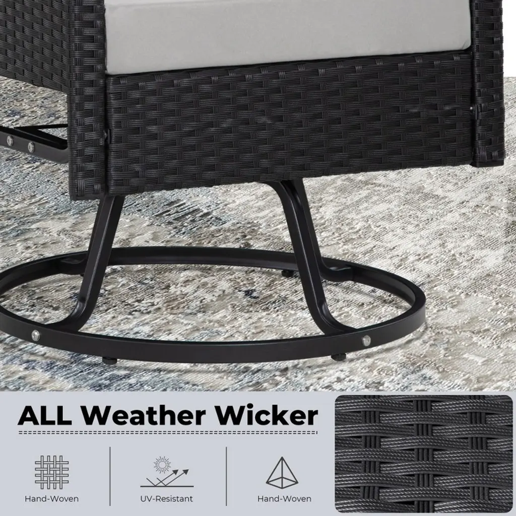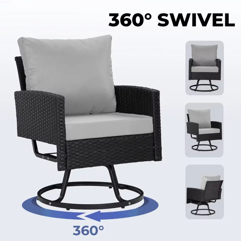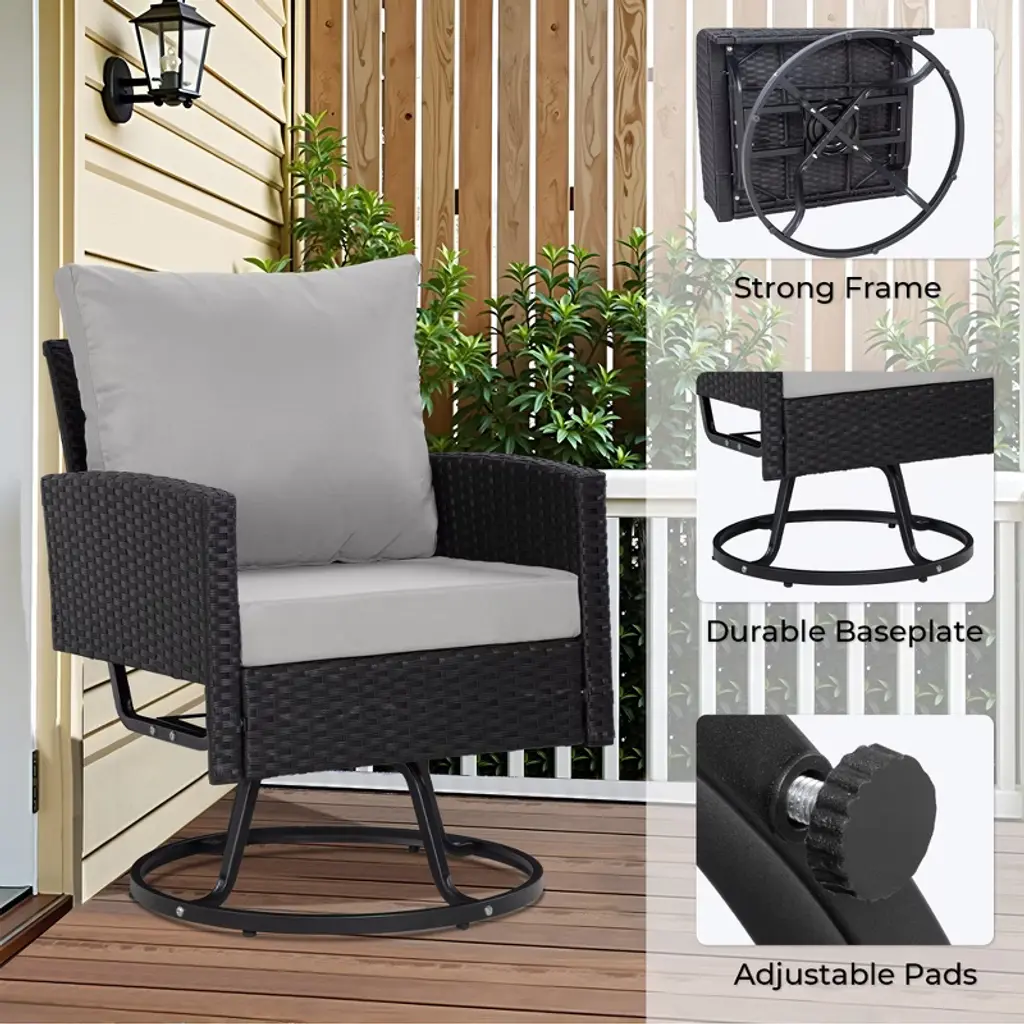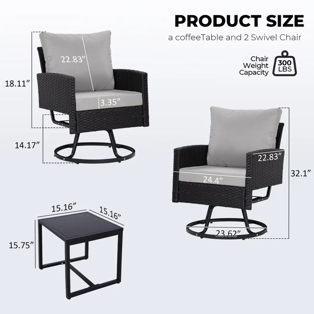 Upgrade your outdoor lounging experience with this durable and stylish 3-piece swivel patio chair set. Designed for both function and elegance, each chair features a smooth 360-degree swivel mechanism, thick foam cushions, and premium handwoven PE wicker. Ideal for any patio, garden, deck, or poolside space, this set delivers comfort, durability, and a touch of sophistication to your outdoor living area. Product Features Durable Wicker Construction: Built with weather-resistant PE wicker and supported by a rustproof powder-coated steel frame, each chair offers long-lasting durability and supports up to 300 lbs. Perfect for year-round outdoor use. Smooth 360° Swivel Function: The swivel chairs feature a rotating disc base that allows full-circle movement, letting you easily turn in any direction. Non-slip foot pads add stability and help prevent tipping for safe, secure seating. Comfortable and Easy to Maintain: Each chair includes a 3.35-inch thick foam seat cushion for premium comfort. Removable, water-resistant cushion covers with zippers make cleaning quick and easy, ensuring your set stays fresh and inviting. Elegant & Versatile Design: The combination of handwoven rattan and a classic silhouette adds timeless appeal. This set complements a variety of outdoor spaces, including patios, balconies, porches, poolside areas, gardens, and backyards. Reliable Customer Support: Each set undergoes strict quality control. If any issues arise during delivery—such as missing or damaged items—our responsive customer service team is ready to provide a prompt and satisfactory solution.