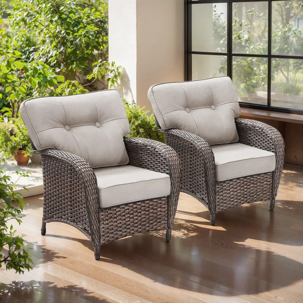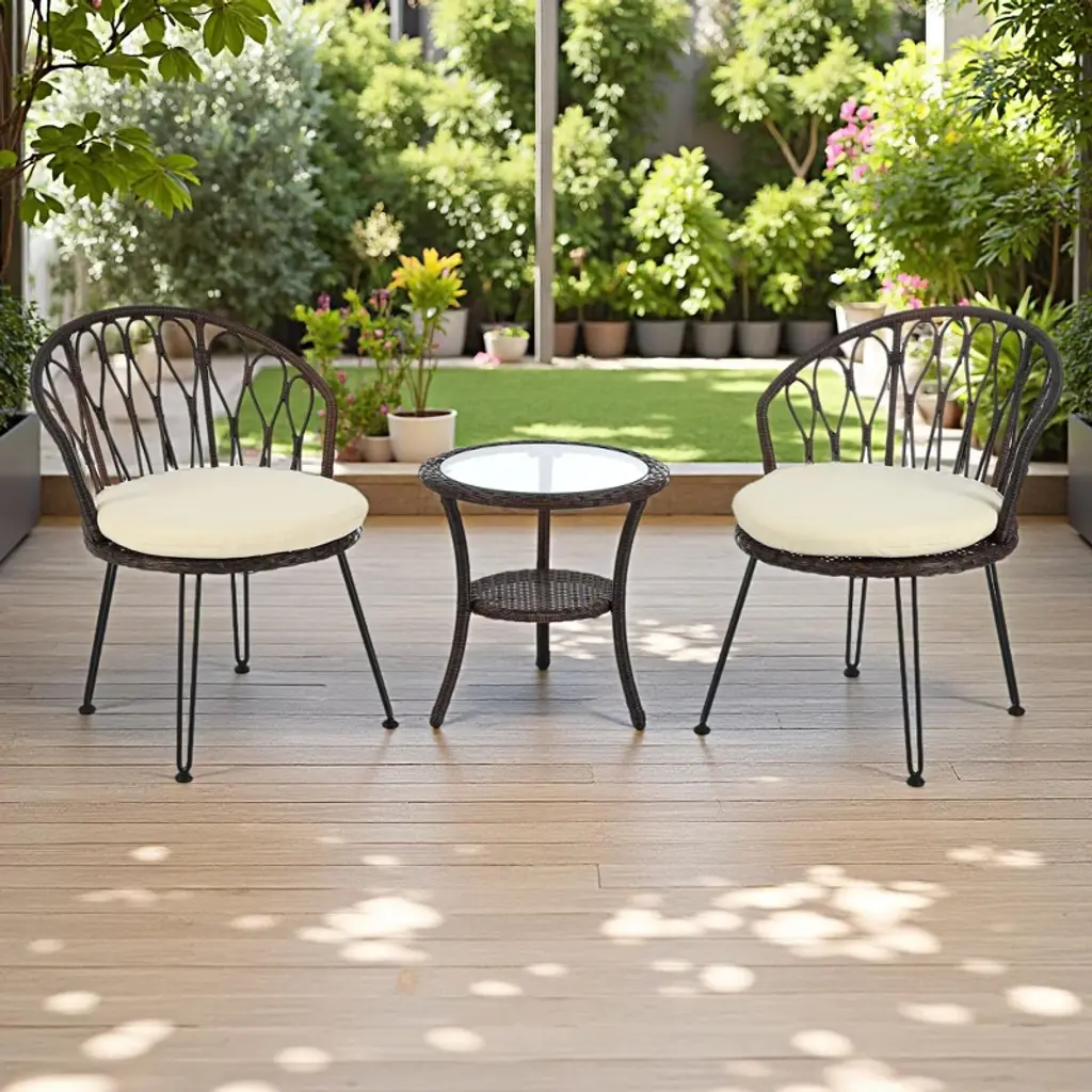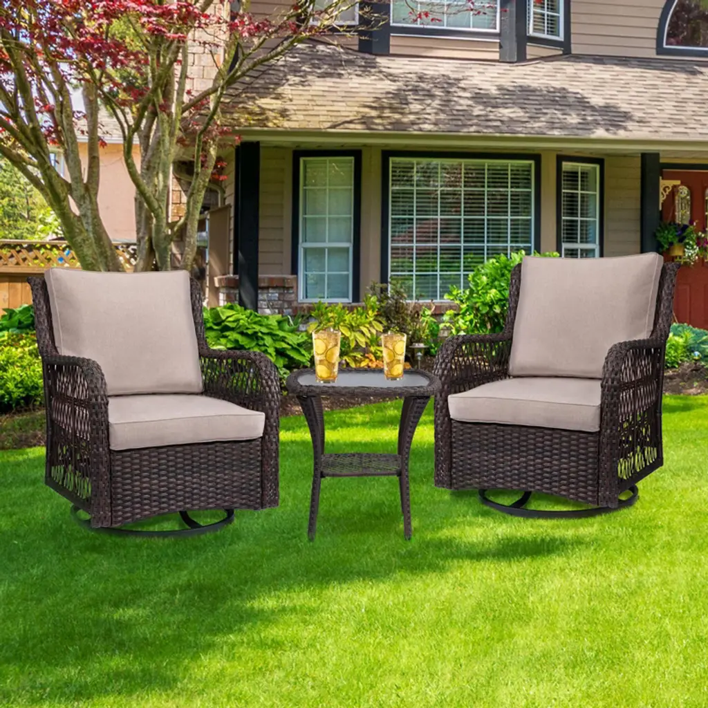 This 3-piece patio set features swivel and rocking wicker chairs with sturdy steel frames and weather-resistant cushions for comfort and durability. Includes a tempered glass side table with extra storage. Easy to assemble with clear instructions; cushions may need a few days to fully expand after unpacking.