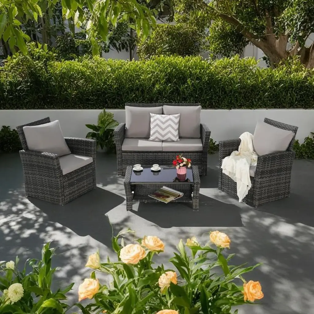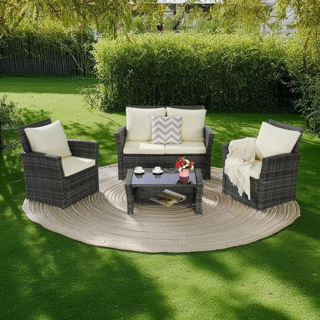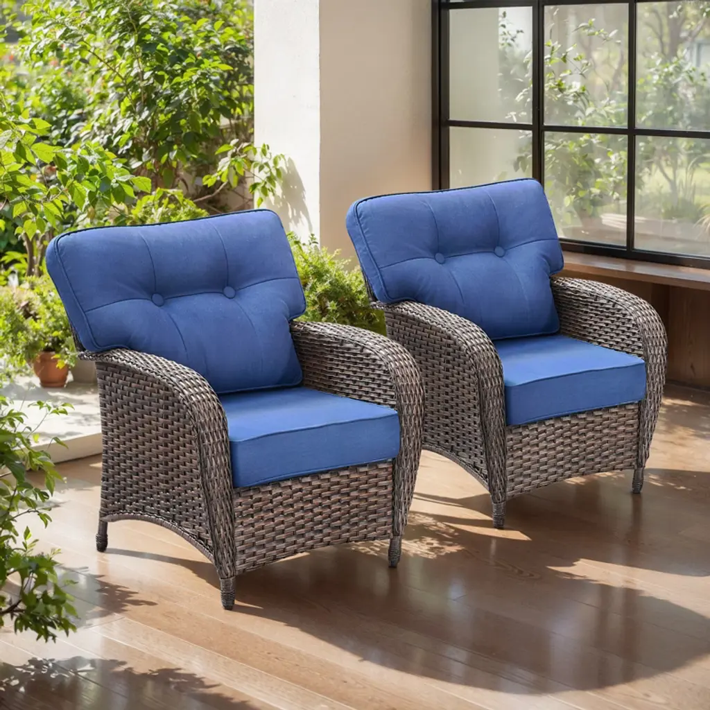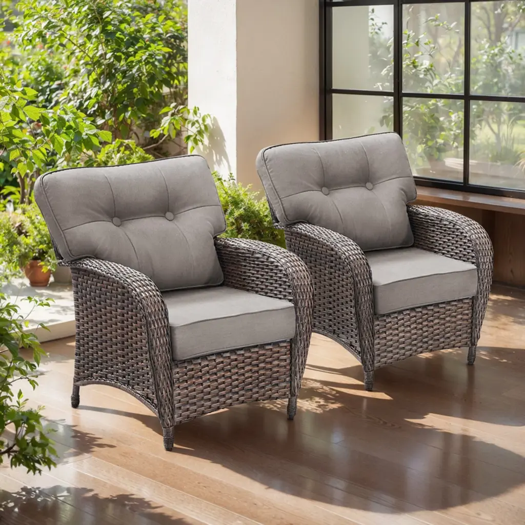 This 3-piece patio set features swivel and rocking wicker chairs with sturdy steel frames and weather-resistant cushions for comfort and durability. Includes a tempered glass side table with extra storage. Easy to assemble with clear instructions; cushions may need a few days to fully expand after unpacking.