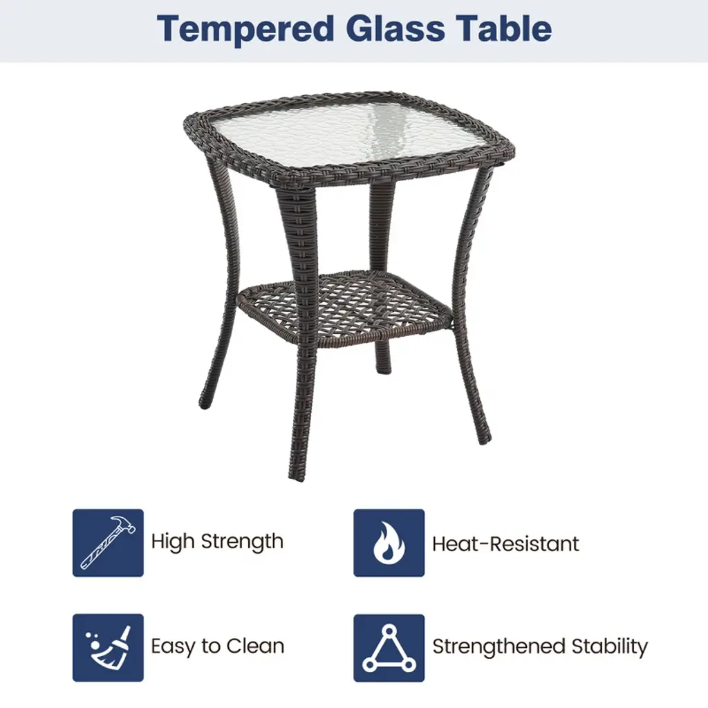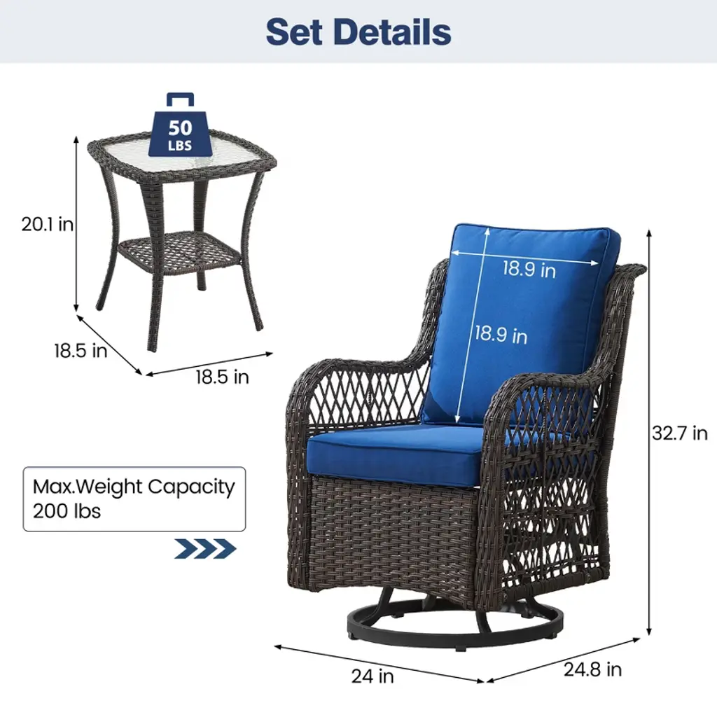 Feature:The chair offers a 360-degree swivel and rocks front and backThe high-strength tempered glass table is heat resistant, and easy to clean while providing enhanced stabilityCrafted from all-weather rattan, the set is built to withstand the elementsThe shelf beneath the tabletop for convenient storageThe cushion covers are removable for easy washing Specification:Material: PE rattan + Iron Chair Size: 24 x 24.8 x 32.7 inchTable Size: 18.5 x 18.5 x 20.1 inchChair Weight Capacity: 200 lbsTable Load Capacity: 50 lbs Packing list:1 x table2 x chairs4 x cushions1 x hardware pack1 x instruction manual Note:Please follow the installation instructions step by step. Before starting, make sure you have all the parts you need. Please do not tighten the screws up too much, just to 80% before you finish to make the installation go on successfully.