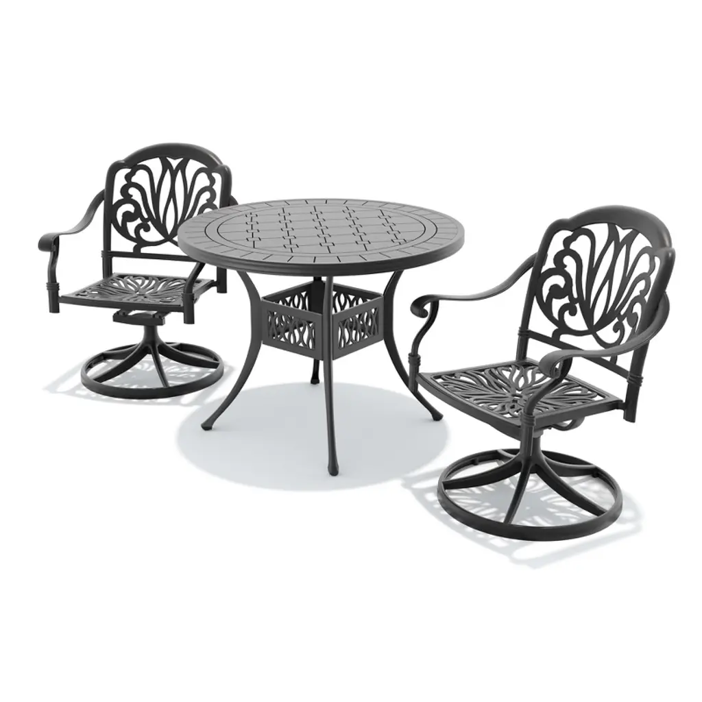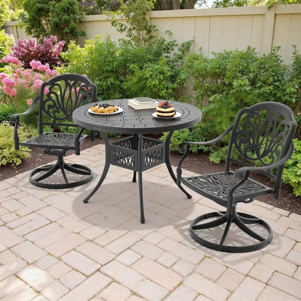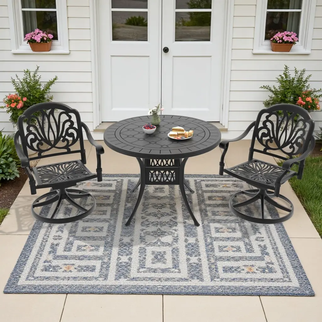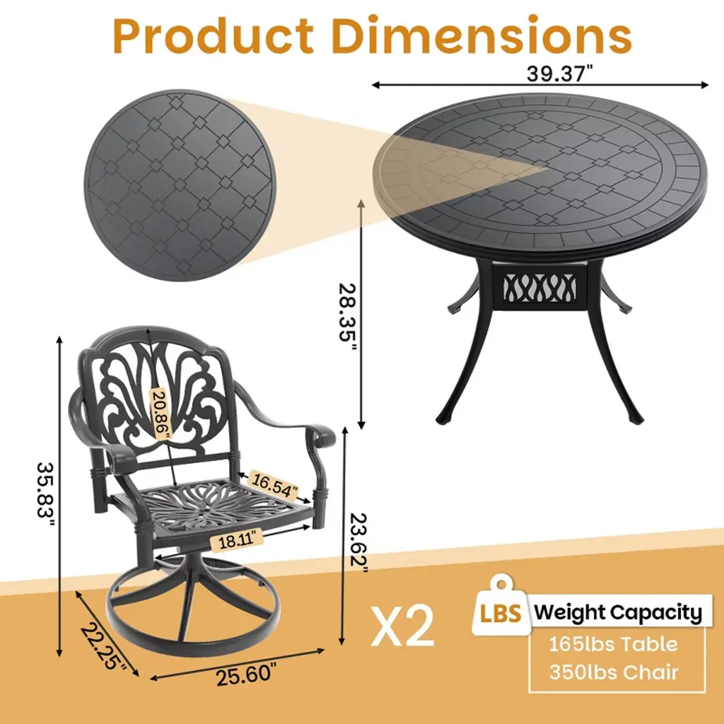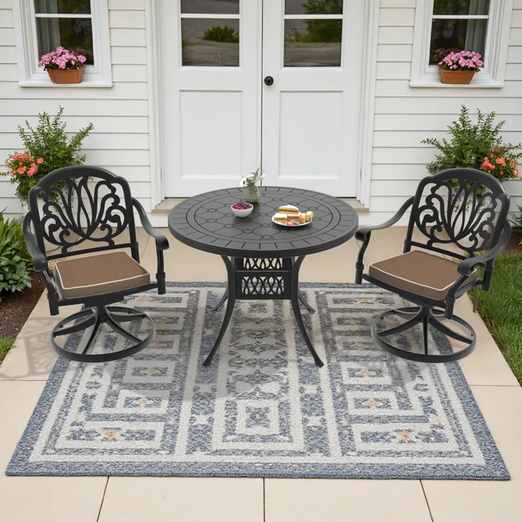 What's Included? ✔ 1 Aluminum Dining Table (39.37" L*39.37"W*28.35"H) ✔ 2 Swivel Rust-Resistant Chairs ✔ 2 Brown Cushions Enjoy outdoor comfort and style with this cast aluminum patio set featuring 360° swivel chairs and a black round table . Made from rust- and corrosion-resistant cast aluminum, this set is built to last through all weather conditions. The swivel chairs allow easy movement and relaxed conversations with family and friends. The spacious table is perfect for meals, drinks, or décor, adding both function and charm. Ideal for patios, gardens, or balconies, this elegant set brings comfort, durability, and convenience to your outdoor space—perfect for gatherings, meals, or quiet moments.