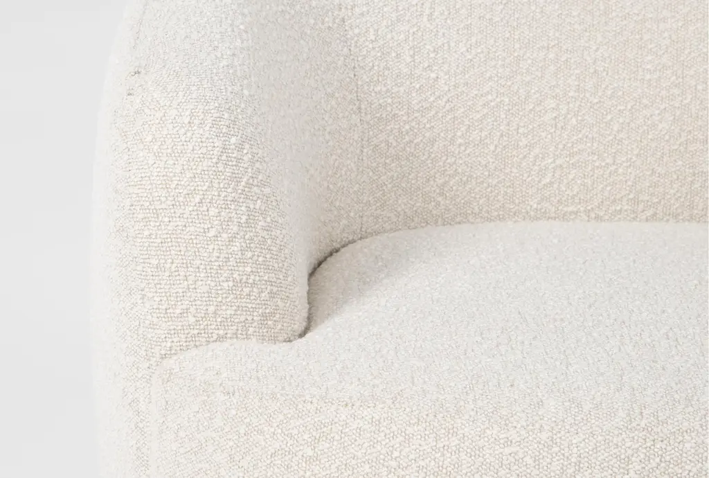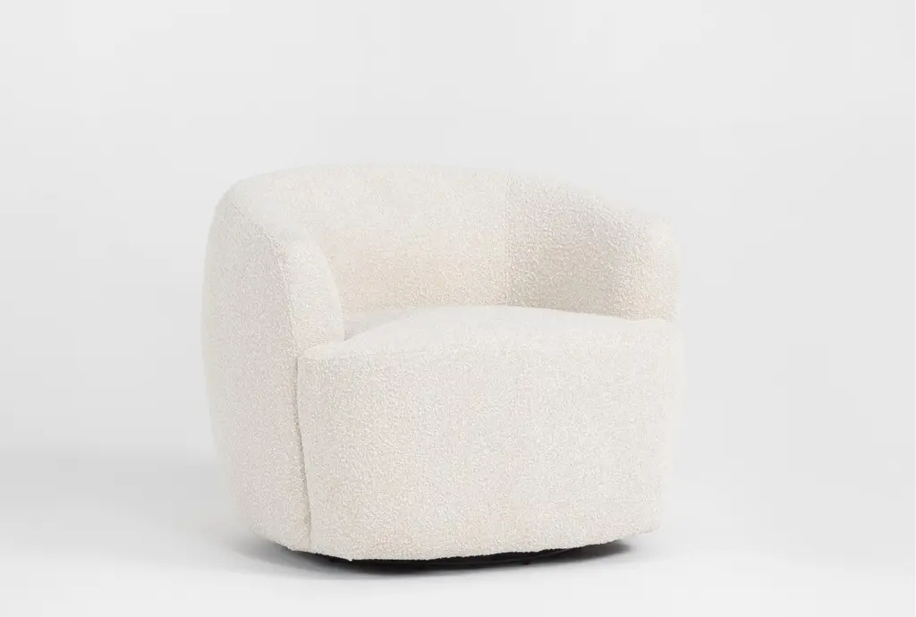 The Abby White Boucle Fabric Swivel Barrel Arm Chair is a modern addition to any living room. Its curved shape and firm comfort level provide both style and support. The white boucle fabric adds a soft, neutral touch to your space.