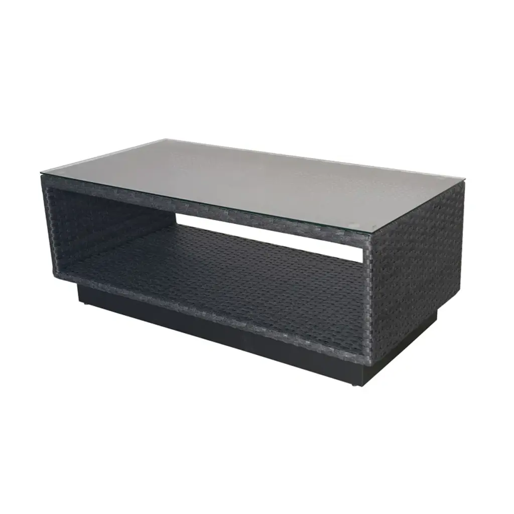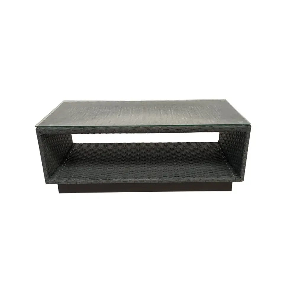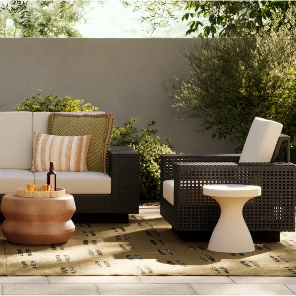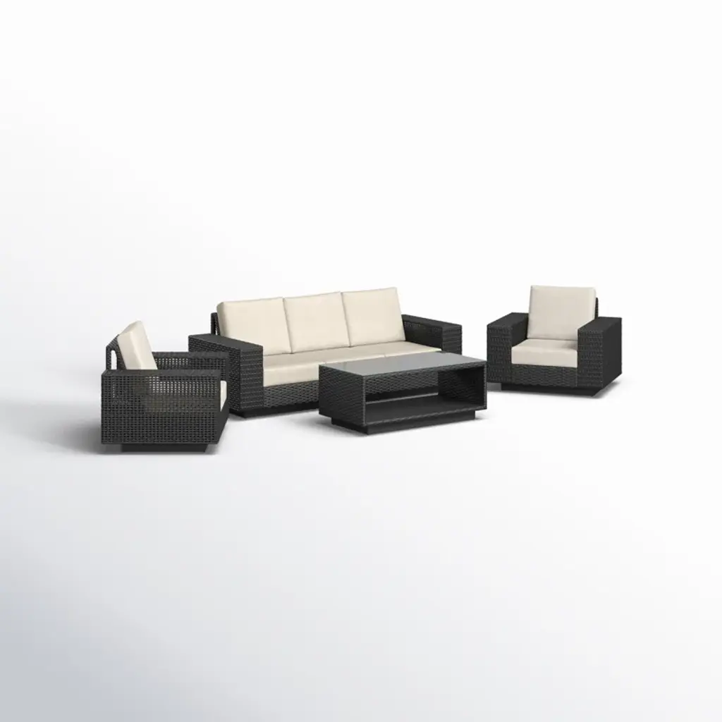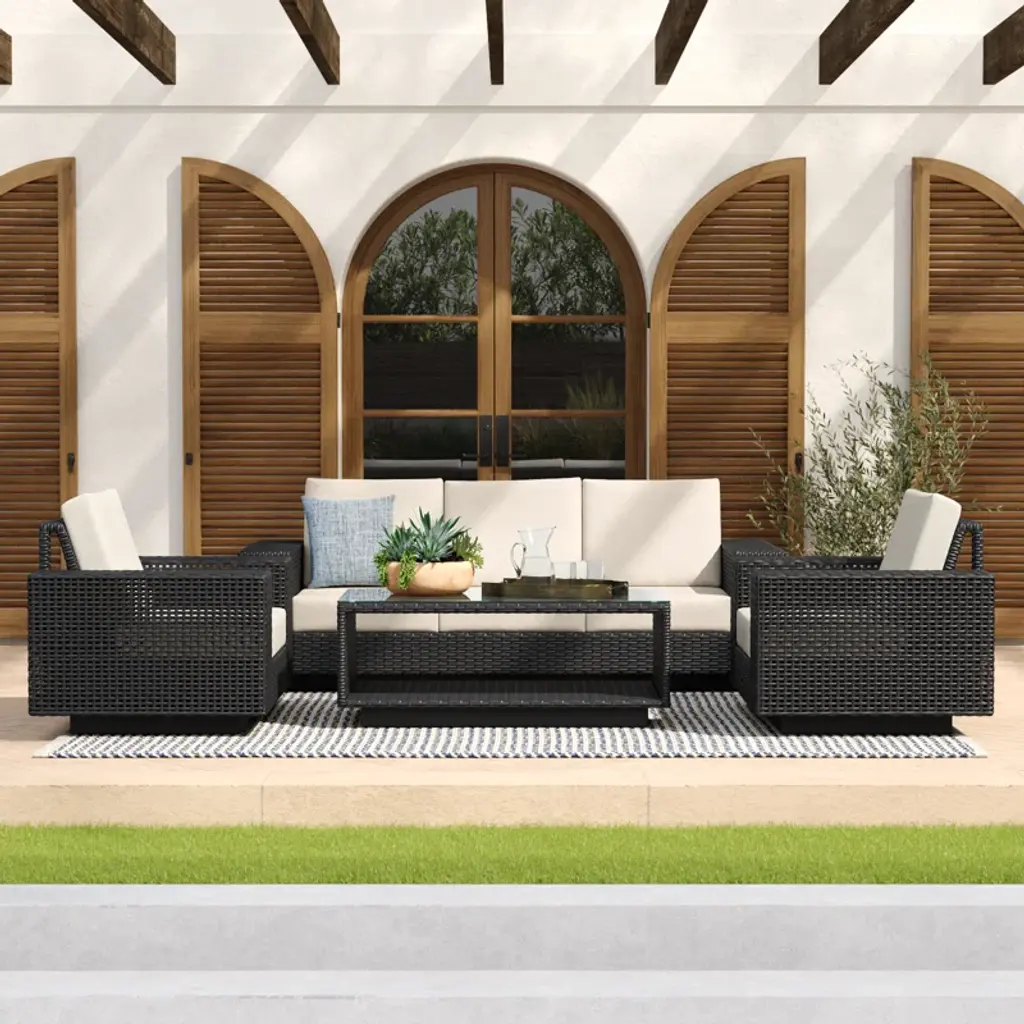 This outdoor conversation set features metal-framed chairs with a rocking design, perfect for lounging in style. The set includes a deep seating loveseat, two chairs, and a wicker table with a glass top. Seating five comfortably, it's the ideal spot for gathering with friends and family. Sunbrella® upholstery adds a touch of luxury while the aluminum inner frame ensures lasting support. So, sit back and enjoy the great outdoors.