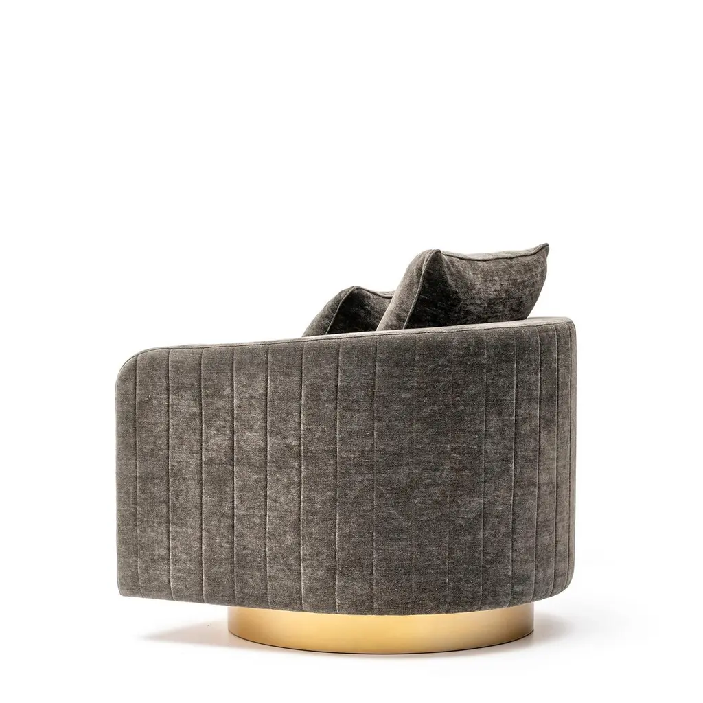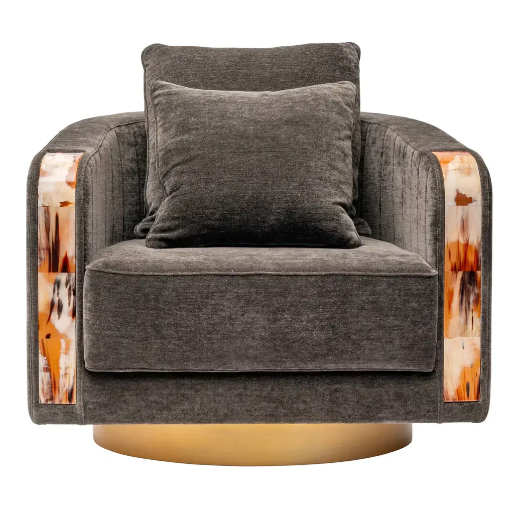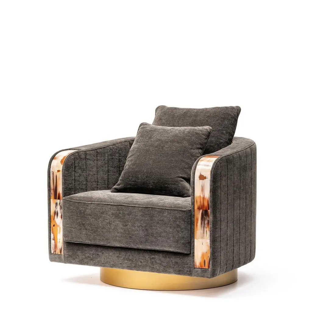With its curvilinear forms, thoughtful detailing and prized materials, Afrodite swivel armchair offers the ultimate in style and function. Featuring ribbed sides and back, the armchair is upholstered in Cortina fabric (cat. B), Ardoise color, a soft viscose and linen chenille whose color and grain recall the slate. Sitting on a wooden base with satin brass effect, the design is distinguished by curved inlays in Corno Italiano, handcrafted with remarkable attention to detail by master craftsmen. Padded with multi-density expanded polyurethane foam, goose down and memory foam, the armchair ensures supreme comfort. A curated selection of alternative upholstery options and different finishes is available. The piece can also be customized in a material of your choice.Notes:- Colors and shades of Corno Italiano processed by our Company are unique and due to the natural origin of raw material. For this reason Corno Italiano tones that can be seen in pictures are indicative and cannot be reproduced in finished products.- Price is referred to armchair and cushions upholstered in the same material and color.