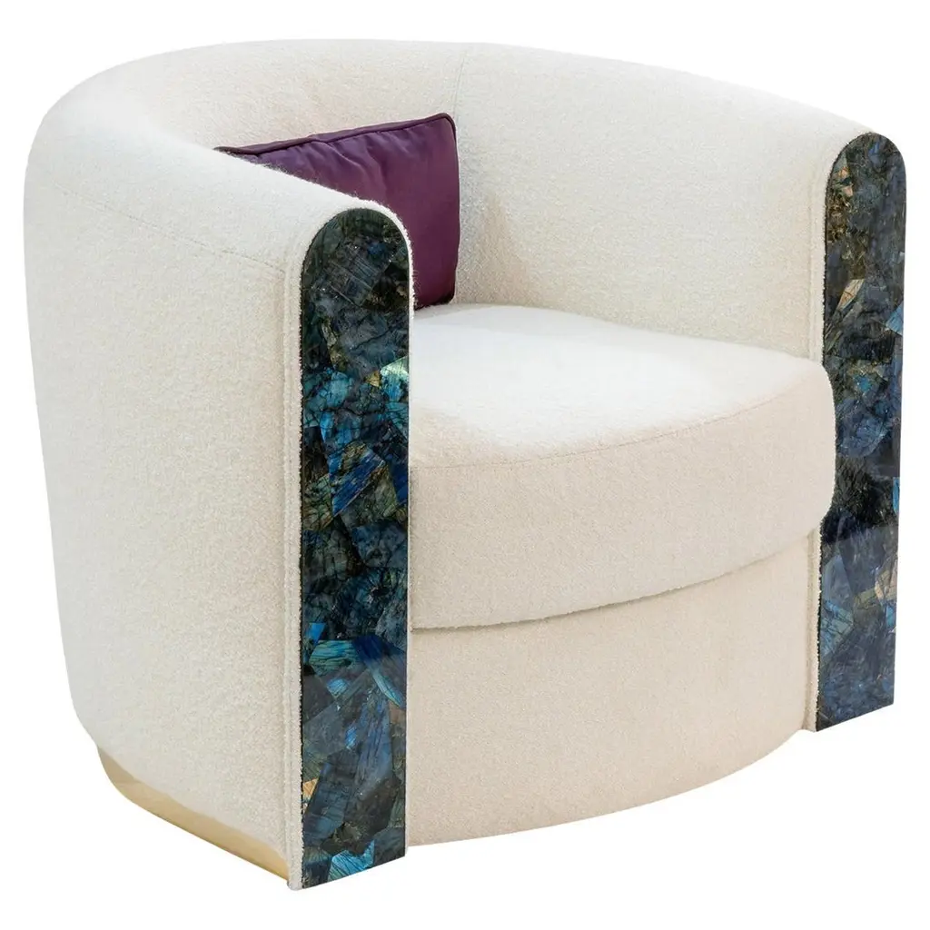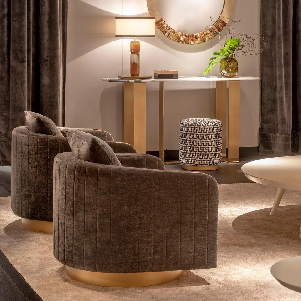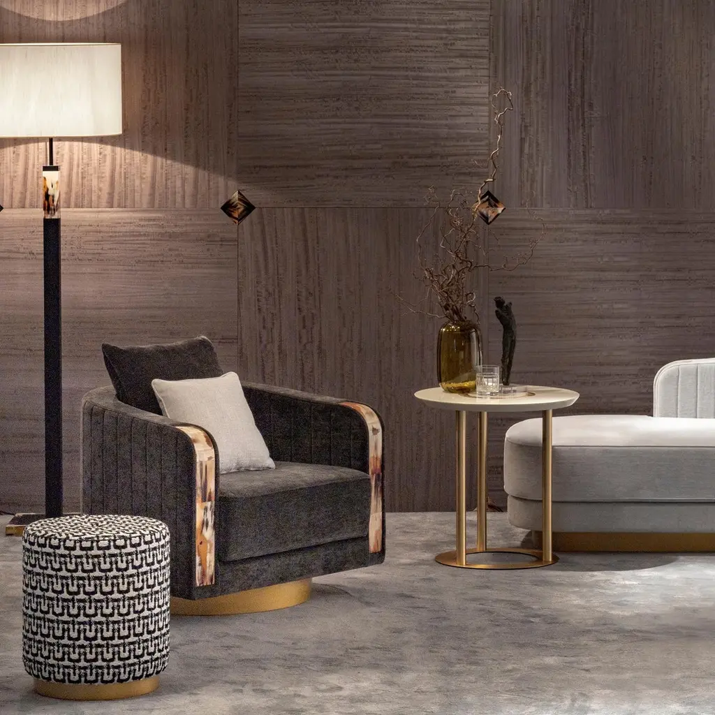 With its curvilinear forms, thoughtful detailing and prized materials, Afrodite swivel armchair offers the ultimate in style and function. Featuring ribbed sides and back, the armchair is upholstered in Cortina fabric (cat. B), Ardoise color, a soft viscose and linen chenille whose color and grain recall the slate. Sitting on a wooden base with satin brass effect, the design is distinguished by curved inlays in Corno Italiano, handcrafted with remarkable attention to detail by master craftsmen. Padded with multi-density expanded polyurethane foam, goose down and memory foam, the armchair ensures supreme comfort. A curated selection of alternative upholstery options and different finishes is available. The piece can also be customized in a material of your choice.Notes:- Colors and shades of Corno Italiano processed by our Company are unique and due to the natural origin of raw material. For this reason Corno Italiano tones that can be seen in pictures are indicative and cannot be reproduced in finished products.- Price is referred to armchair and cushions upholstered in the same material and color.