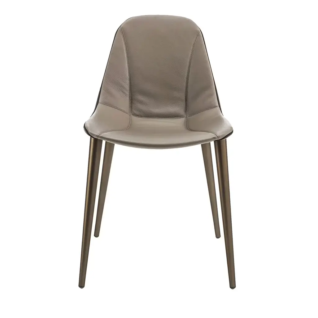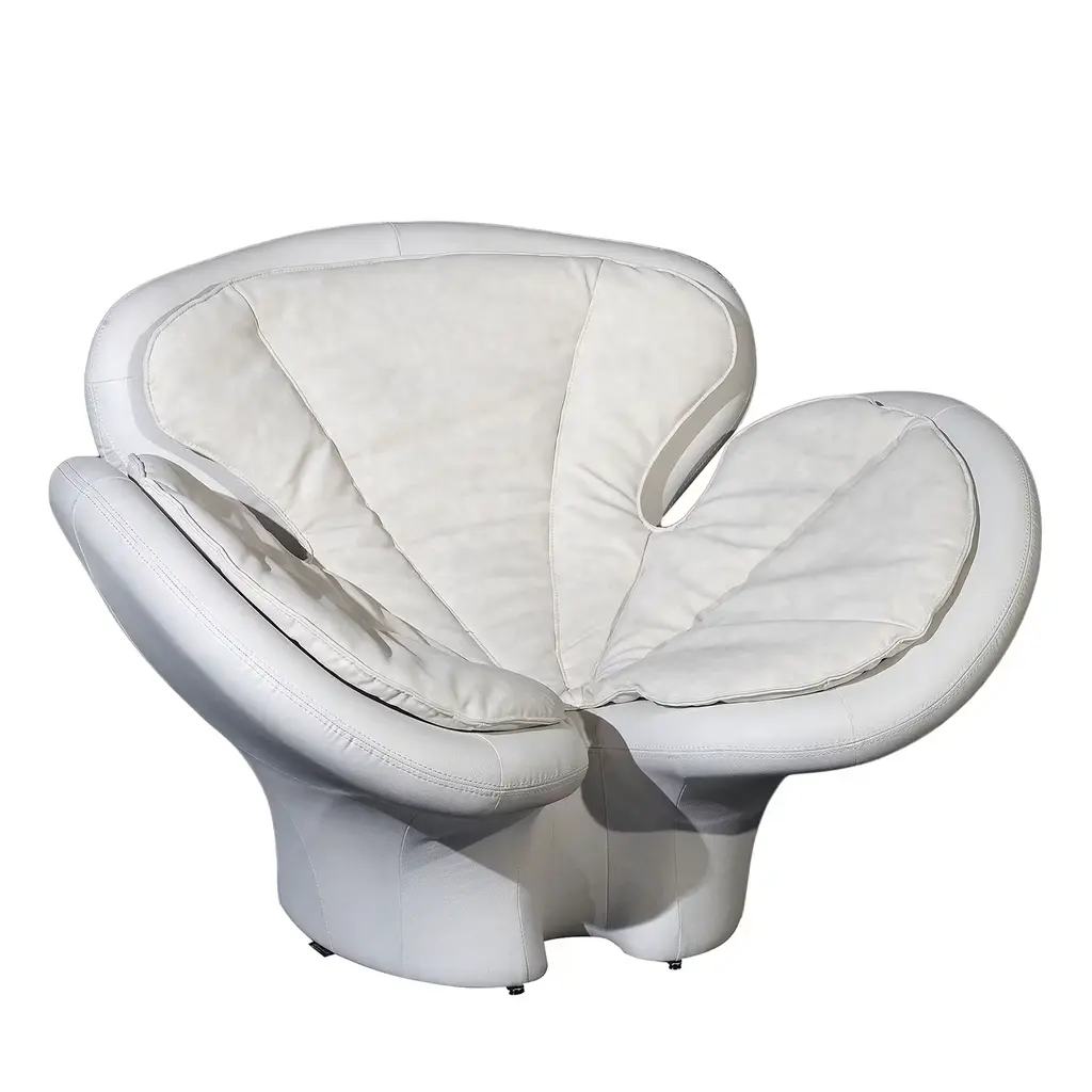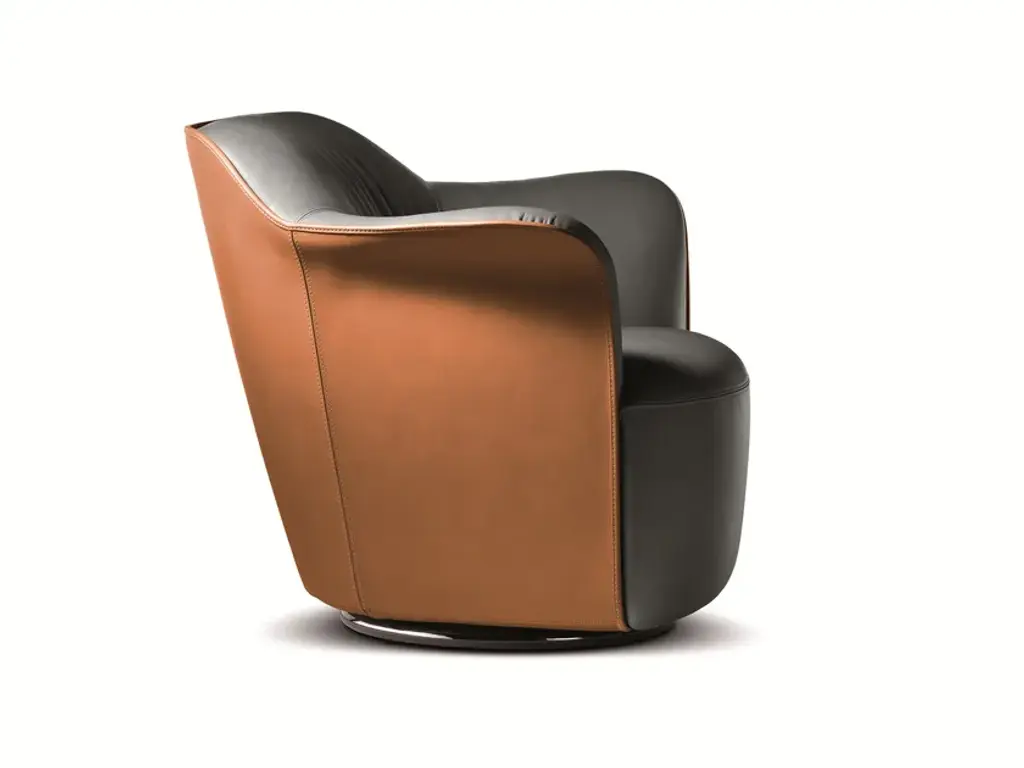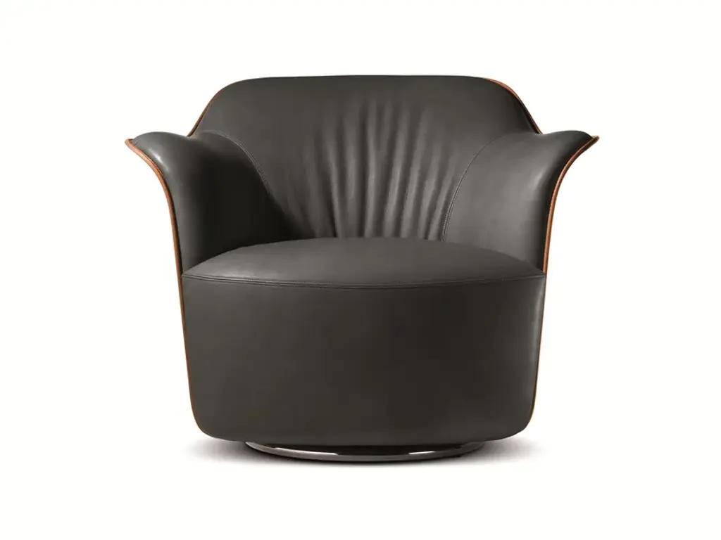 Aida, armchair and swivel armchair, has a soft and graceful design that brings to mind the corolla of a flower. In fact, its armrests open and curve outwards like petals. When designing Aida, Roberto Lazzeroni combined classic construction techniques with contemporary materials and expedients. As with the classic items from the Poltrona Frau archives, the spring system of the seat, made of seasoned beechwood and birch plywood, consists of hand-tied steel biconical springs attached to jute belts. In line with the latest technologies, the backrest shell and seat padding are in moulded polyurethane foam. Alongside the version entirely in Pelle Frau® leather with border piping in leather or grosgrain, the Aida armchair can also pair a Pelle Frau® leather exterior surface with a fabric inside surface (with fabric trim). Another alternative combination is Cuoio Saddle Extra leather for the shell and Pelle Frau® leather or fabric for the inside surface, with trim in Cuoio Saddle Extra leather. The Aida armchair is available in both a fixed and swivel version.