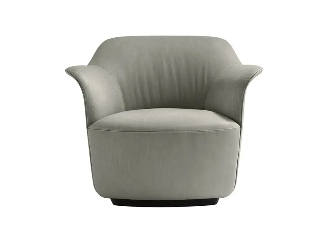 Aida, armchair and swivel armchair, has a soft and graceful design that brings to mind the corolla of a flower. In fact, its armrests open and curve outwards like petals. When designing Aida, Roberto Lazzeroni combined classic construction techniques with contemporary materials and expedients. As with the classic items from the Poltrona Frau archives, the spring system of the seat, made of seasoned beechwood and birch plywood, consists of hand-tied steel biconical springs attached to jute belts. In line with the latest technologies, the backrest shell and seat padding are in moulded polyurethane foam. Alongside the version entirely in Pelle Frau® leather with border piping in leather or grosgrain, the Aida armchair can also pair a Pelle Frau® leather exterior surface with a fabric inside surface (with fabric trim). Another alternative combination is Cuoio Saddle Extra leather for the shell and Pelle Frau® leather or fabric for the inside surface, with trim in Cuoio Saddle Extra leather. The Aida armchair is available in both a fixed and swivel version.