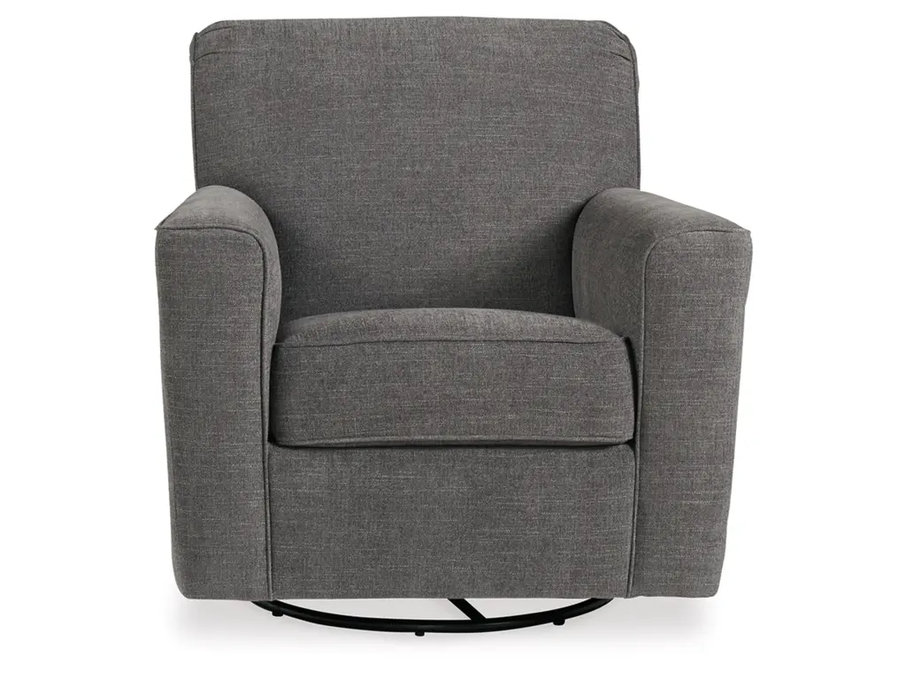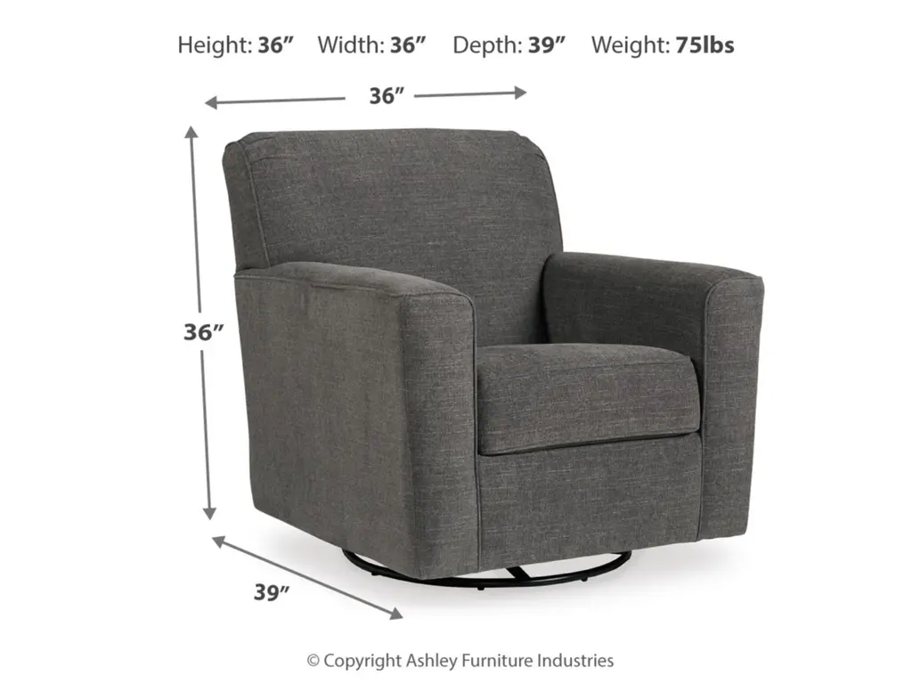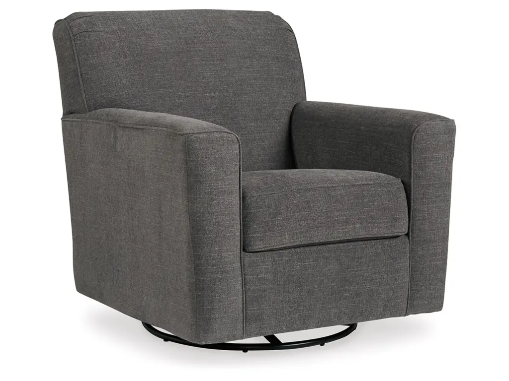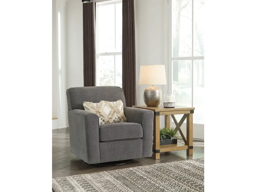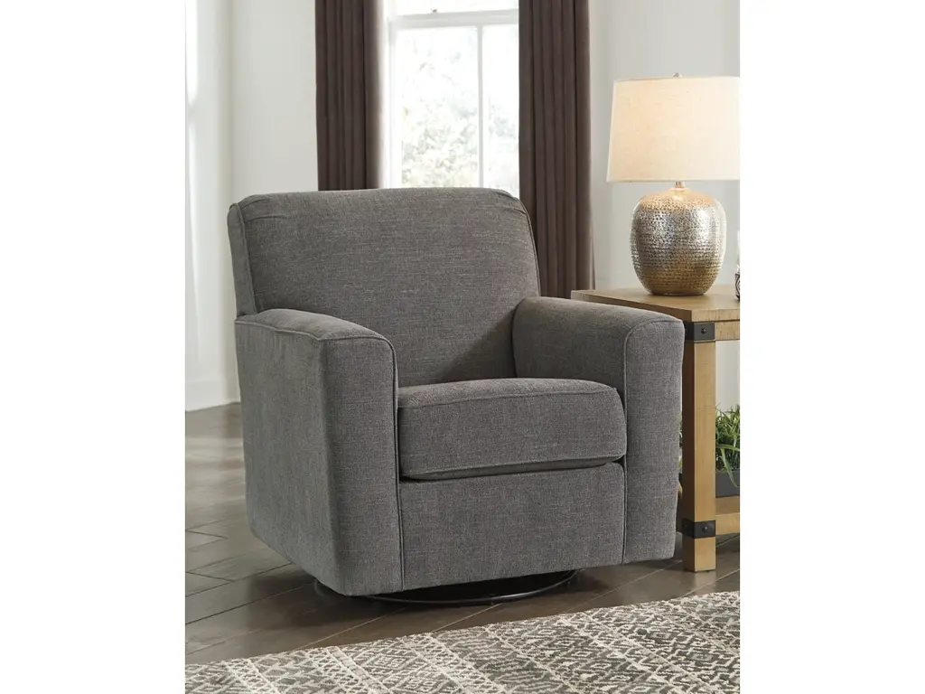 Head-turning, contemporary style and modern comfort are yours for the taking—at a comfortably cool price—with the Alcona swivel glider accent chair in charcoal gray. Gentle gliding motion lets you rock your cares away. Chair’s 360-degree swivel ensures you always have the best view in the house.