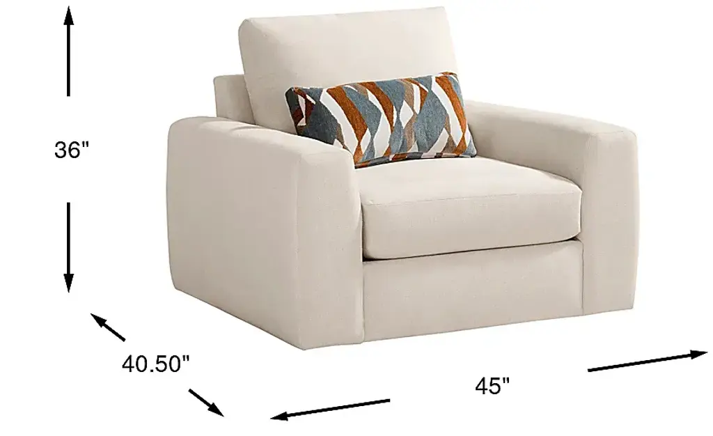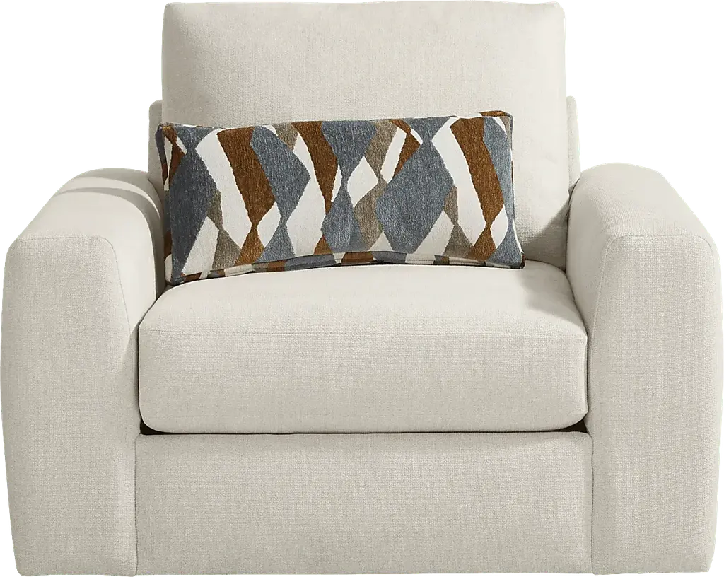 A deep exhale, the noise fades, and calm settles in with the Alexander collection's graceful structure and soothing tones, bringing ease and beauty to the heart of your home. Contemporary in style, this chair is upholstered in ivory white chenille for a clean, versatile look. Subtle curves and sleek track arms add a refined charm, while pillowy deep seating offers cloud-like relaxation. The swivel base brings 360-degree motion, so you can effortlessly stay in conversation from any angle. A coordinating kidney pillow showcases a geometric motif in complementing shades of brown and blue, making a bold yet balanced statement. Upholstery: 100% polyester.