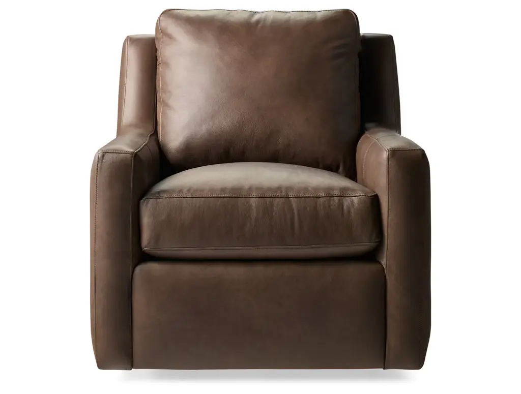 The Allie Leather Swivel Armchair from Rowe Furniture introduces Scandinavian elements through premium leather and precise construction. Made in the USA, its wooden base enables smooth 360-degree rotation, while high-resiliency foam cores provide consistent comfort without harmful chemicals. The armchair’s cloud cushion system maintains its shape through regular fluffing and care. It performs exceptionally in high-traffic areas, fitting naturally in living rooms or office spaces where movement flexibility is desired.