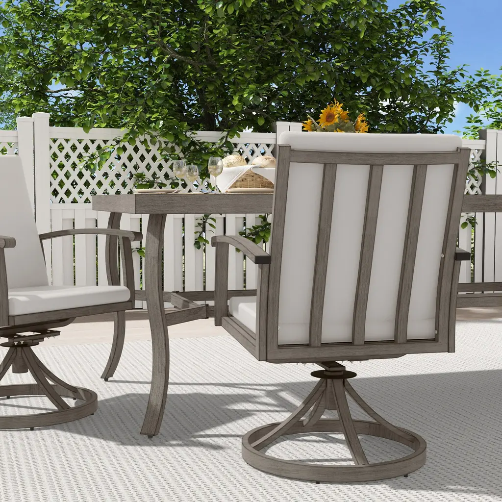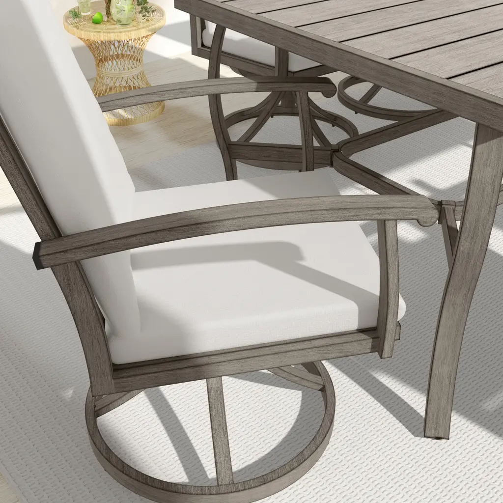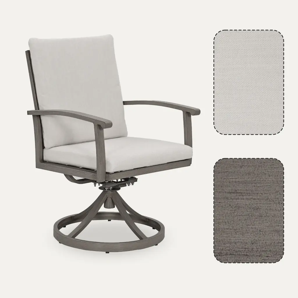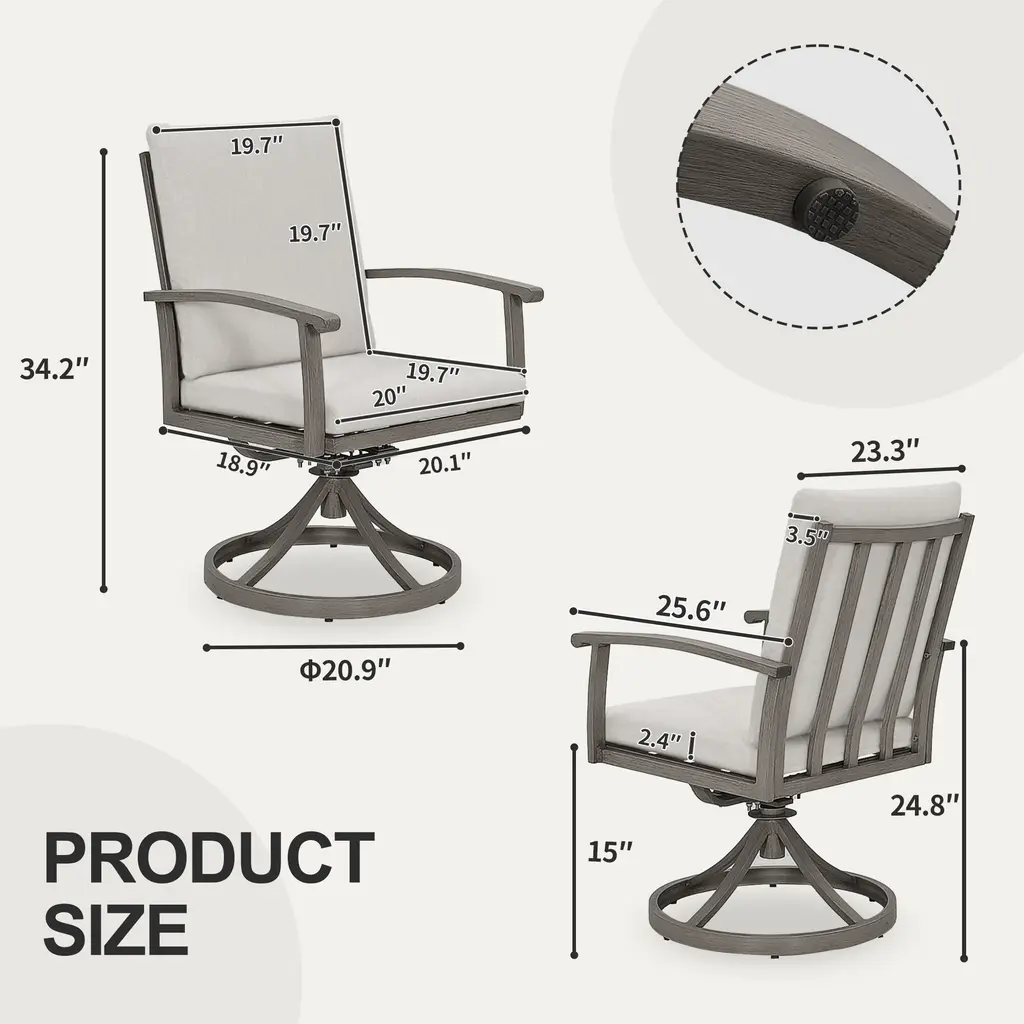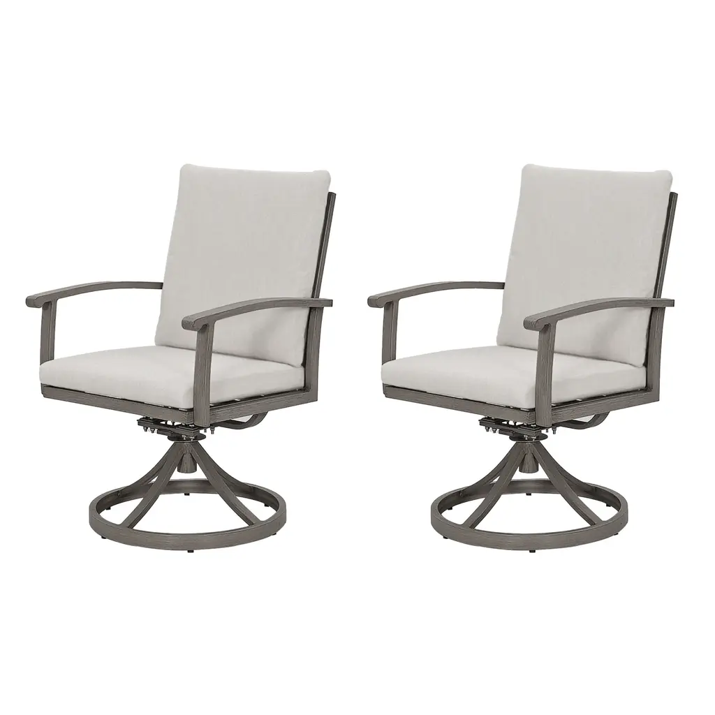 Description:This AluLux 2-Piece Patio Swivel Chairs will create a leisure resort outside your home. The chairs are crafted from high quality aluminum and feature a 360-degree swivel base that allows you to rotate and swivel comfortably. They are highly durable, with high backs and curved armrests for true rest and relaxation. The solid and rust resistant aluminum frame ensures long-lasting outdoor use. Whether it's an outdoor barbecue or a serene sunset, this chair offers comfort, style, and a timeless charm that seamlessly combines durability and aesthetics to enhance any patio or garden setting. Feature:Swivel Chairs - The swivel chairs feature a 360-degree rotating base, allowing you to spin and rock comfortably. They are highly durable, with high backs and curved armrests.Aluminum Frame - Experience the perfect blend of light-weight design and sturdy support with the aluminum frame.Quality Surface - The frame has a smooth and durable finish, with a hand-painted surface that adds to its charm.Comfortable Cushions - The cushions are soft and water resistant, covered with polyester fiber, with zippered covers that are removable and hand washable.Ergonomic Design - Our aluminum outdoor dining chairs have comfortable seats and armrests to make your mealtimes more pleasant.Warm Tip - Please note that slight variations in color may be evident under different lighting conditions. For precise color matching, please refer to the actual items received.Easy Assembly - Detailed assembly instructions and all necessary parts are included; you can scan the QR code on the manual for referring to installation video.Excellent Service - This product is carefully packaged in 1 box; our dedicated team is available to assist with any questions.