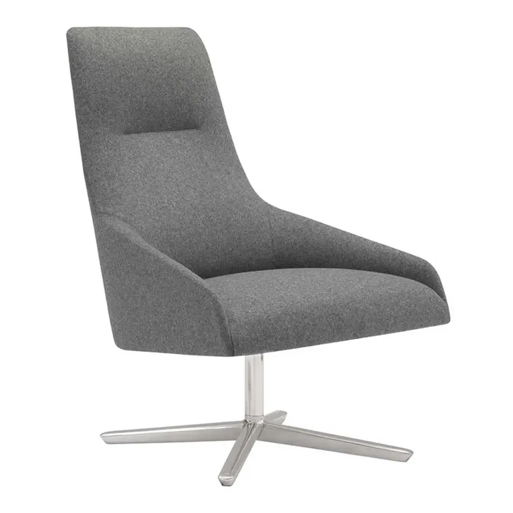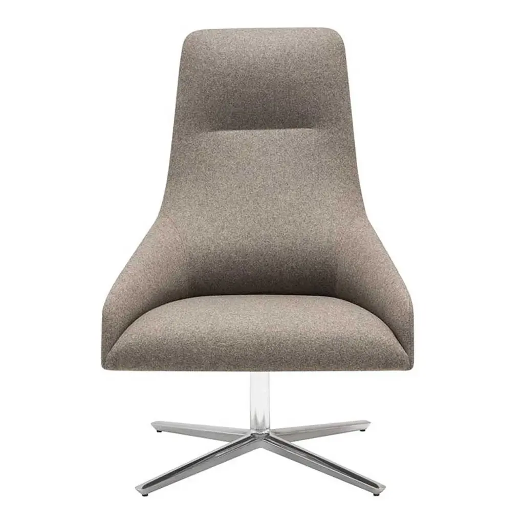 High back lounge chair with upholstered seat and backrest, and a four star aluminum central swivel base, self-return system and finished in polished aluminum, white or black. Optional Tilting mechanism.Alya is a collection of fully upholstered lounge chairs with solid wood or metal bases. Its serene silhouette embraces the body, inviting you to relax into its form. The Alya is born from the lounge chair archetype, but from a completely modern perspective. The design was developed from an ergonomic perspective and is suitable for contract spaces and residential areas alike thanks to its high versatility and two backrest options.