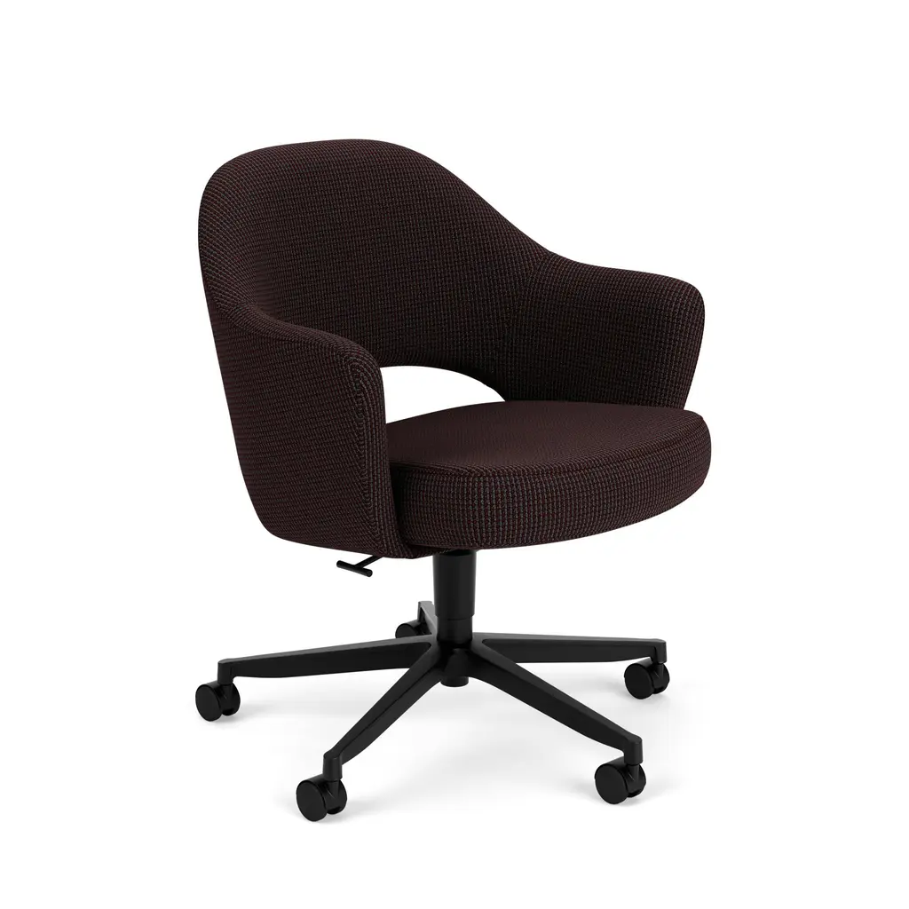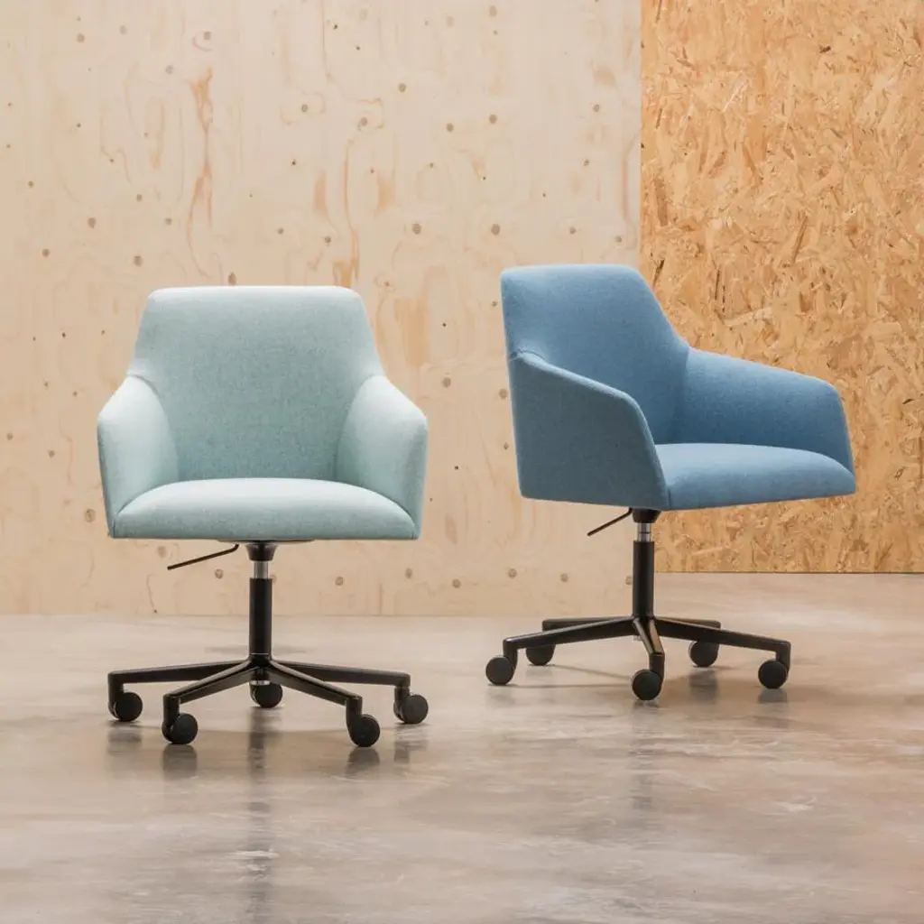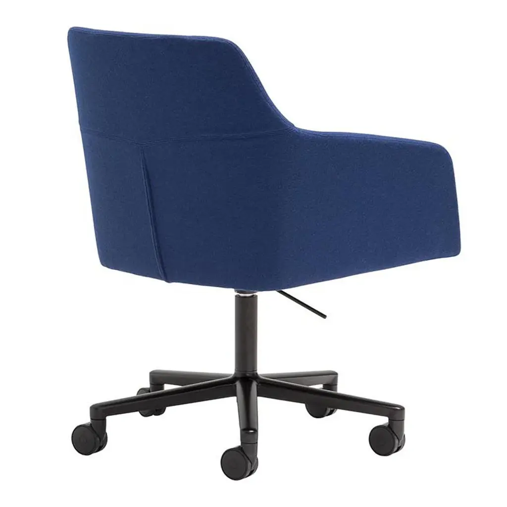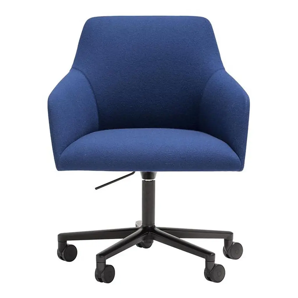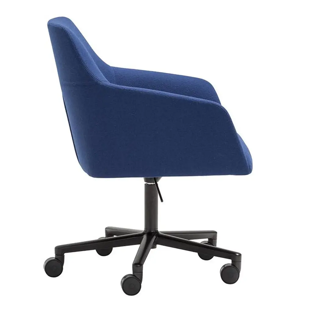 Armchair with upholstered seat and aluminum central base with 5 casters, swivel and pneumatic height adjustment. Available in polished aluminum, white or black. The chair rises up to 5 inches. Optional tilting mechanism. Alya is a collection of fully upholstered lounge chairs with solid wood or metal bases. Its serene silhouette embraces the body, inviting you to relax into its form. The Alya is born from the lounge chair archetype, but from a completely modern perspective. The design was developed from an ergonomic perspective and is suitable for contract spaces and residential areas alike thanks to its high versatility and two backrest options.