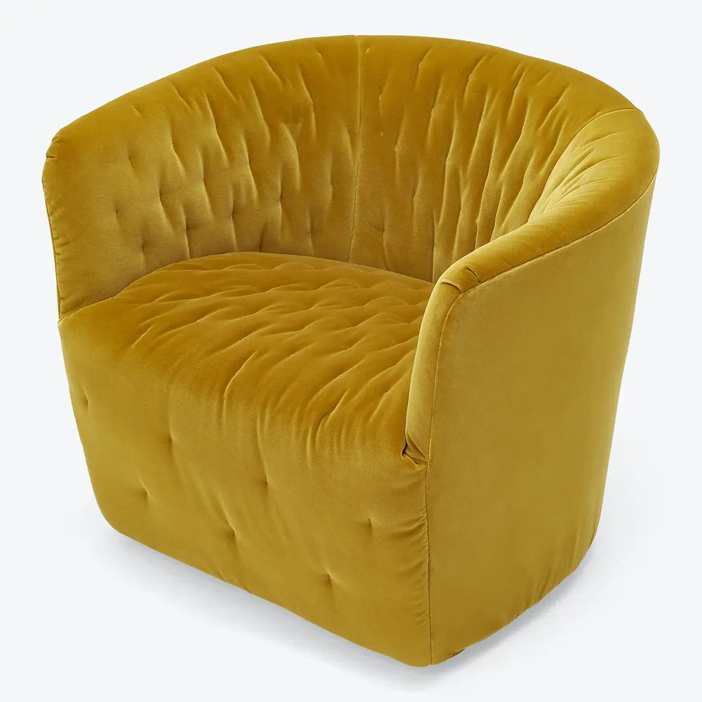 Step into a world of elegance with the Amelia Swivel Chair, a stunning fusion of French haute couture and contemporary design. Handcrafted with meticulous attention to detail, the exquisite quilted stitching enhances its graceful curves, making a striking statement in any room. Measuring 29" in width, 26" in height, and 28" in depth—with a seat height of 16.5" and a seat depth of 20.5"—this chair is compact yet undeniably captivating. Perfect for small living spaces, cozy nooks, bedrooms, and living rooms, the Amelia Swivel Chair fits seamlessly into any environment, adding an air of sophistication and charm. Available in a palette of jewel-toned cotton velvets, the Amelia exudes opulence and style, instantly transforming your ambiance. Its rich colors invite warmth and depth, making it a favorite among ABC customers who appreciate its aesthetic appeal and luxurious feel. The removable slipcover offers effortless maintenance and allows for quick style refreshes, adapting seamlessly to your evolving decor preferences. This feature ensures that your chair remains as versatile as it is stylish, perfect for accommodating changing tastes or seasonal decor updates. With plush foam fill, the Amelia Swivel Chair envelops you in comfort, inviting you to sink in and unwind. Whether you’re hosting guests for an intimate gathering or enjoying a quiet moment with a good book, this chair creates a cozy atmosphere that enhances every occasion. As a designer piece, the Amelia not only serves as a practical seating solution but also as a chic accent that elevates your home decor. Its whimsical charm captivates the senses, making it a delightful addition to any interior. Transform your living space with the Amelia Chair, where style meets comfort in perfect harmony. Visit us at ABC Carpet and Home, 888 Broadway, to work with a design specialist who can help you explore different colors and textiles, ensuring that your selection perfectly complements your unique style. Discover the allure of the Amelia Swivel Chair and elevate your home with a piece that resonates with sophistication and charm, making it a cherished favorite among those who appreciate the finer things in life.