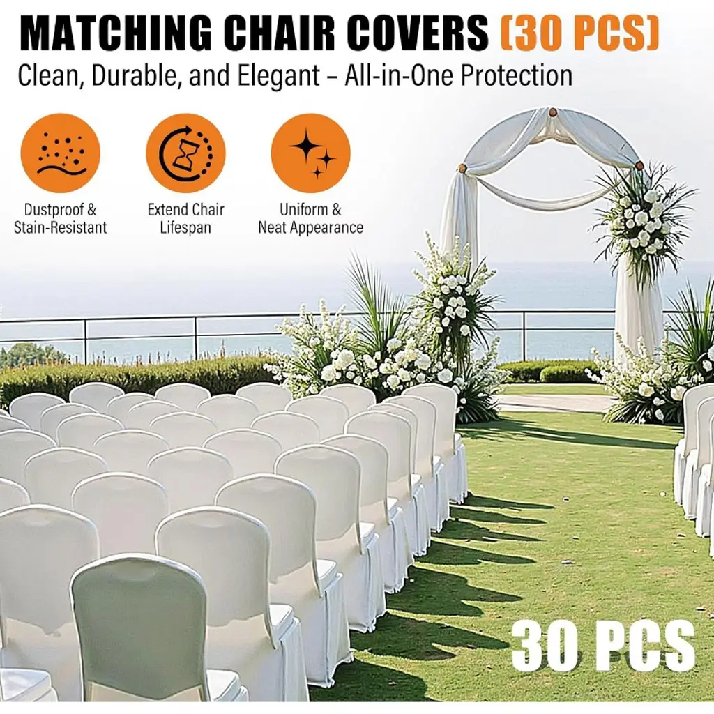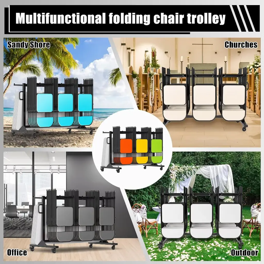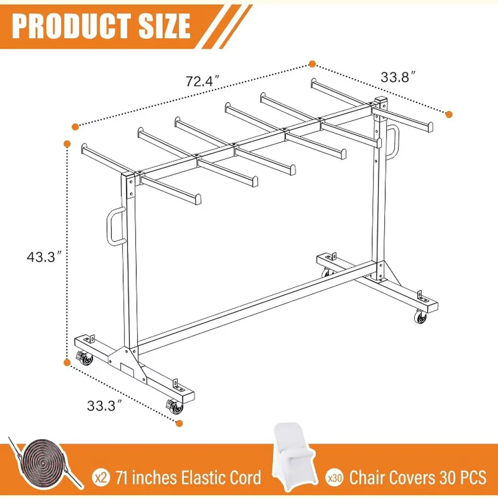 This high-capacity folding chair rack is designed to hold up to 42 chairs or 12 tables, with 30 chair covers included for neat and organized storage. Built with reinforced crossbars and triangular support plates, it offers enhanced stability and can handle up to 1100 pounds with ease. The rack features 360° swivel PU wheels, ensuring smooth movement on various surfaces, with two lockable wheels to secure the cart in place, perfect for events like weddings, meetings, or church gatherings. The Oxford fabric dust cover keeps the rack clean, and elastic cords prevent movement when not in use. Assembly is quick and simple, taking just 20 minutes with the included instructions and hardware. Our team is always available for any assistance you may need during setup.