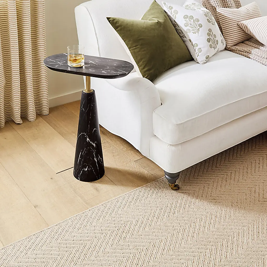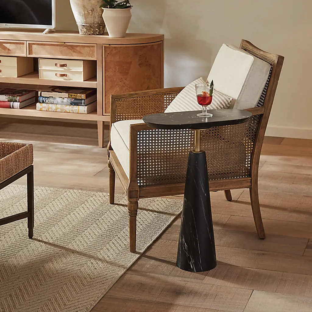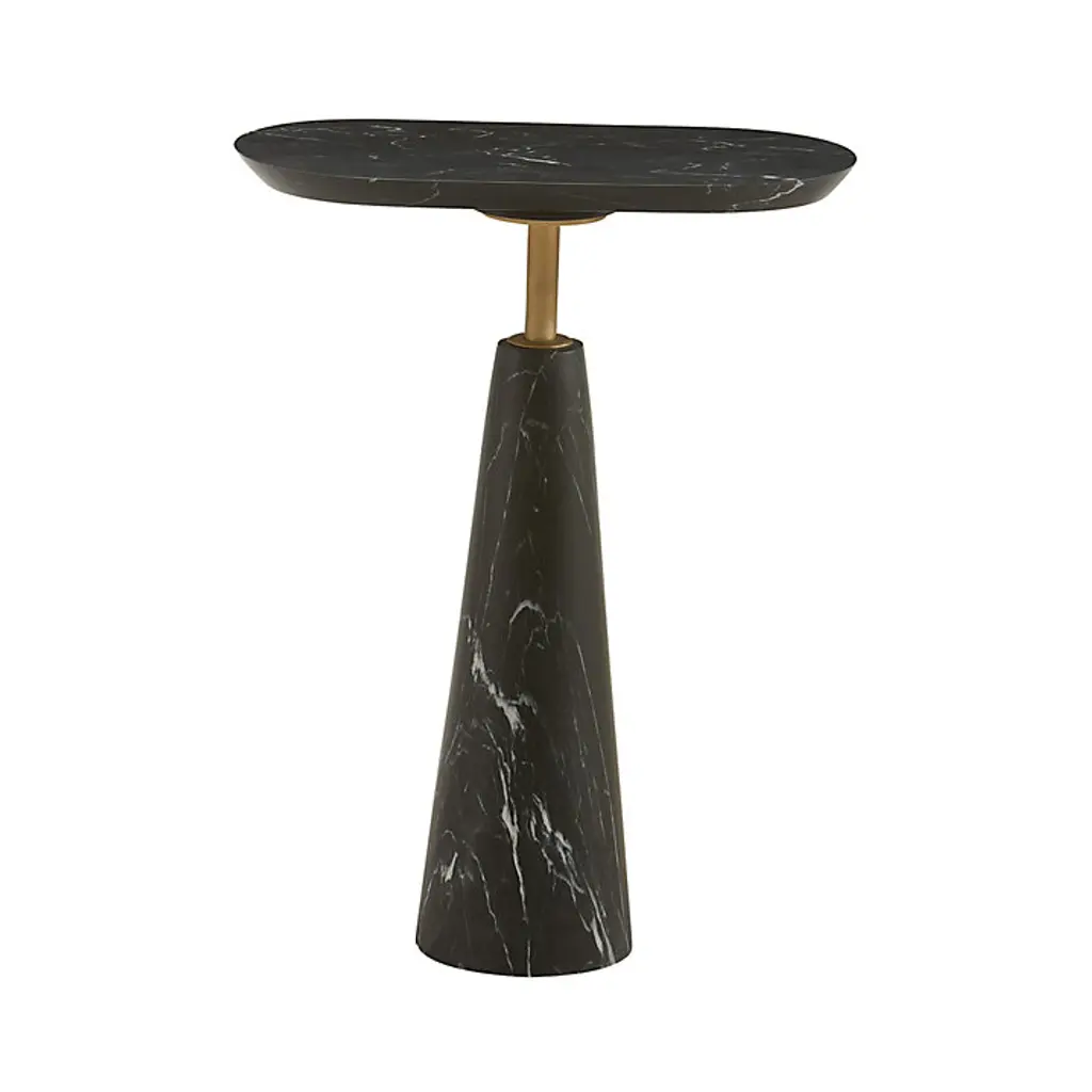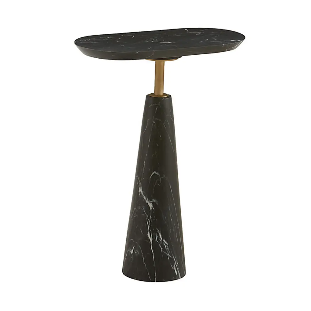 A chic chairside companion for your living room, bedroom, or home office. Our stunning Andie Side Table is handmade of heavy, natural soap stone. The racetrack top is sculpted from a single piece of richly veined, black soap stone for dramatic movement, and swivels a full 360 degrees atop an antique brass stem, making it easy to share space and drinks. The cylindrical base is cut from a heavy piece of solid black soap stone for sophisticated contrast. Expect beautiful variations in the stone's natural tone and veining. Andie Side Table features: