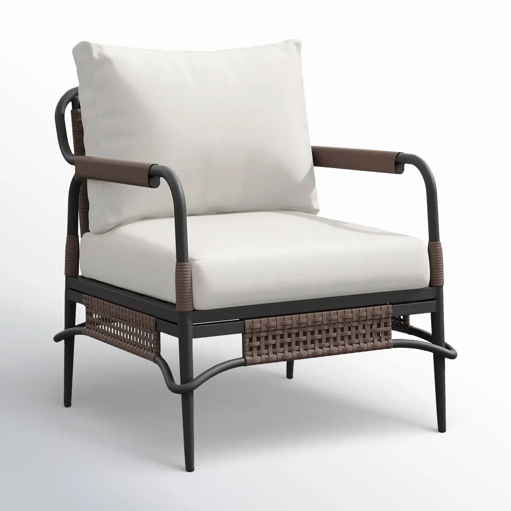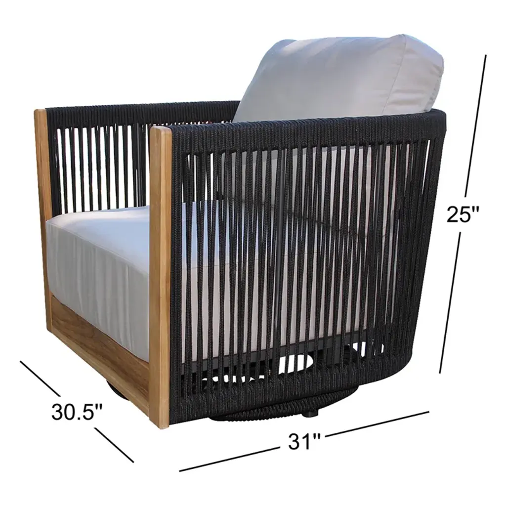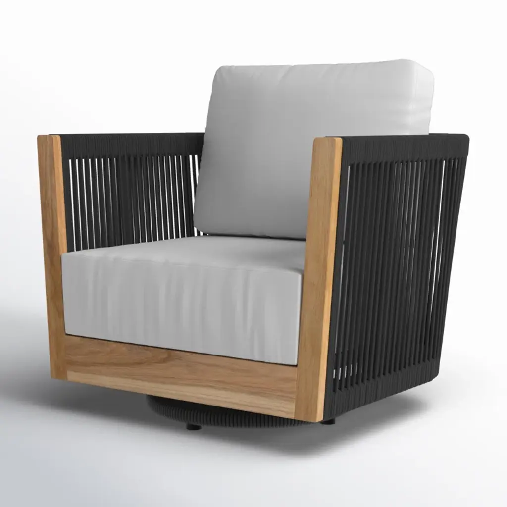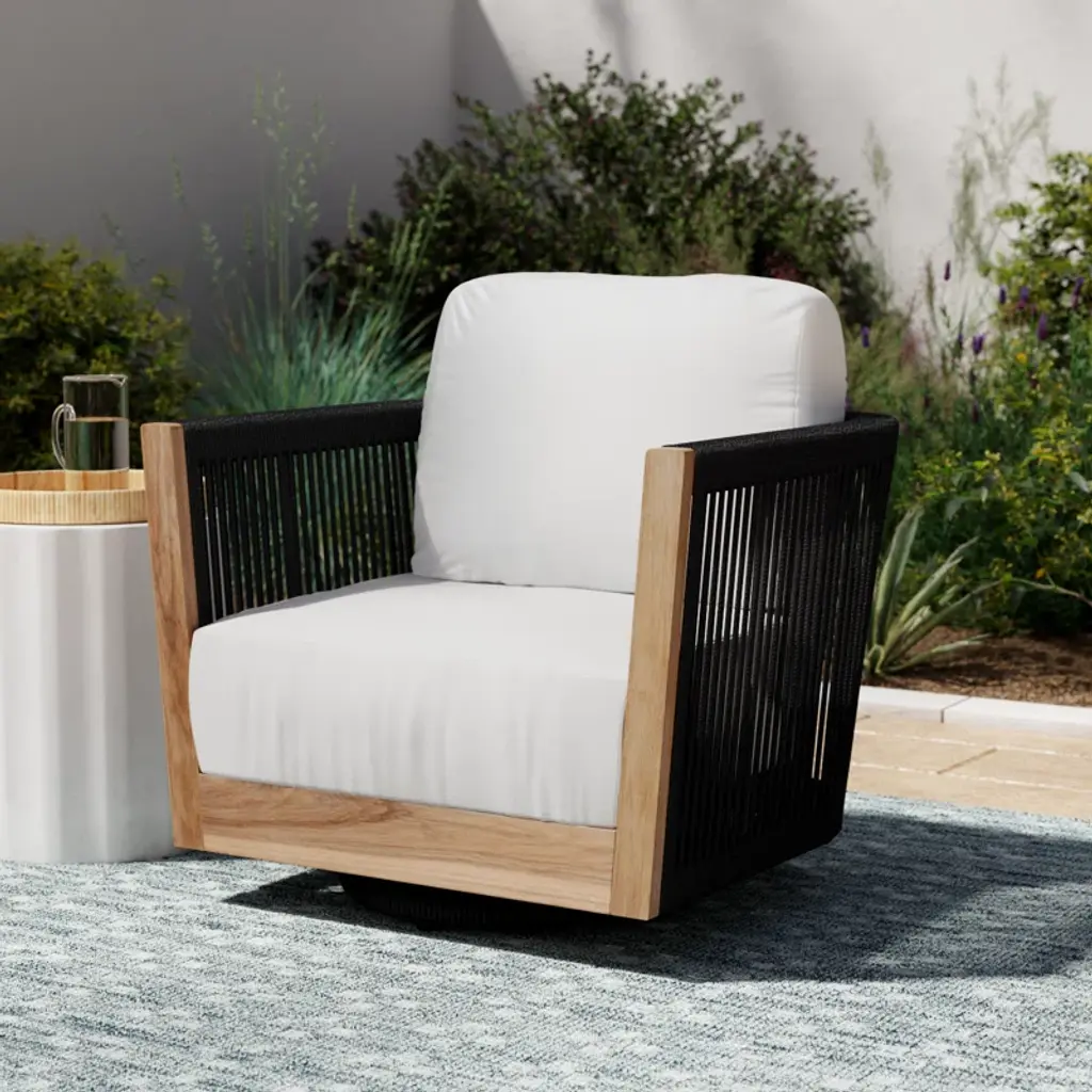 You’re free to turn in all directions when sitting in our swivel armchair. It has a kiln-dried teakwood frame with a warm beige finish that adds a hint of rustic charm. Plus, black nylon rope lines the curved silhouette for a breezy vibe. The UV- and water-resistant Sunbrella® cushions come in a muted shade, while foam padding gives you all the support you’ll want for lazy weekend lounge sessions.