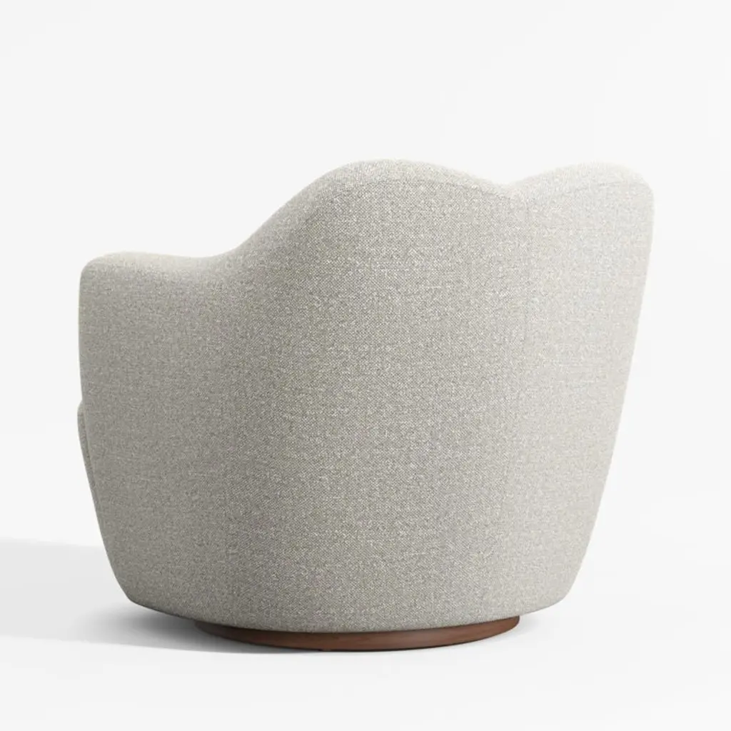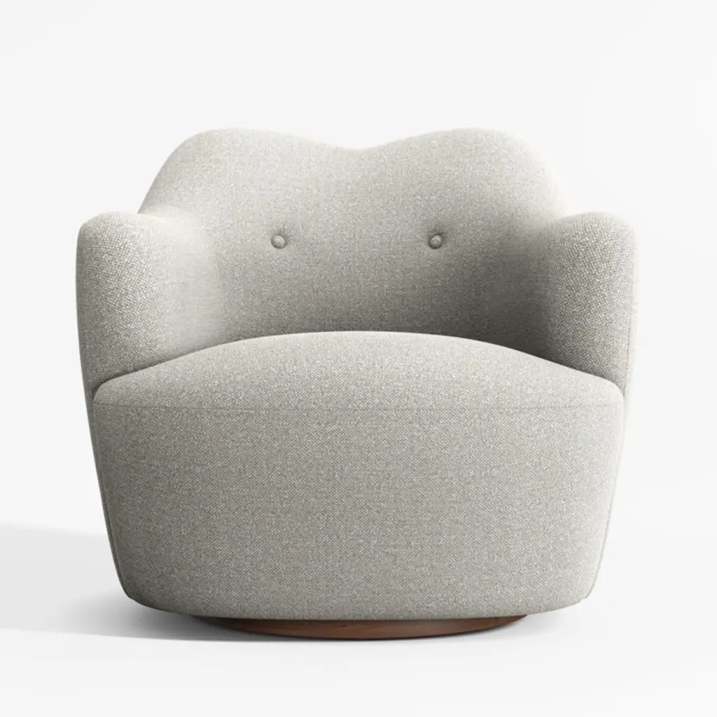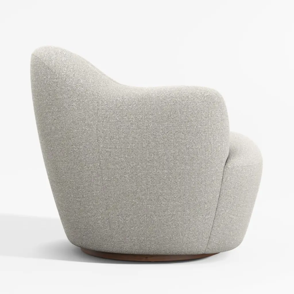 Inspired by Swedish modern design, Apero pairs cozy curves with pillowy contours. The fully upholstered chair embraces with rounded arms that flow into a subtle camel back accented with two button tufts. The seat cushion wraps snuggly around the arms for curl-up comfort and a rounded silhouette. Providing a full 360 degrees of swivel, the round recessed plinth base lightens the look with a peek of oak veneer. Hugging all the softness is a durable fabric in light grey flecked with hints of tan and blue and woven like a fine Scottish tweed.