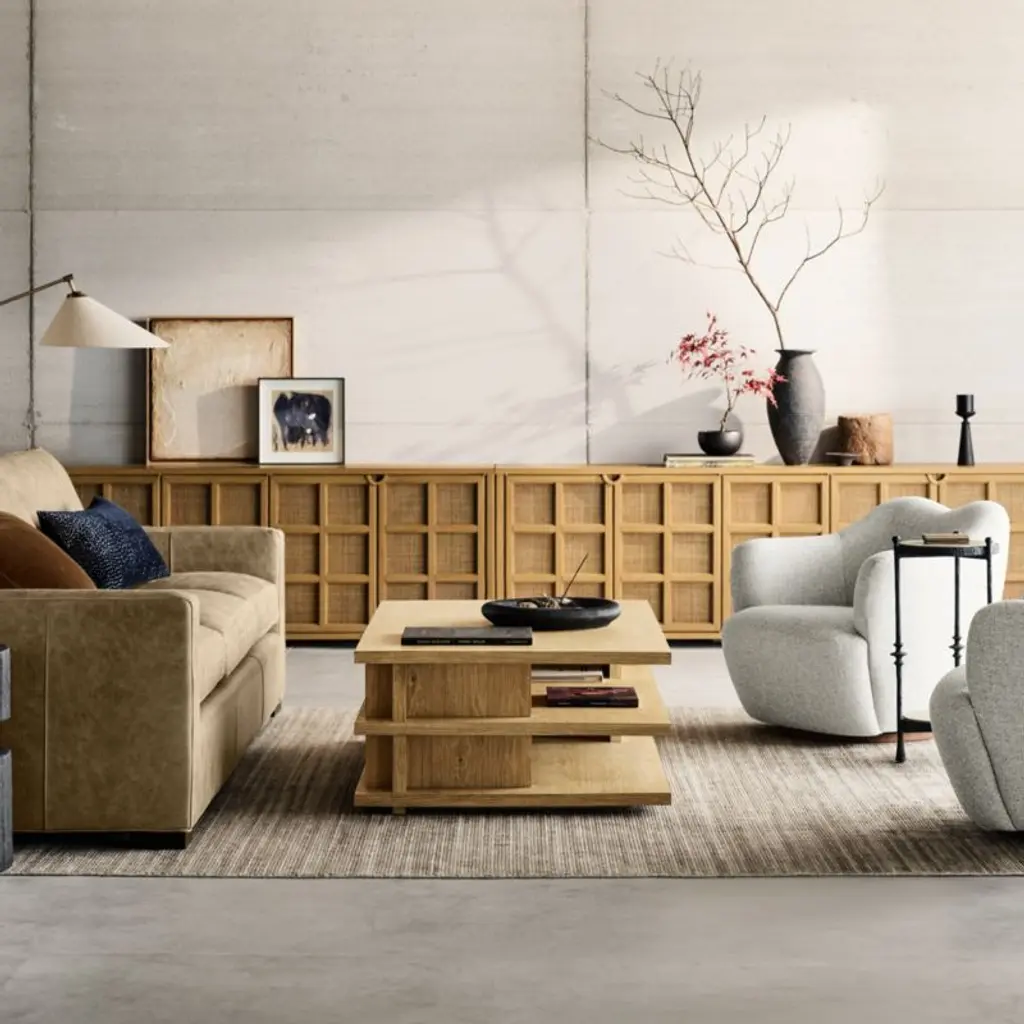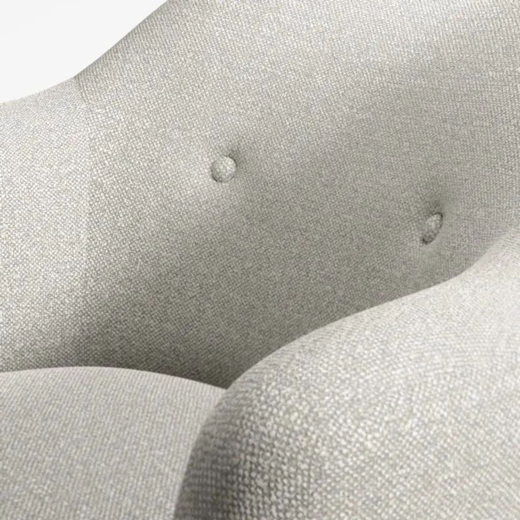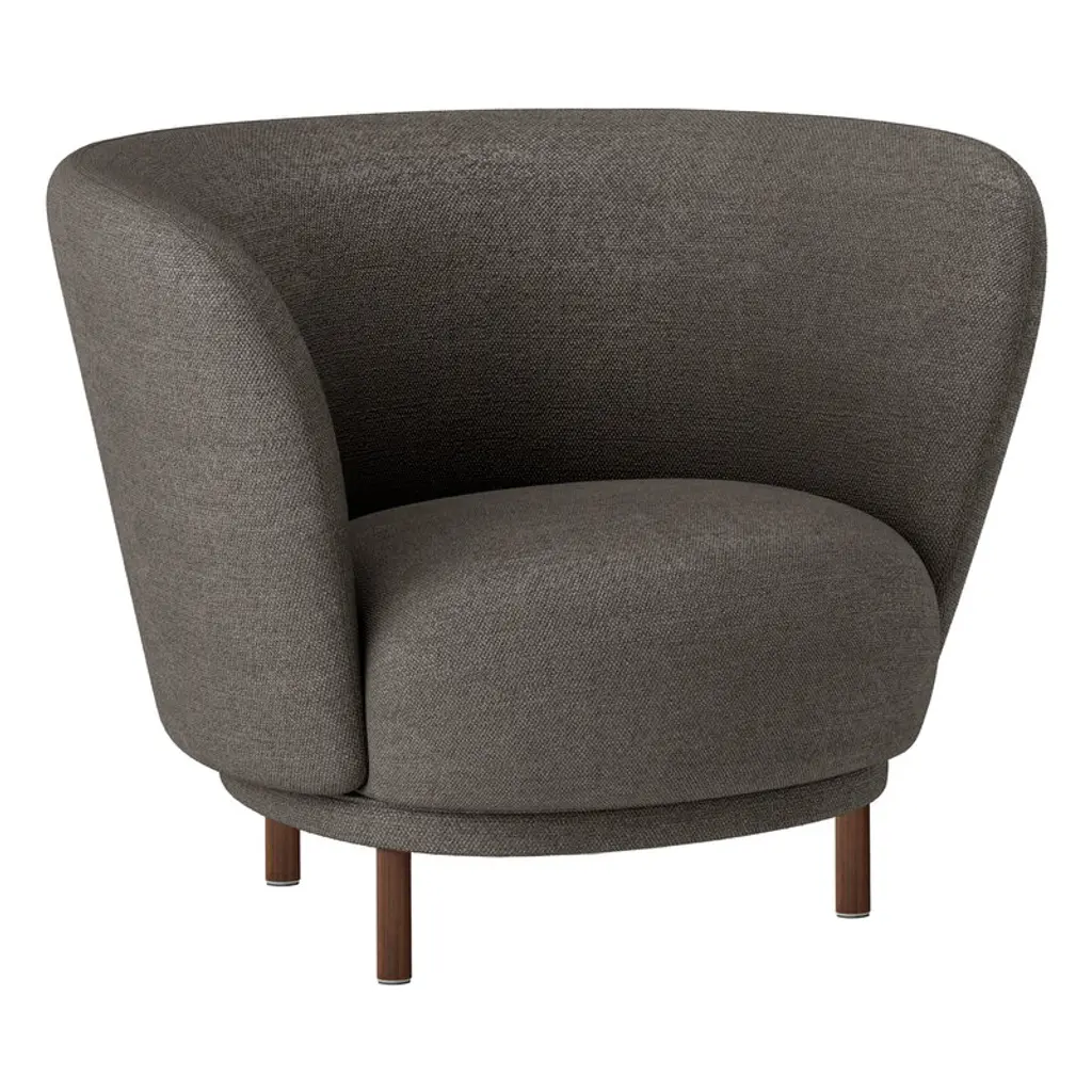 Inspired by Swedish modern design, Apero pairs cozy curves with pillowy contours. The fully upholstered chair embraces with rounded arms that flow into a subtle camel back accented with two button tufts. The seat cushion wraps snuggly around the arms for curl-up comfort and a rounded silhouette. Providing a full 360 degrees of swivel, the round recessed plinth base lightens the look with a peek of oak veneer. Hugging all the softness is a durable fabric in light grey flecked with hints of tan and blue and woven like a fine Scottish tweed.