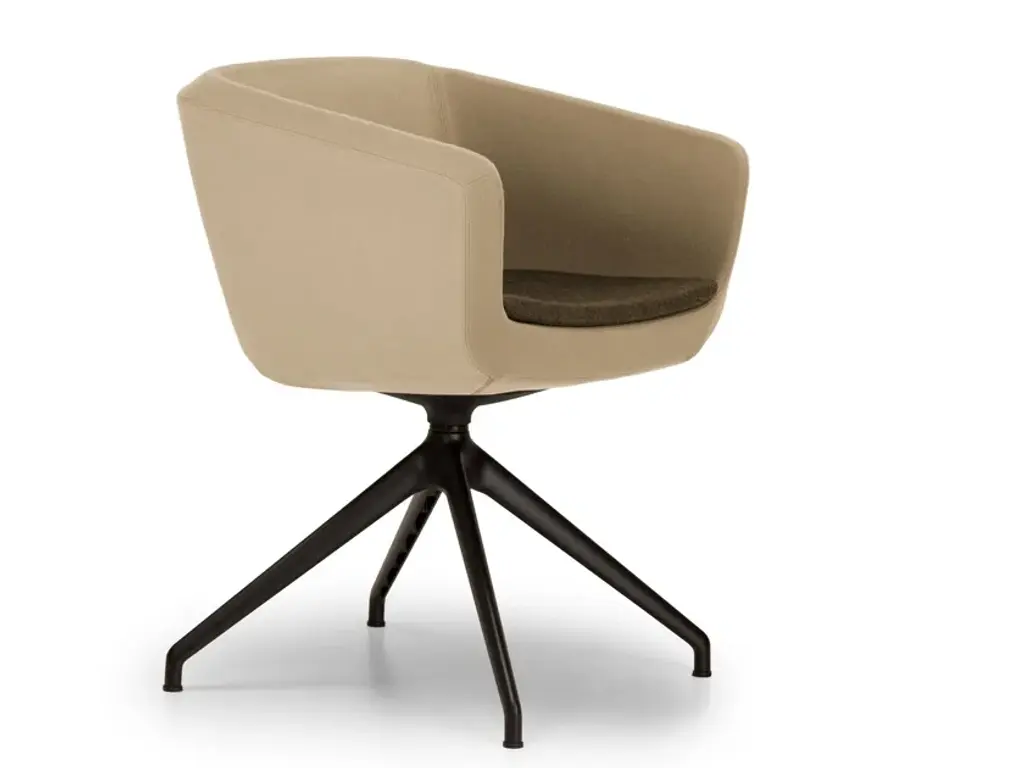 Arca Small is a swivel chair with armrests. Steel internal frame covered withhard injection molded polyurethane foam. Upholstery in fabric or leather (see color chart).Coming from Studio Orlandini’s inspiration, Arca defines a new concept of armchairs and chairs for lounges and waiting areas.It is available in 3 declinations, which can be combined to many base typologies. The family consists of lounge, small and mini versions to meet all the needs of seats for different types of environments, from the fast waiting room to the relaxation area, from the informal meeting area to the conference table, while maintaining stylistic consistency between the environments. The ability to play with colours thanks to the two-tone coating is the peculiarity shared by all the models in the collection, and combined with the numerous types of bases allows a great opportunity for customization.