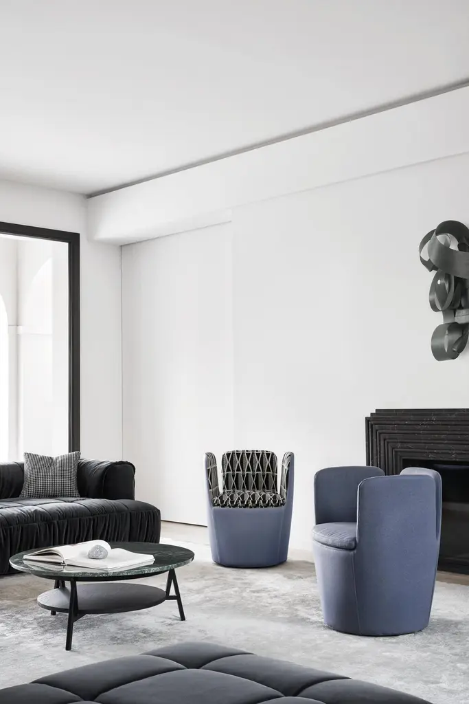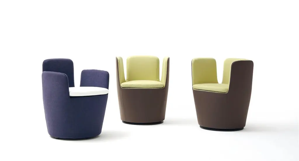 "Mojo" is a type of magic charm, the word originates from Africa, where it means "soul" or "life-force", on which the design of this armchair is based.Additional information:Materials: Upholstered seat and backrest with high armrest and black painted swivelColor: Outside Divina MD 363 - Inside Divina MD 203, T5Structure : Steel Springing : Elastic strapsSeat and backrest upholstery : Shaped polyurethane with differentiated density / polyester slip coverBase: Black painted swivelCover : Fabric or leatherDimensions: W. 63 x D. 59 x H. 76 cmSeat height: 47 cmArmrest: HighAvailable in different armrest option : LowAvailable in other upholstery options: Aran, Cabas, Etoile, Boucle, Cherie, Lama, Blog, Hero, Soho, Steelcut2, Brest , Gamma, VegaAvailable in different base options: Black painted feet in high and low armrest versions
