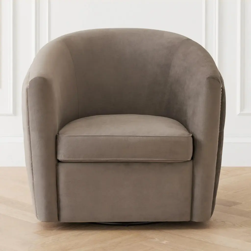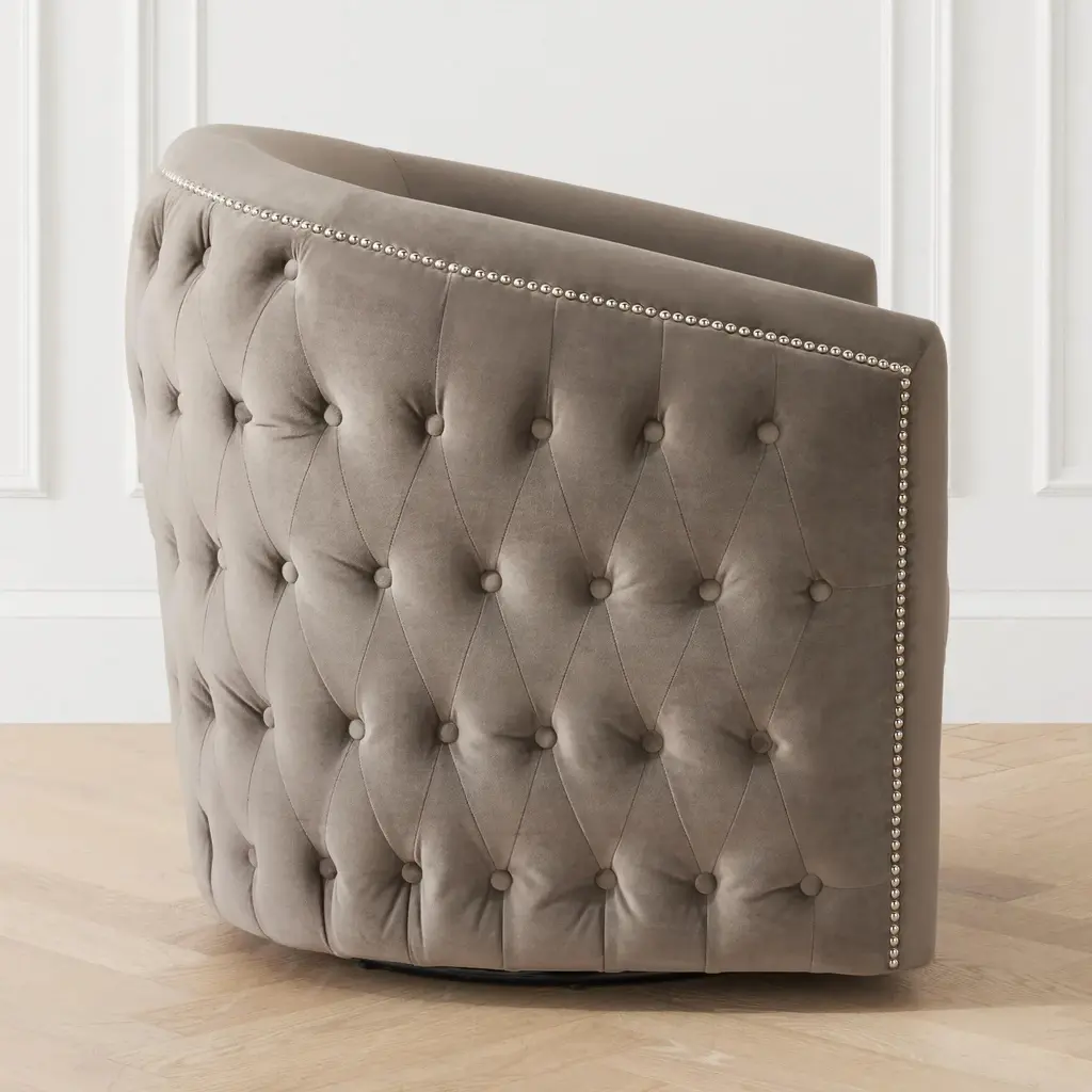 Offering style at every angle, our Aria chair is framed in kiln-dried hardwood with a classic barrel silhouette and convenient swivel feature. Choose from channeled, pleated, or tufted tailoring in over 20 gorgeous fabrics for a look you’ll love. Shown in Bella Velvet Otter with bright nickel nailheads.Z Gallerie exclusive Customize it! Available in over 15 fabrics. Custom Orders: Custom Furniture is manufactured especially for you, which is why we do not accept cancellations, exchanges, or returns.
