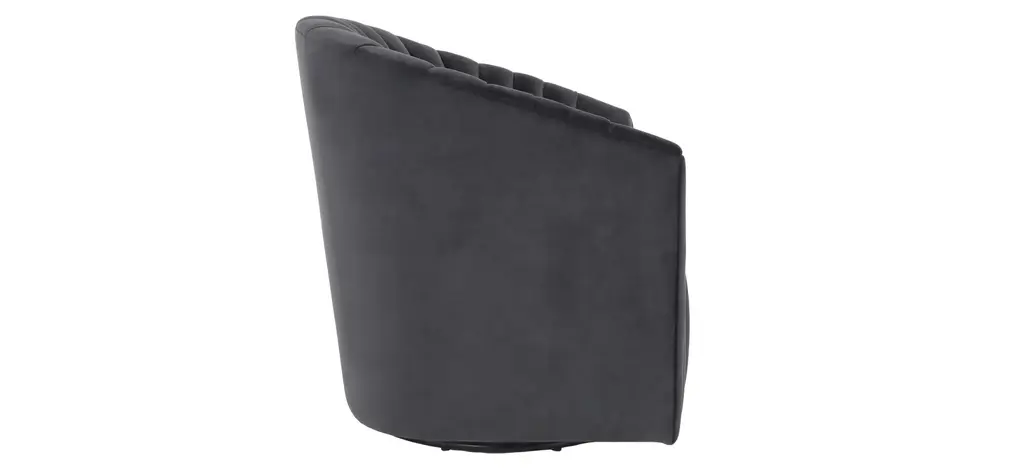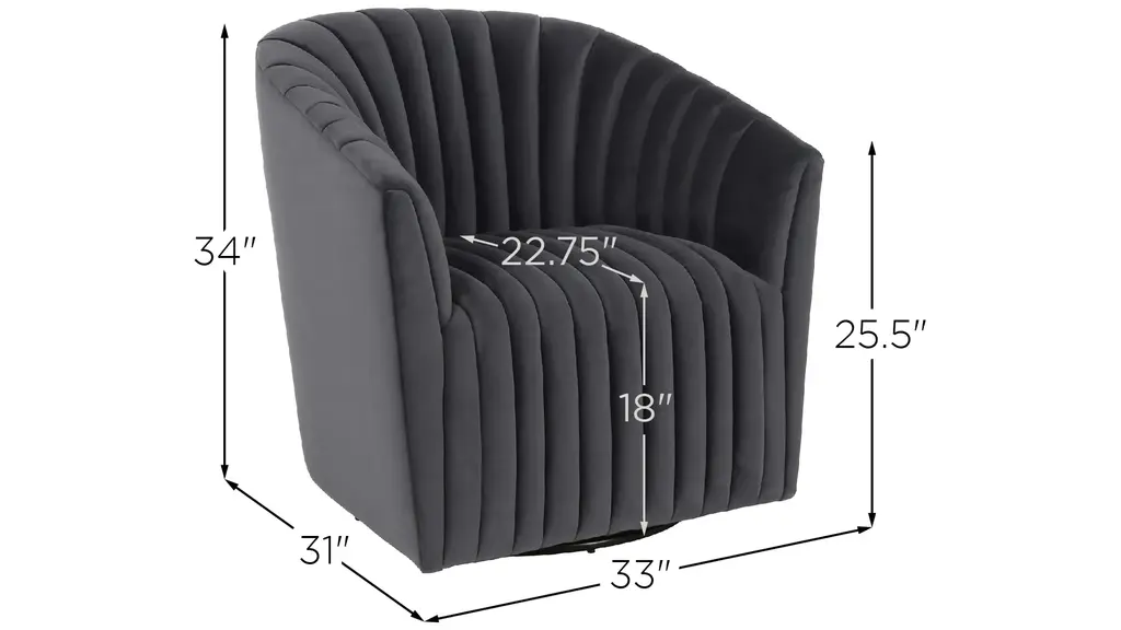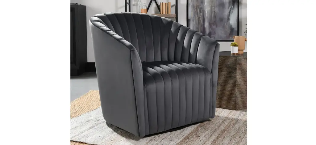 Arline Swivel Accent Chair give your space a touch of vintage influence with this accent chair featuring a retro barrel shape accented with channel tufting. With its smooth swivel action and deep, curved seat, this chair makes an inviting addition to any space.