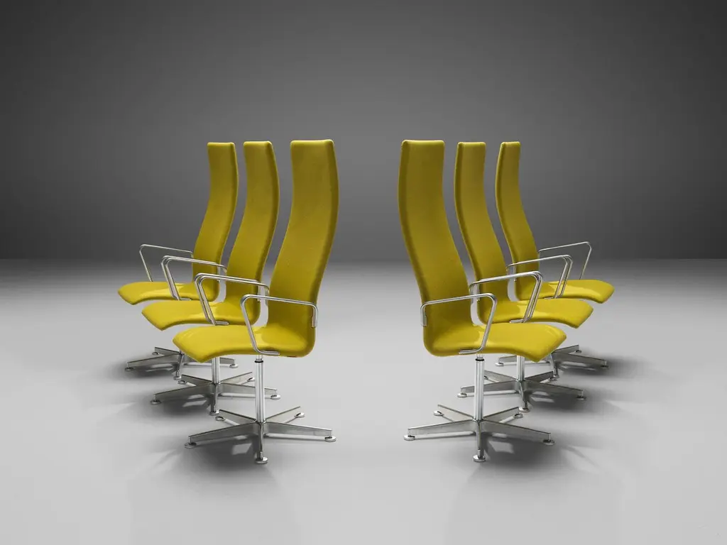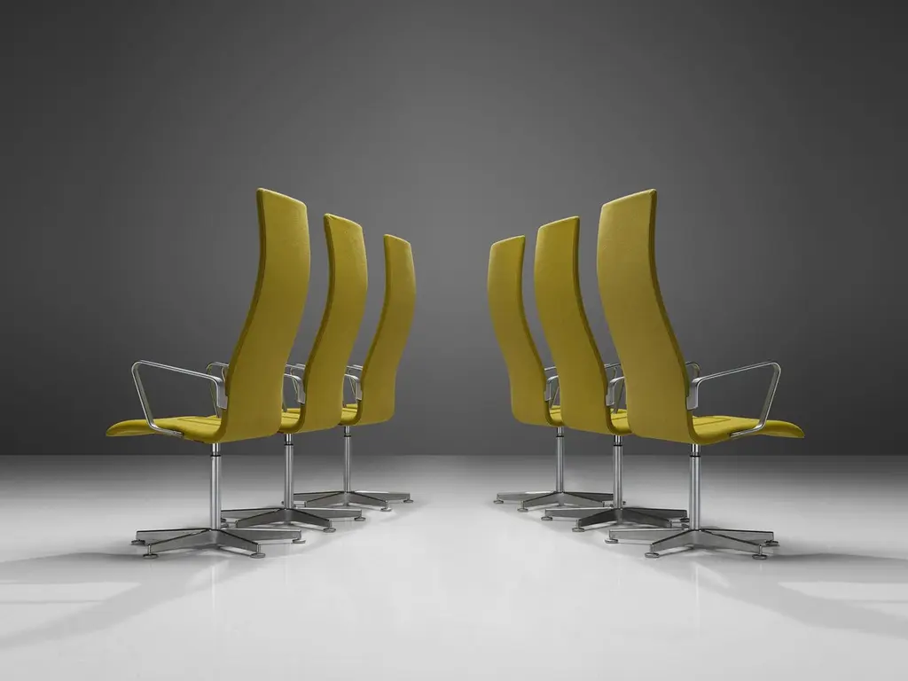 Arne Jacobsen for Fritz Hansen, set of six 'Oxford' desk chairs model 3272, aluminium, wood, fabric upholstery, United Kingdom, design 1965, later production.The original version of the 'Oxford' chair was designed for the professors at St. Catherine’s College in Oxford. Later on Arne Jacobsen developed the design into different models. The 3272 features an extra high back that shows an organic line and floats over into the seat. This shell is built out of moulded wood covered with foam and upholstered in green fabric. The armrests as well as the five-star base with round toes are shown in satin-polished aluminium.Please note that these chairs are in good, used condition. Reupholstery can be done before shipping by our experienced craftsmen and -women in our own in-house restoration atelier. With high attention for the original, they make sure every piece contains its value and is ready for the many years to come. We kindly ask you to contact our design experts for further information about the endless possibilities our restoration and upholstery atelier has to offer. Of course, a locally organized reupholstery is possible as well.