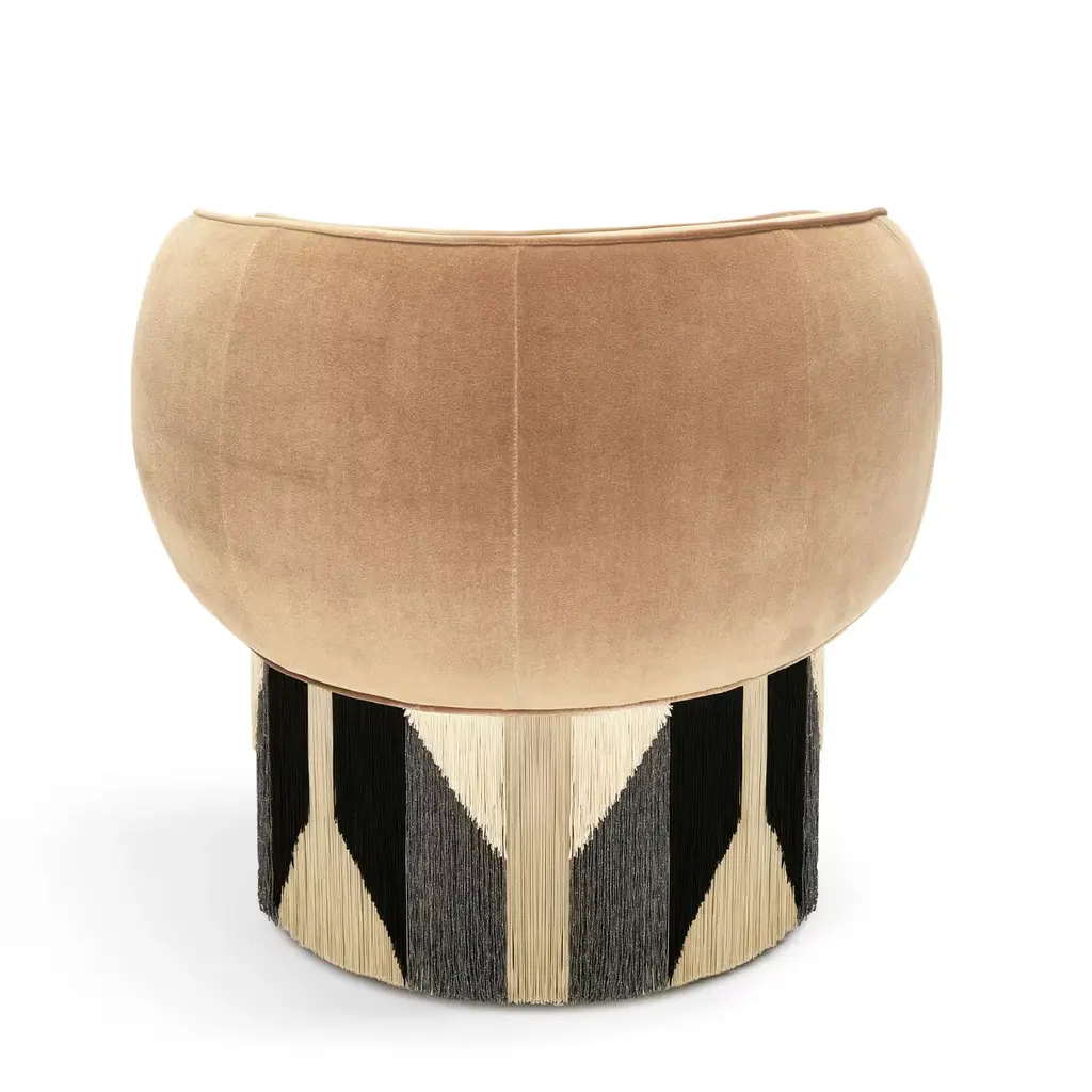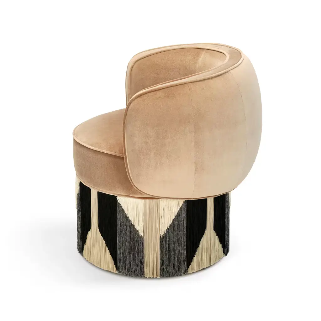 Distinguished by its plush and sophisticated design, the Pirouette swivel armchair from the Treasure Collection embodies luxury and style. With elegant beige seating adorned by dramatic black and lurex grey accents, its Art Deco-inspired fringes add an ivory hue that enhances light. This chair's blend of chevrons, mirrored shapes, and stepped forms evokes the elegance of the roaring twenties. Extended with a lush selection of multi-colored velvet, it promises both opulence and comfort. Each bespoke piece is stamped on the bottom of the pouf’s lining and personally signed, numbered, and dated by designer.