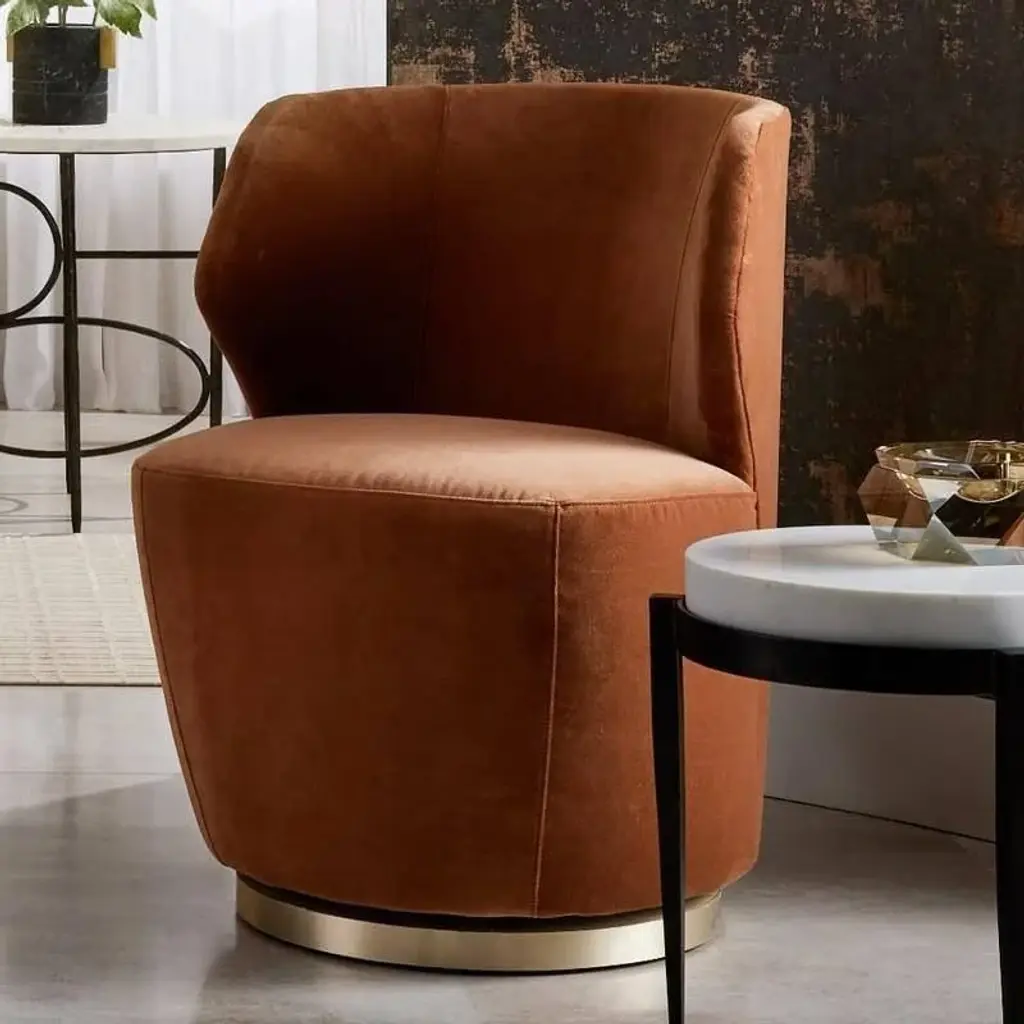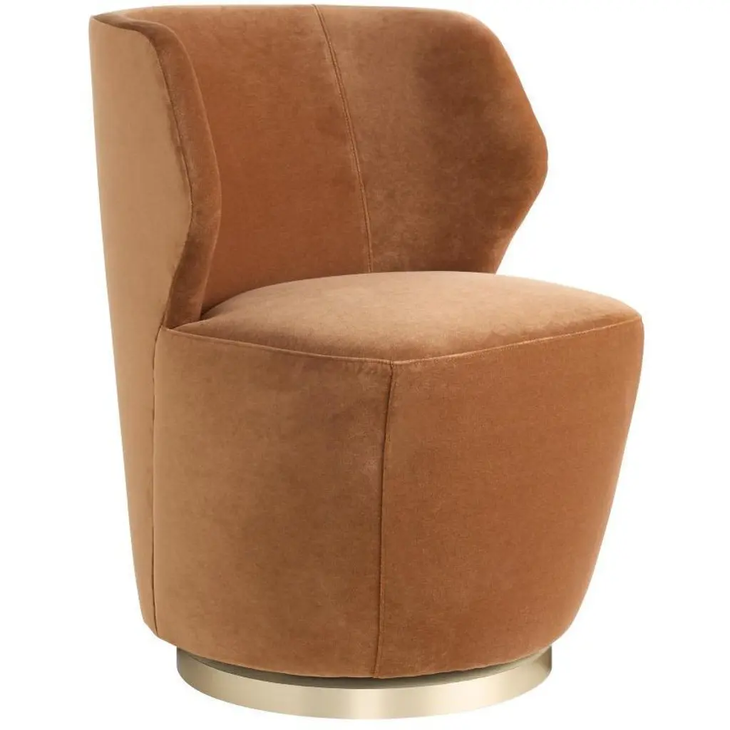 Beautiful from every angle, this wing-armed swivel is scaled for smaller spaces, which makes it both versatile and visually impactful. The low, angular Poppy chair is upholstered in sumptuous cider velvet and rests on a champagne iron plinth, creating a seat that’s as elegant as it is comfortable.