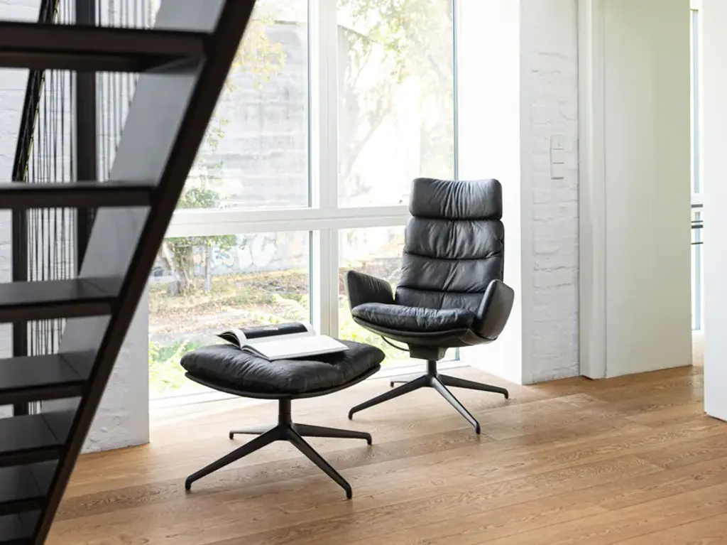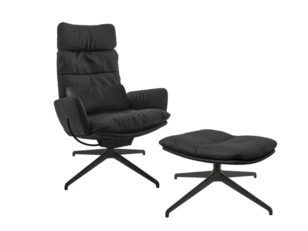 ARVA LOUNGE is an upholstered footrest in leather or fabric on a swivel base in painted metal.The lounge chair's ottoman of the same name has a clear message. Put your feet up and relax. It is the extra portion of cosiness in a harmonious design. The identical upholstery material and the same base frame allow the lounge chair and ottoman to merge into one.
