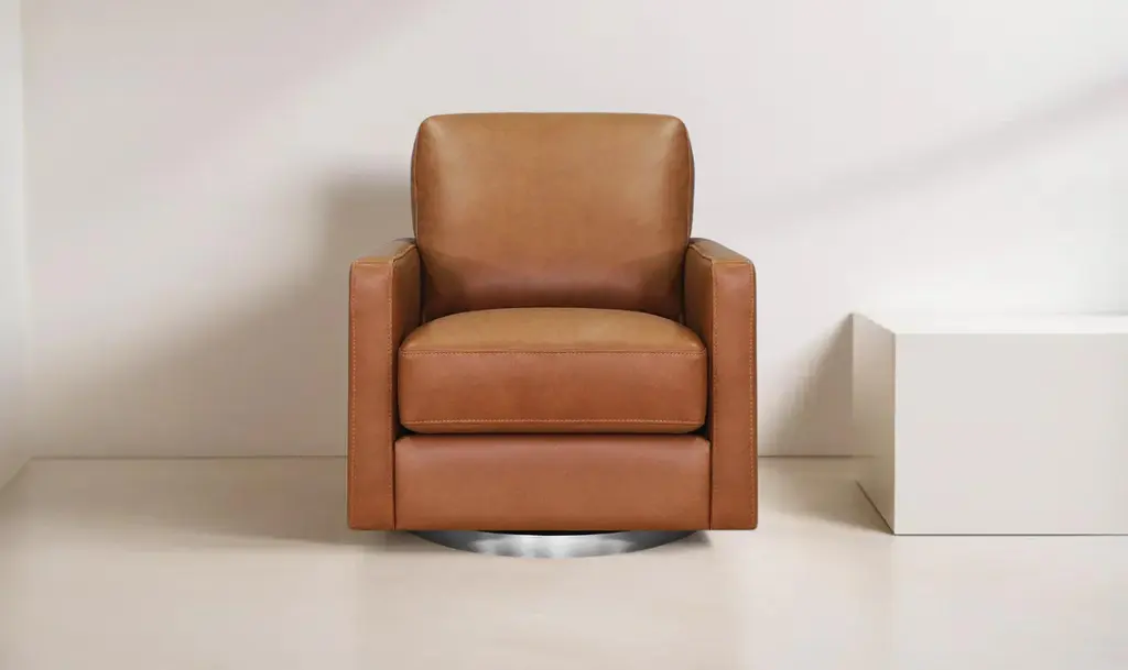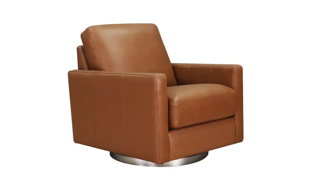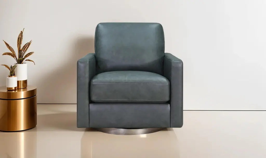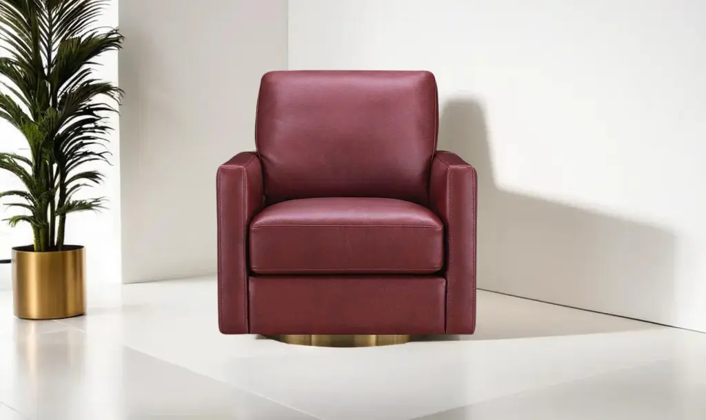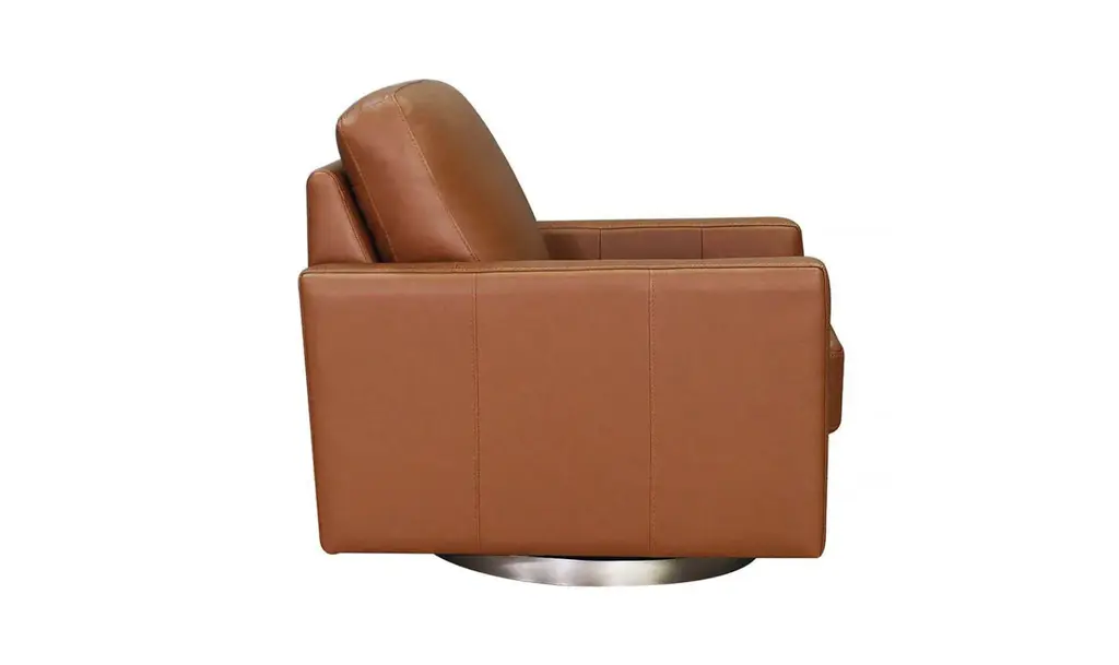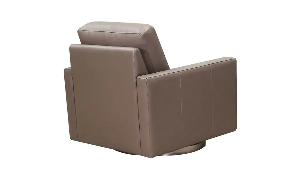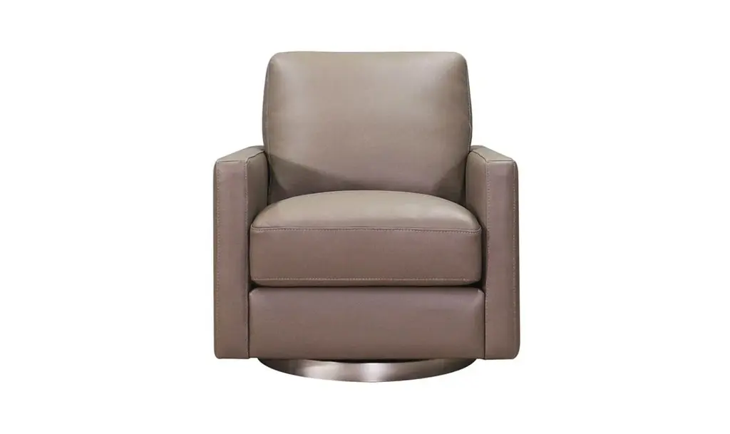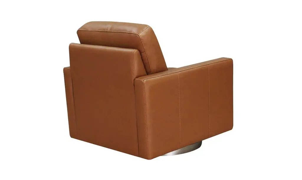 Introducing the Ashby Swivel Leather Reclining Chair, a perfect blend of contemporary style and enhanced functionality for your home. This chair features chic cushions, sleek track arms, and a newly integrated swivel base, creating a harmonious balance of modern design and practicality. The Ashby Collection epitomizes this seamless fusion, elevating the aesthetic appeal of any living space with its sophistication and versatility. Whether you're unwinding after a long day or entertaining guests, the Ashby chair offers luxurious comfort and effortless style. Crafted with quality materials and meticulous attention to detail, it ensures durability alongside its elegant appearance. Embrace modernity with the Ashby Swivel Leather Chair, an ideal choice for those seeking to enhance their home's ambiance with contemporary charm and functionality.