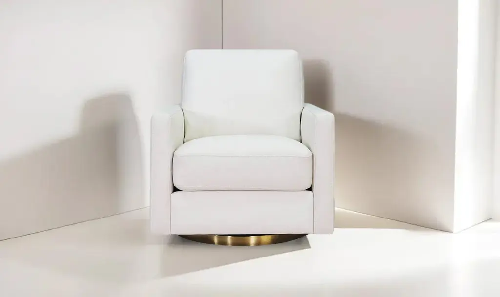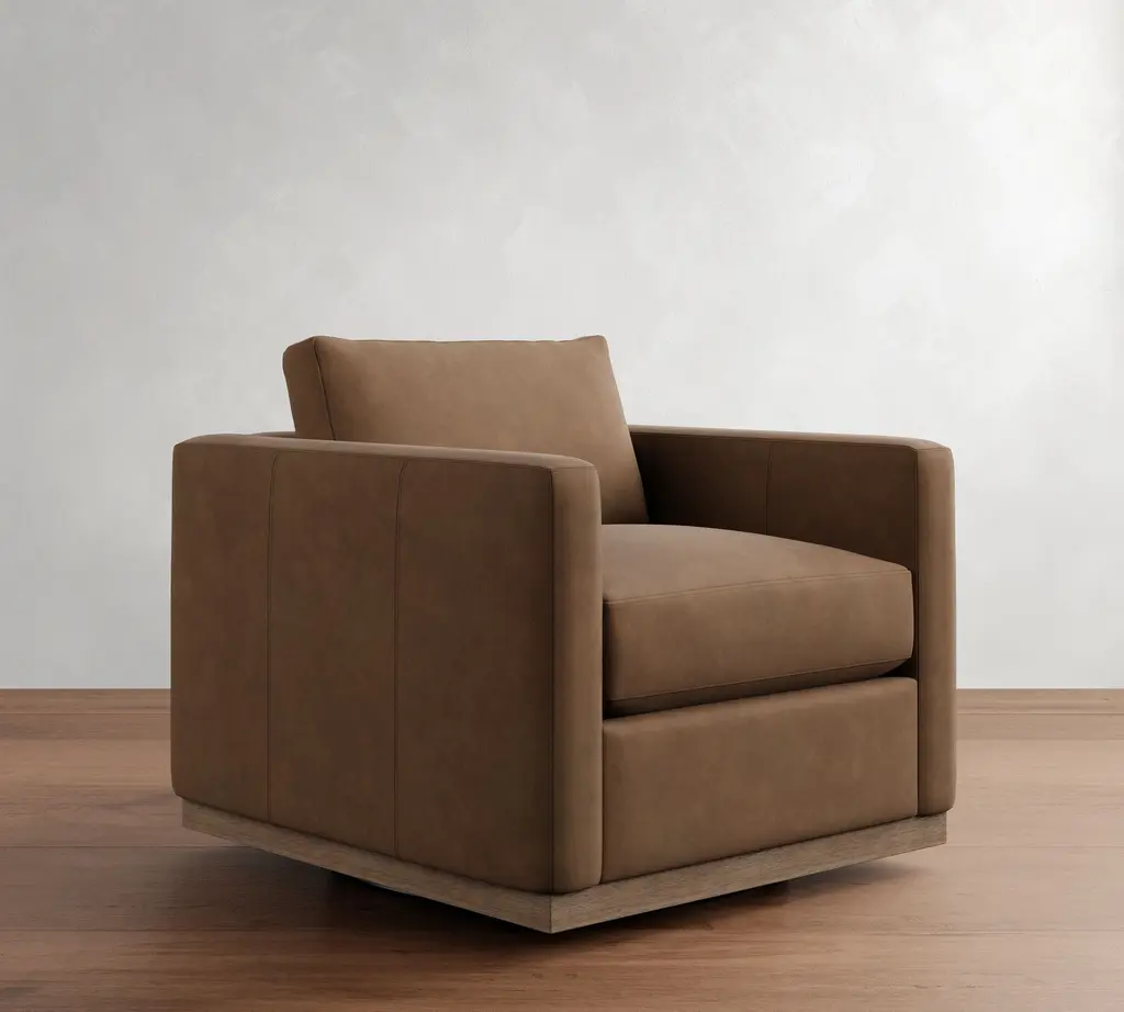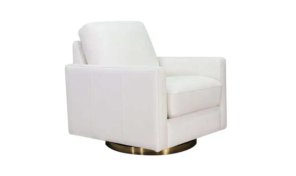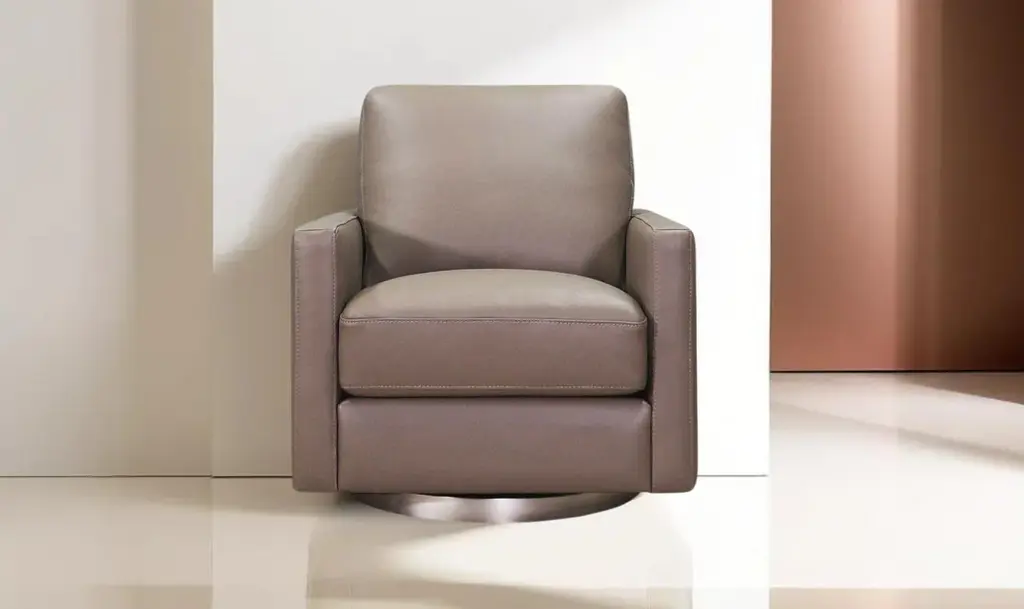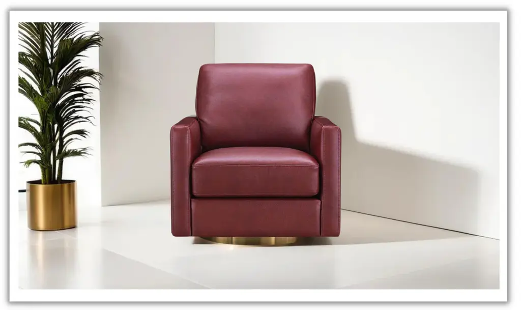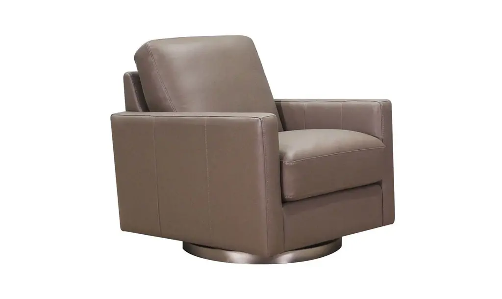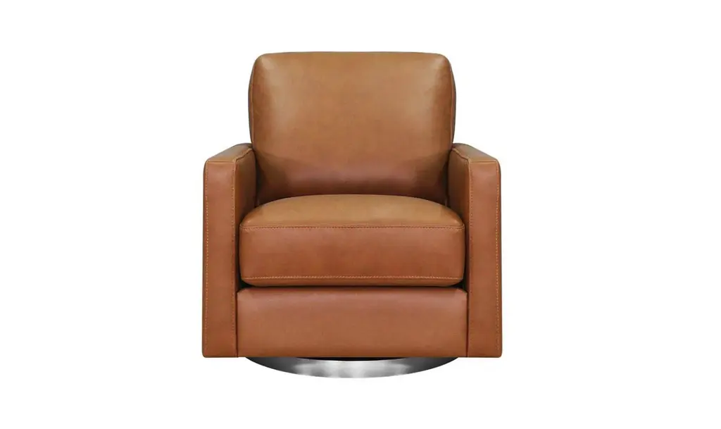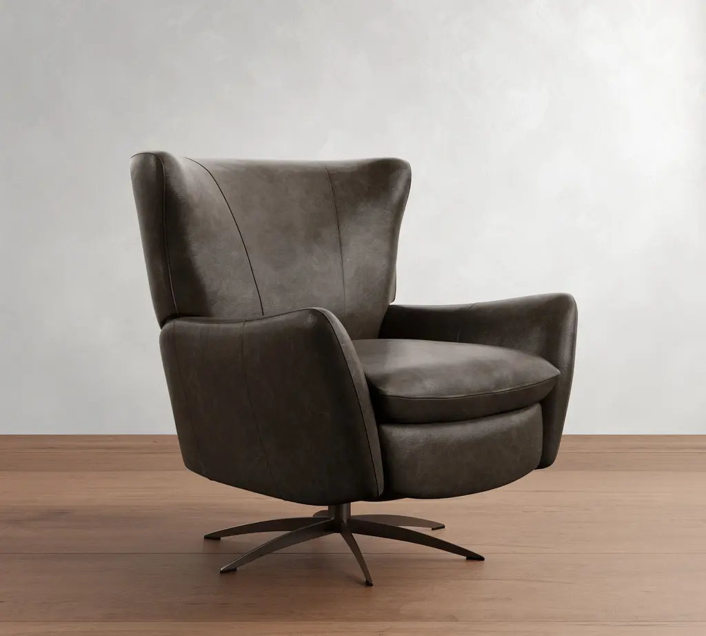 Introducing the Ashby Swivel Leather Reclining Chair, a perfect blend of contemporary style and enhanced functionality for your home. This chair features chic cushions, sleek track arms, and a newly integrated swivel base, creating a harmonious balance of modern design and practicality. The Ashby Collection epitomizes this seamless fusion, elevating the aesthetic appeal of any living space with its sophistication and versatility. Whether you're unwinding after a long day or entertaining guests, the Ashby chair offers luxurious comfort and effortless style. Crafted with quality materials and meticulous attention to detail, it ensures durability alongside its elegant appearance. Embrace modernity with the Ashby Swivel Leather Chair, an ideal choice for those seeking to enhance their home's ambiance with contemporary charm and functionality.