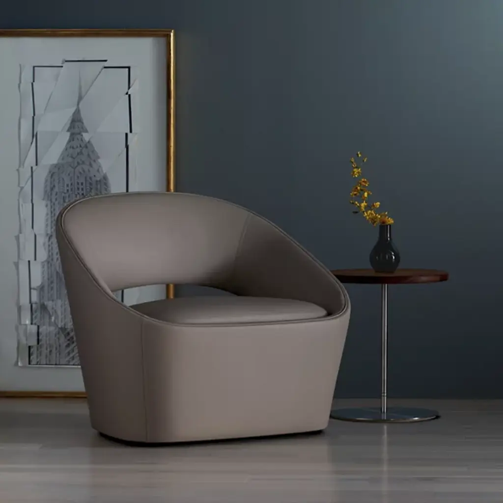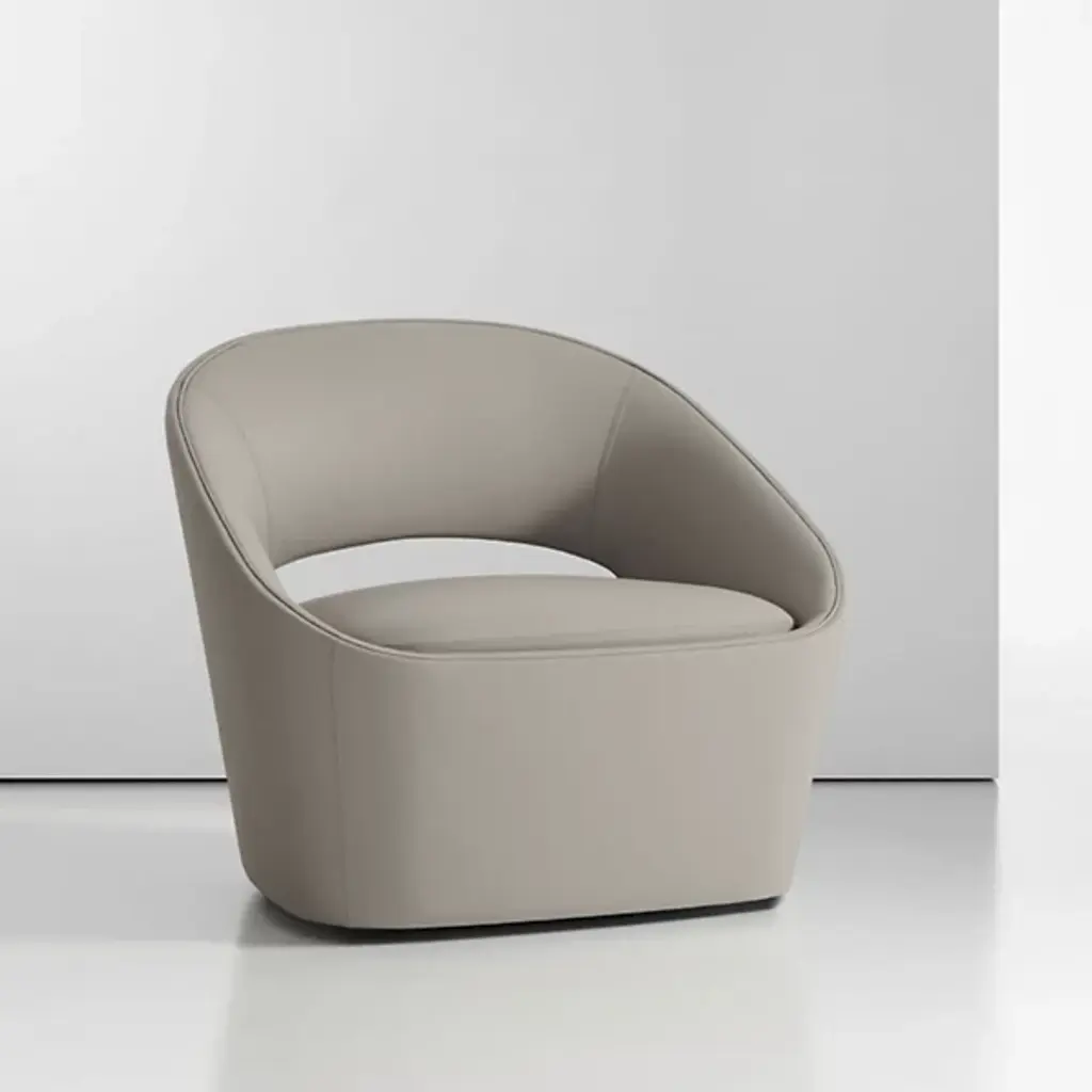 The Astra Self-Return Swivel Lounge Chair from Bernhardt Design merges geometric precision with curved forms to create what designer Cory Grosser calls "Happy Minimalism." This philosophy translates into a chair that reads as pure geometry while maintaining fluid, continuous lines throughout its profile. The concealed self-return swivel mechanism allows the piece to function smoothly without compromising its clean aesthetic. Foam and sinuous spring construction support the upholstered shell, while precise detailing at seams and edges reinforces the chair's commitment to comfort within open-plan environments.