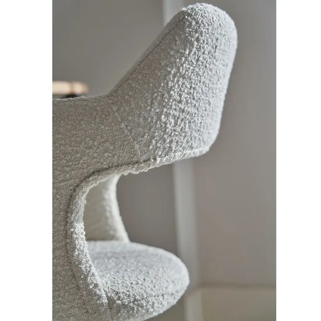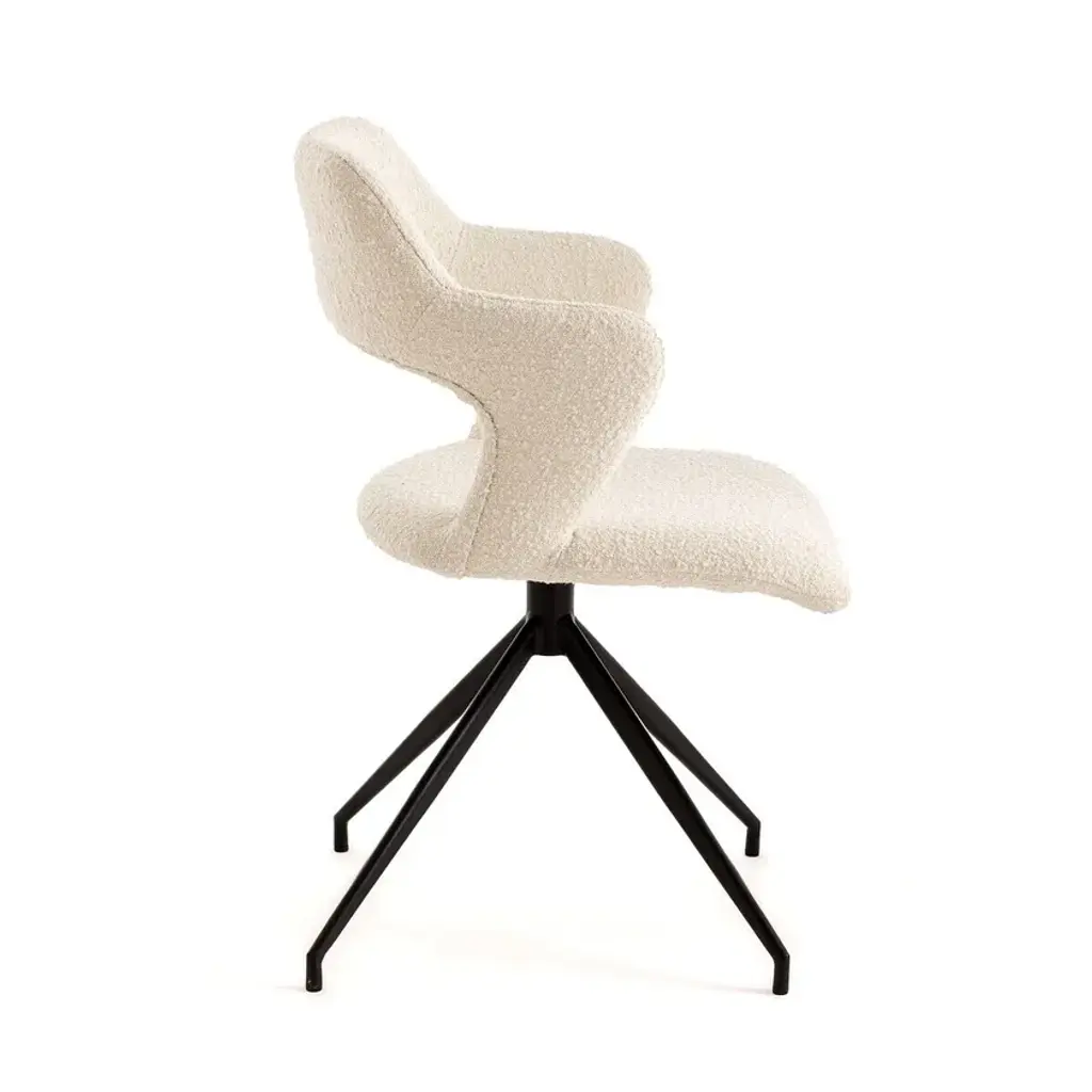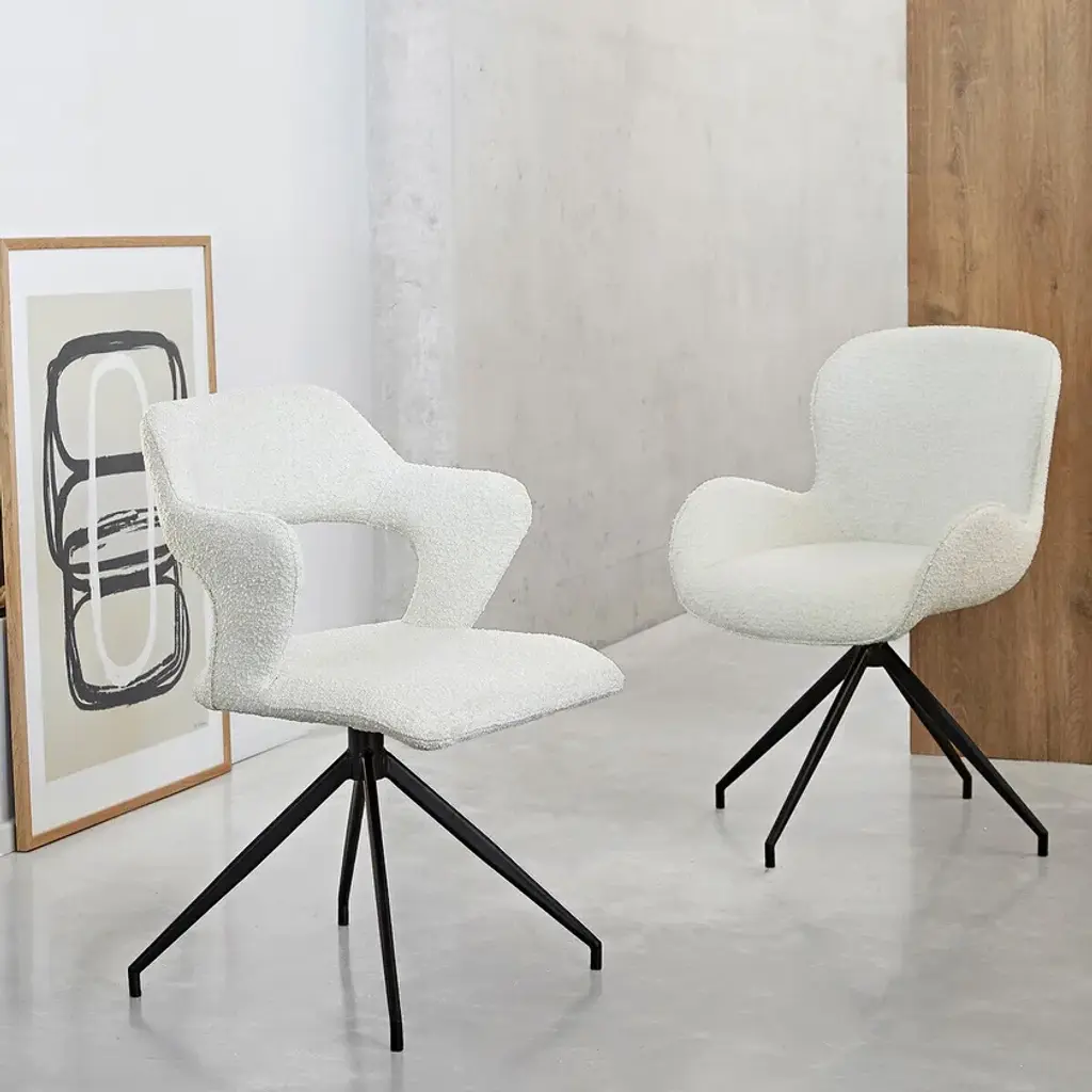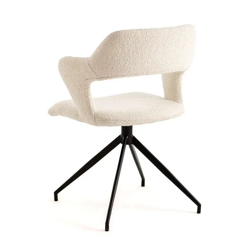 Refined bouclé upholstery, 360° swivel. Asyar combines ergonomic design with true comfort of use. It can be used as a table or office chair according to your wishes.Steel frame, HR 30 kg/m³ polyurethane foam paddingCover in bouclé 95% polyester, 5% acrylic / Textured cover 90% polyester, 7% acrylic, 3% linen / Cover 40% acrylic, 27% cotton, 18% linen, 15% polyesterPerforated backrest360° swivel seatMetal base