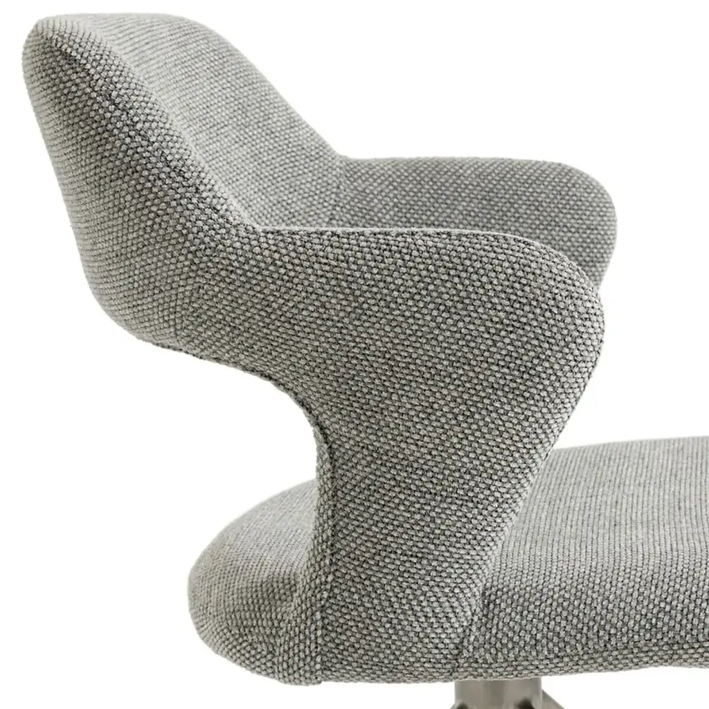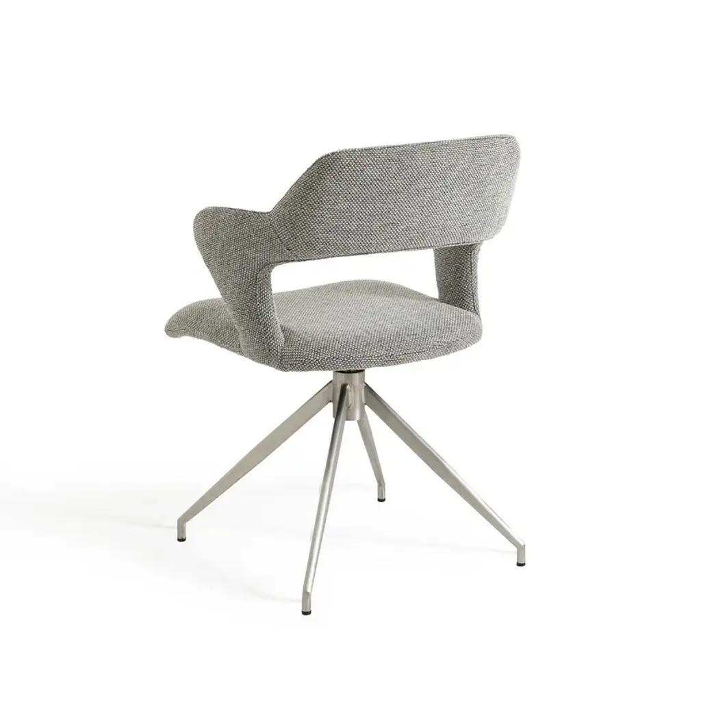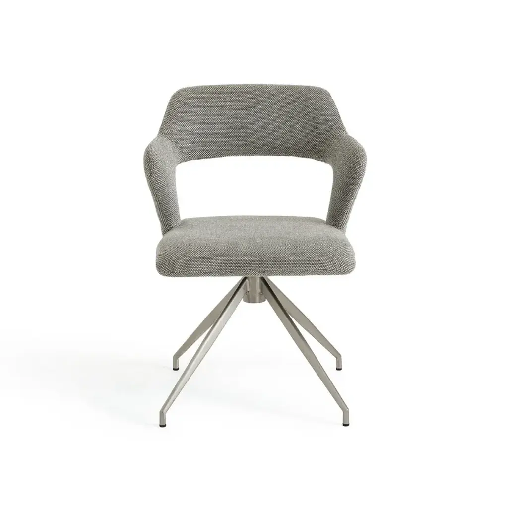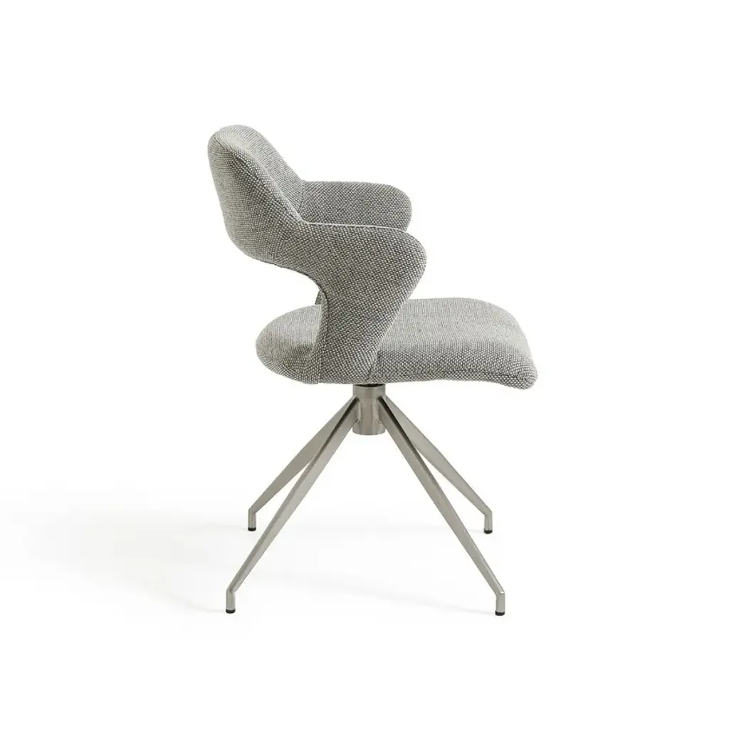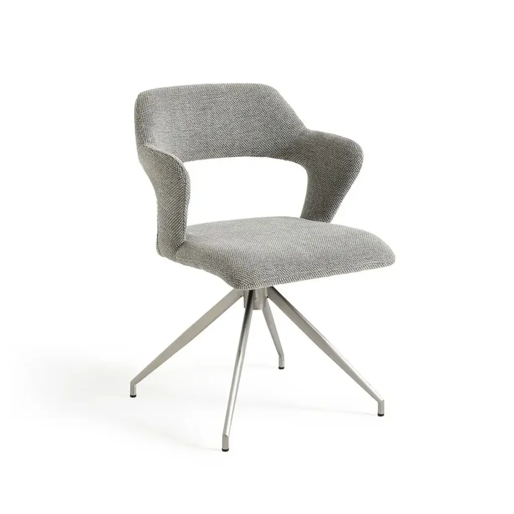 Refined bouclé upholstery, 360° swivel. Asyar combines ergonomic design with true comfort of use. It can be used as a table or office chair according to your wishes.Steel frame, HR 30 kg/m³ polyurethane foam paddingCover in bouclé 95% polyester, 5% acrylic / Textured cover 90% polyester, 7% acrylic, 3% linen / Cover 40% acrylic, 27% cotton, 18% linen, 15% polyesterPerforated backrest360° swivel seatMetal base