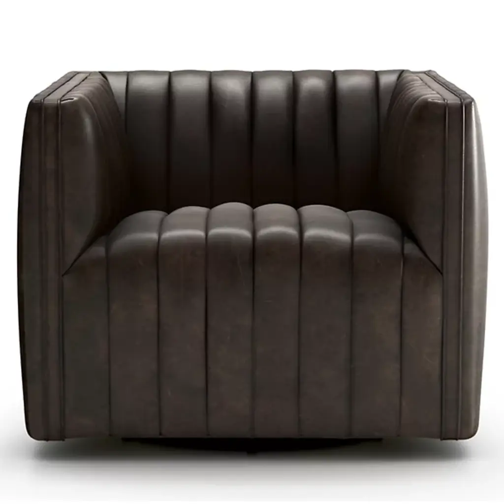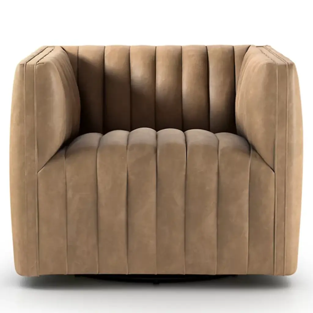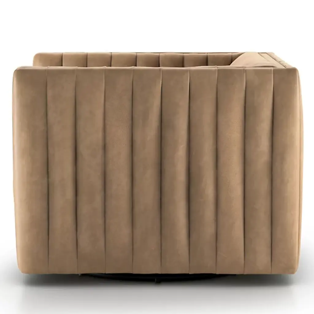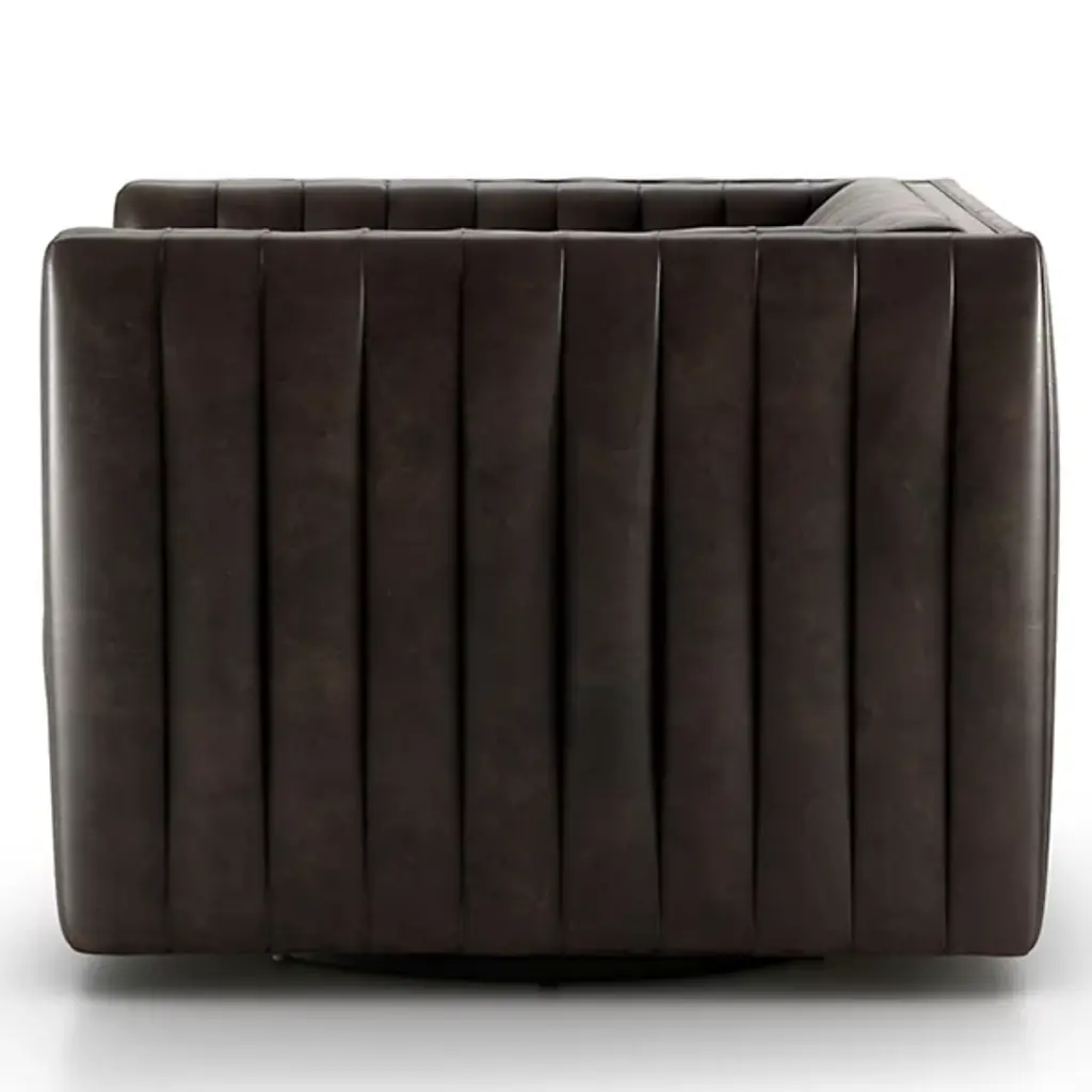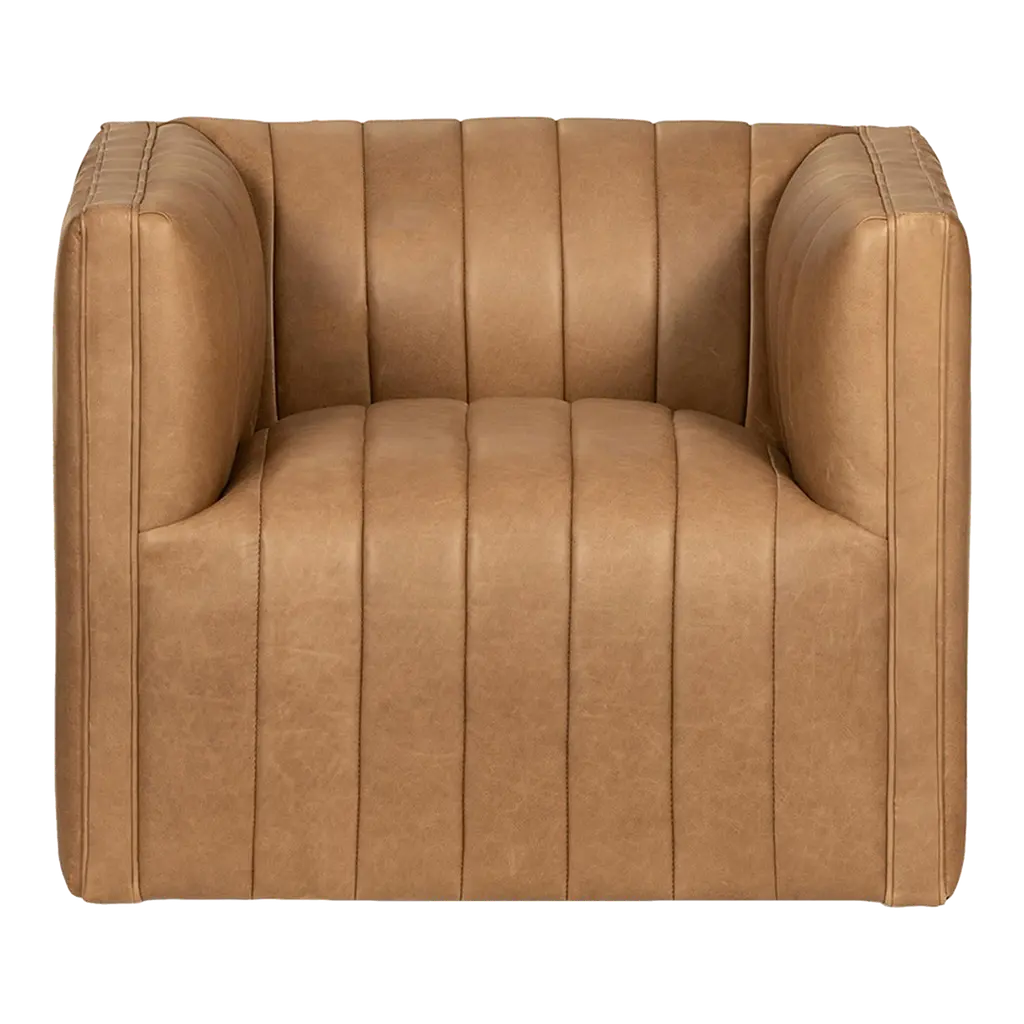The Augustine Leather Swivel Chair from Four Hands embodies refined comfort. With its linear design and compact shape, this chair is a contemporary piece that effortlessly elevates your living space. The ribbed aesthetic adds sophistication. Augustine is upholstered in top-grain leather, providing luxury and durability. The polyurethane foam and fiber fill form a comfortable and supportive seat. This chair boasts swivel capabilities so you can position yourself freely while being supported by a poplar plywood frame.